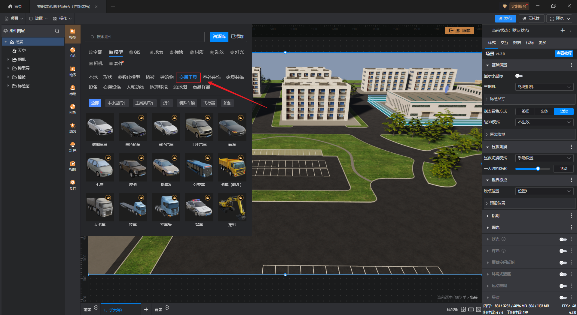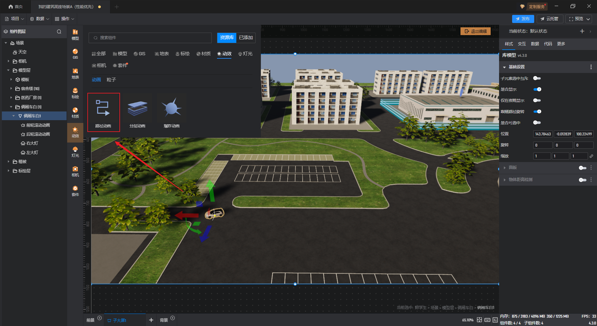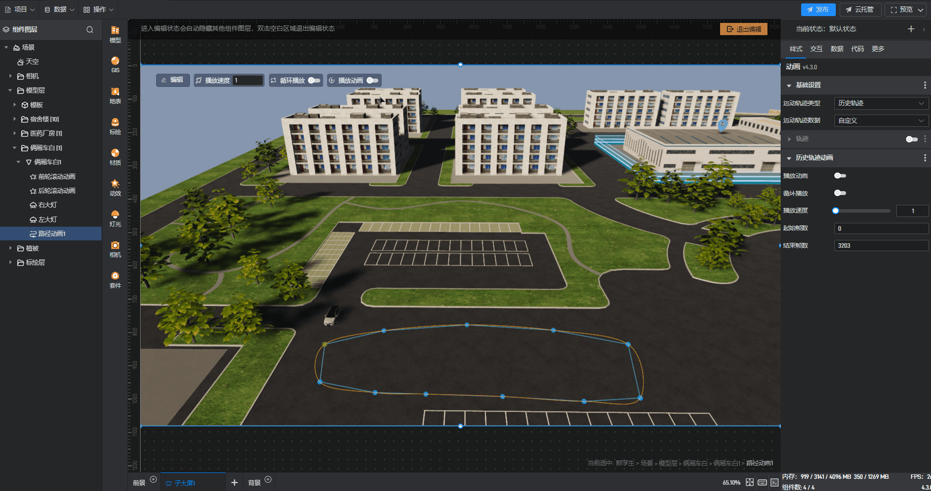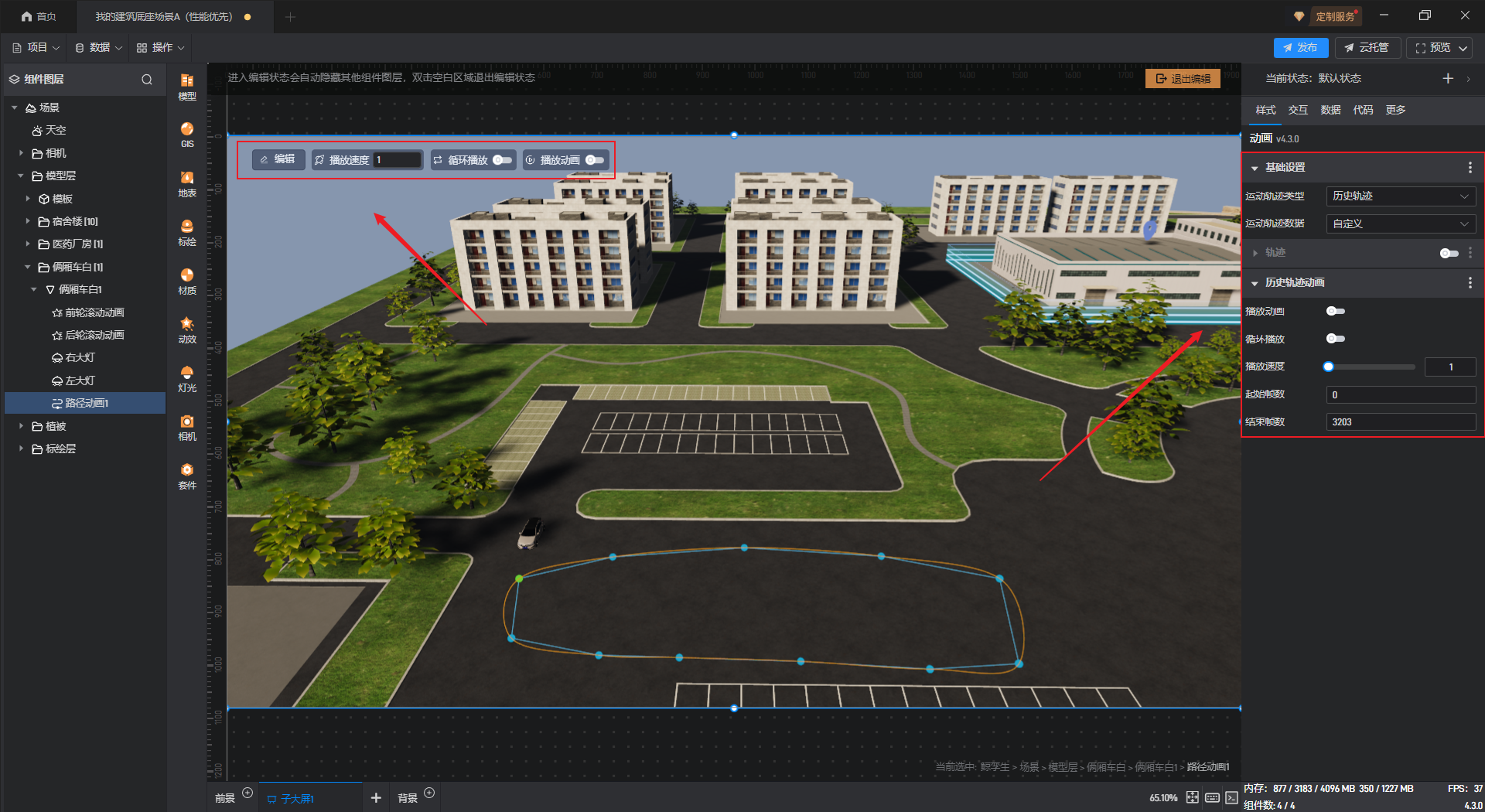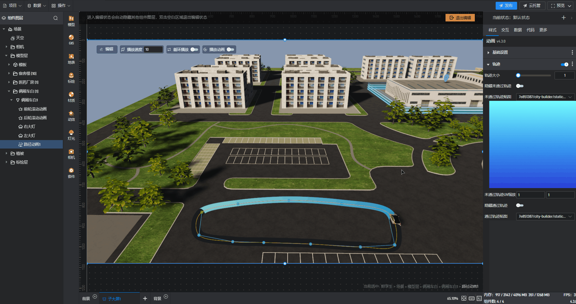 开启“播放动画”按钮后,则该汽车模型会沿着预设的路径按照“播放速度”进行移动;