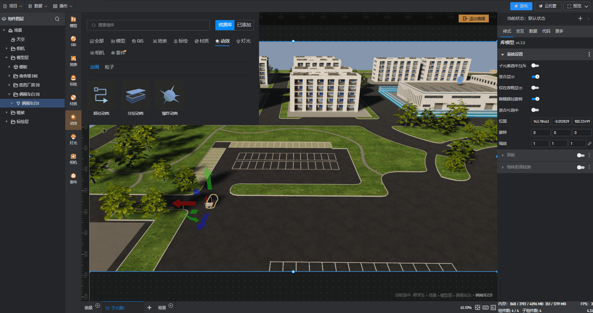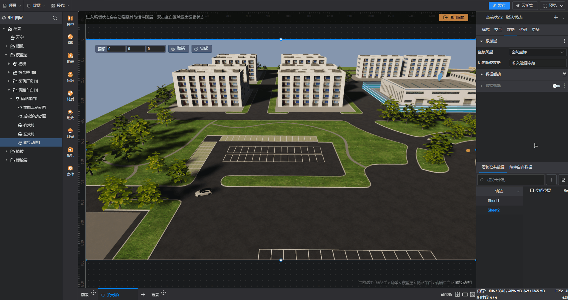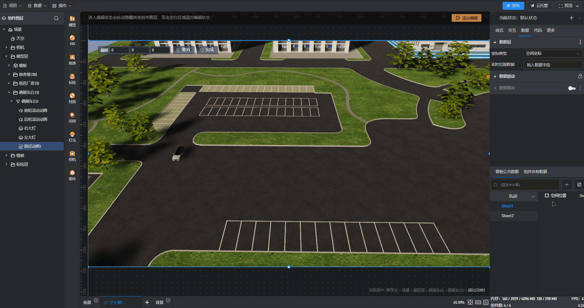 鲸孪生组件中,通过添加路径动画,不仅可以展示物体沿着指定的路径进行运动的动画效果,还可以通过数据实时展示物体位置变换轨迹。