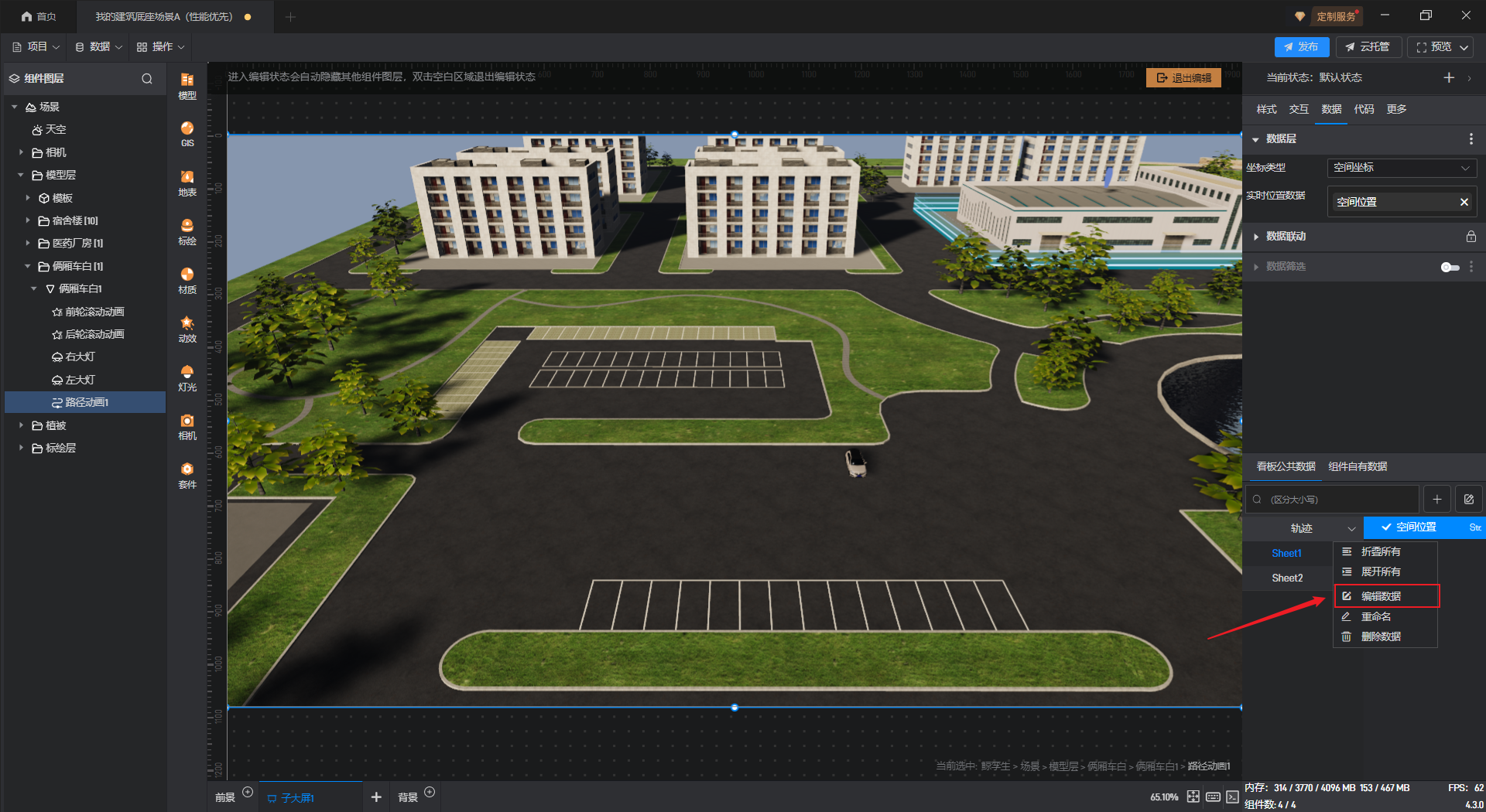 在“数据”设置页面,将坐标类型切换为“空间坐标”后勾选对应的数据字段,就可以看到场景中根据数据字段生成了一个路径轨迹。