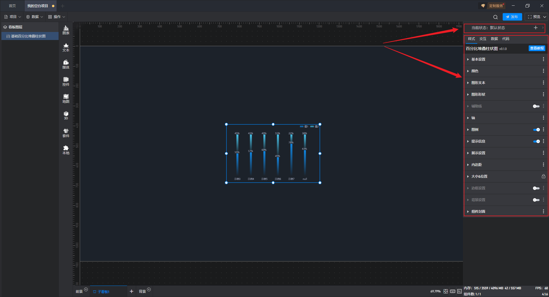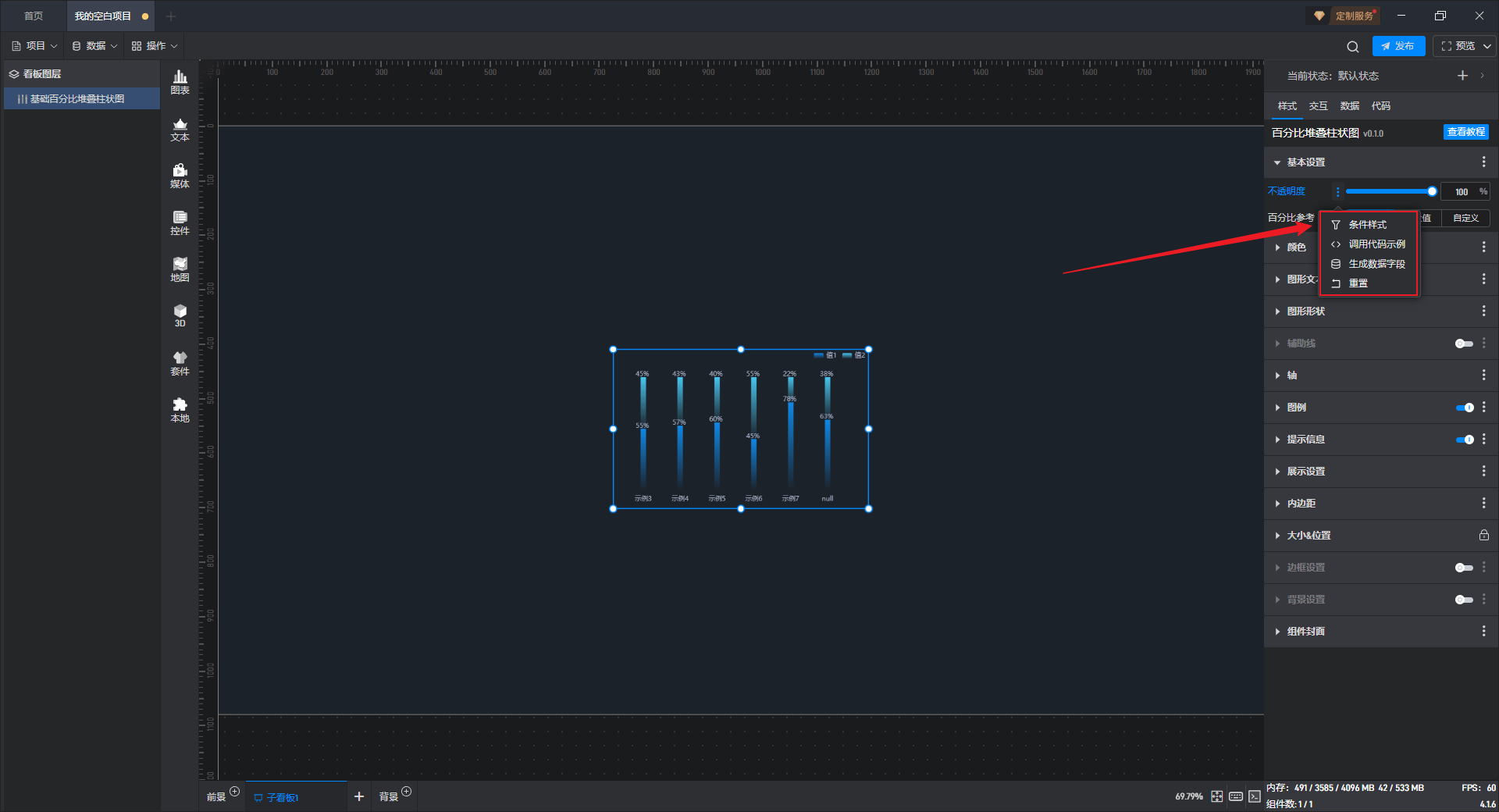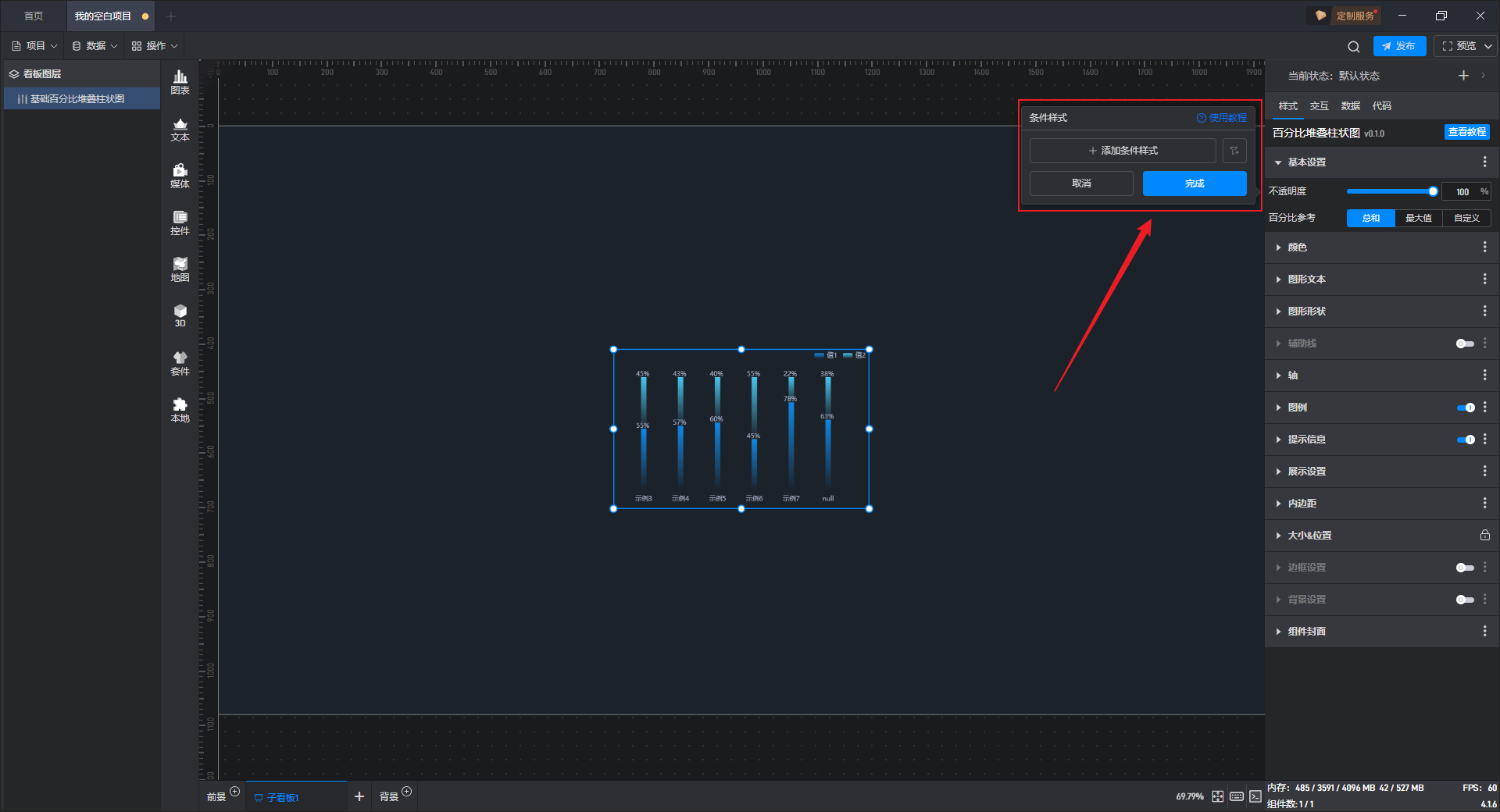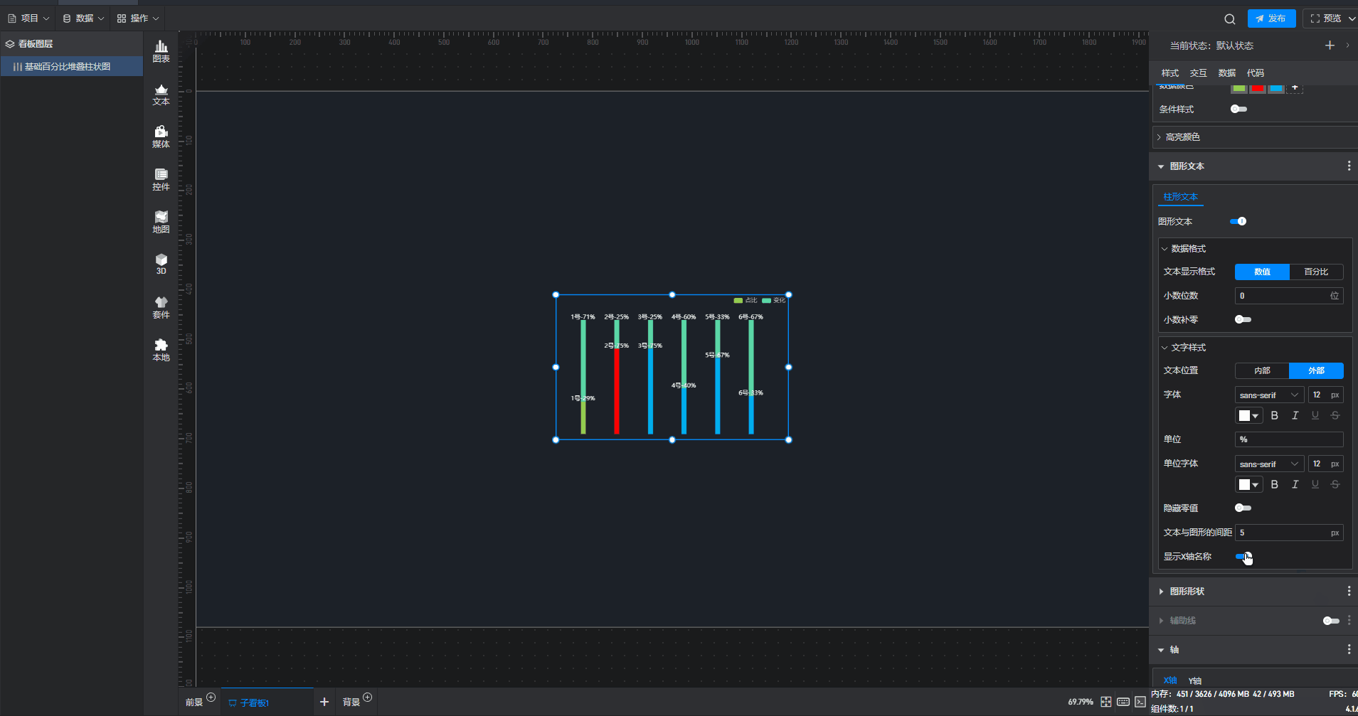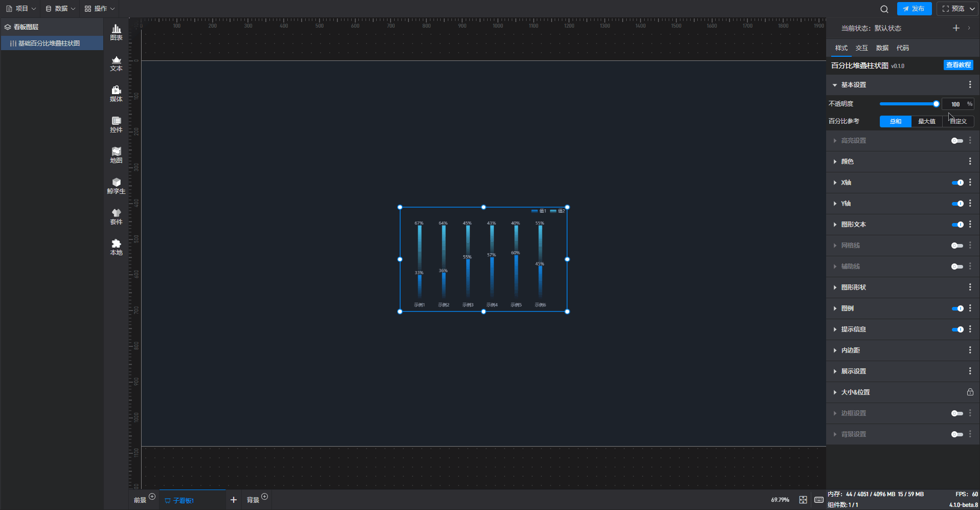 基础百分比堆叠柱状图本质是堆叠柱状图的一种预设样式,包含了柱状图组件所有的功能。