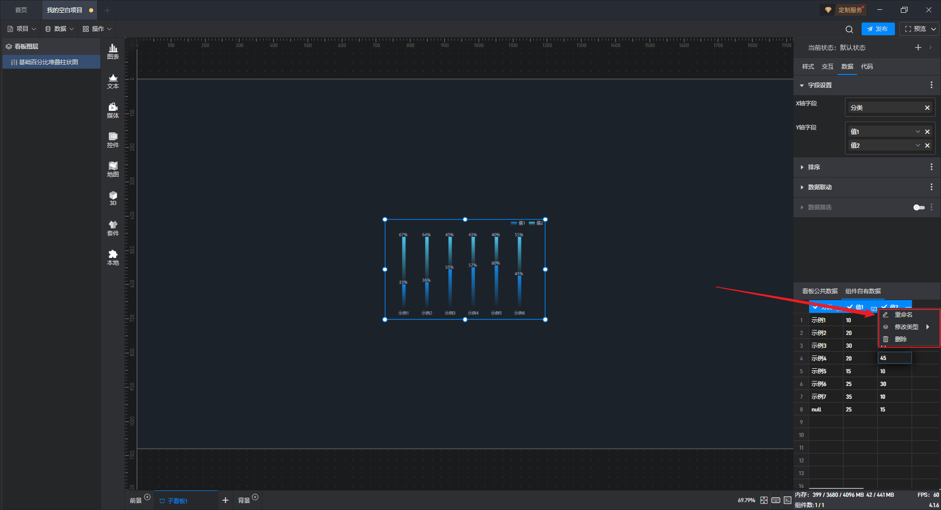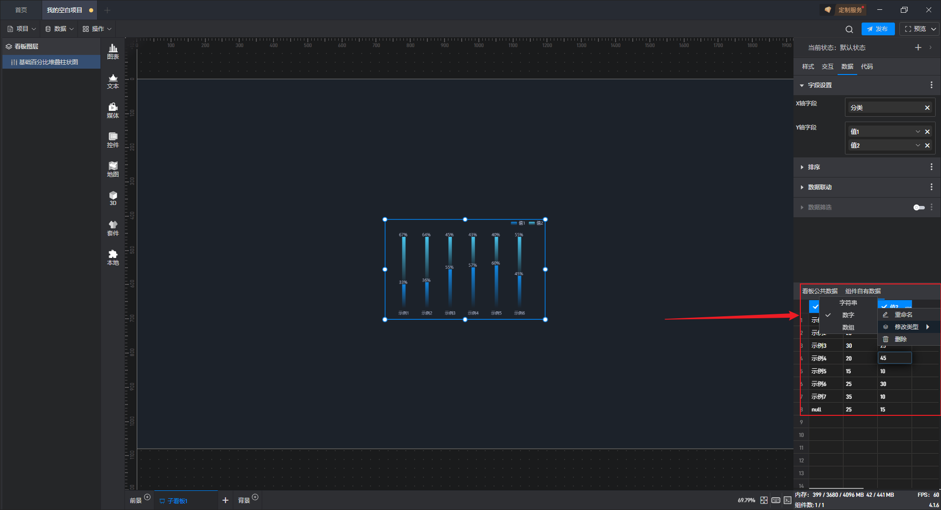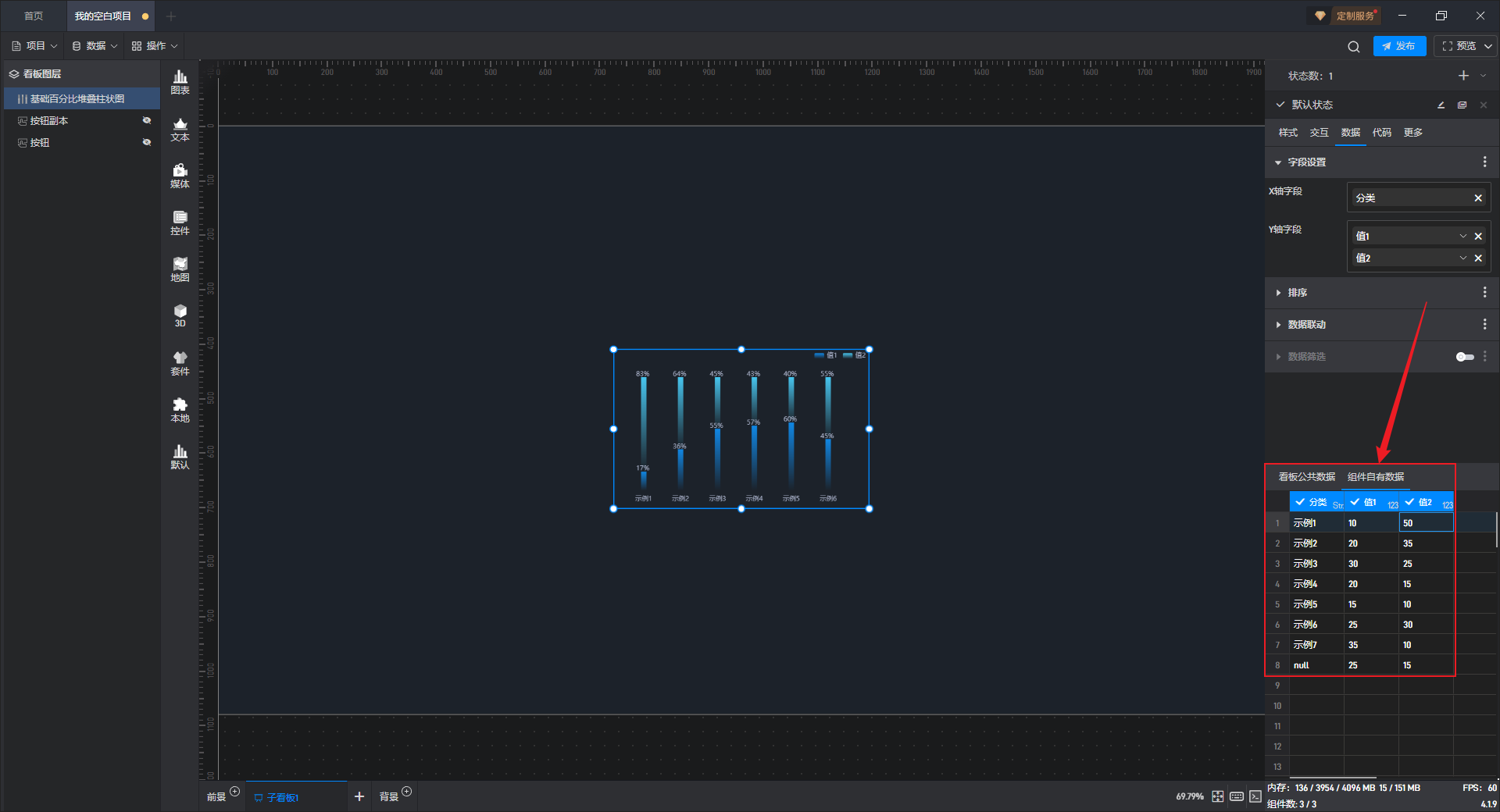 在“数据”设置界面下方可以直接修改数据,组件中的数据也会实时更新。