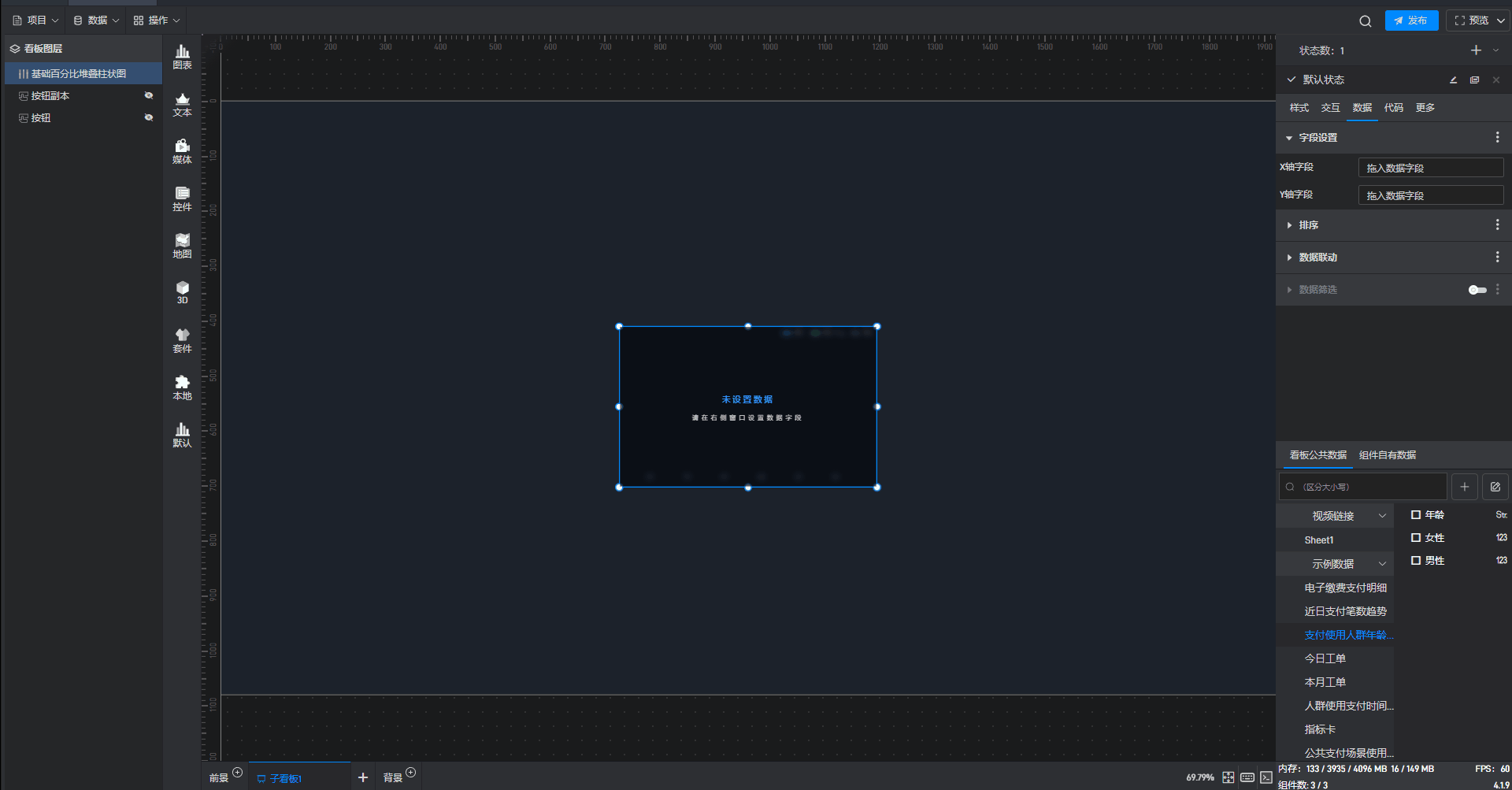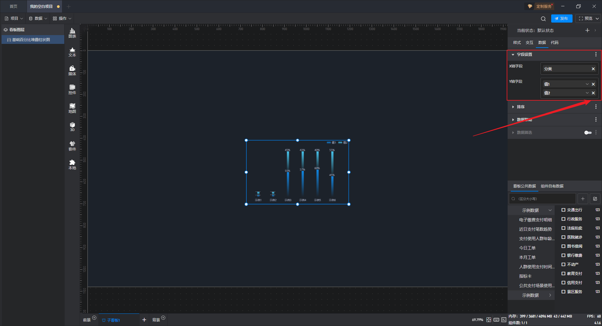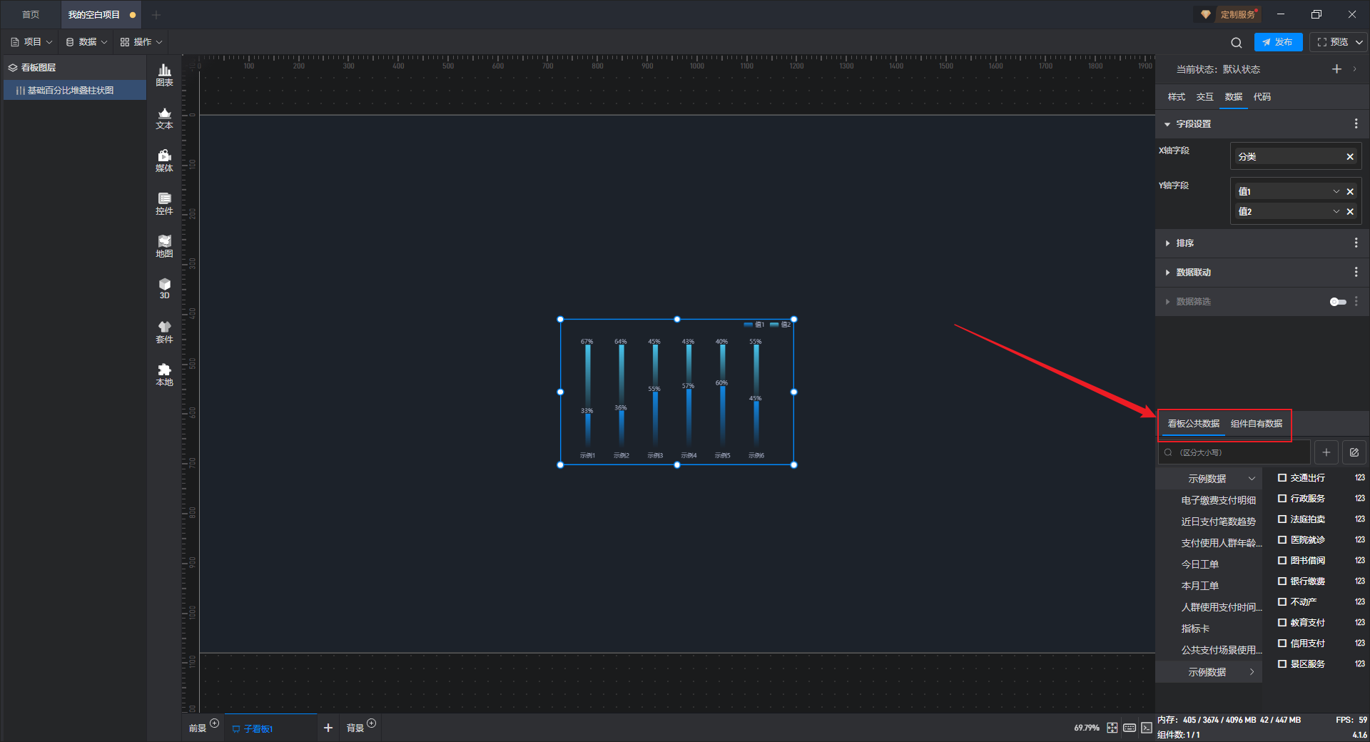 点击选中组件,在右侧“数据”设置窗口中切换到“看板公共数据”(同一个项目中所有数据源是共享的)。