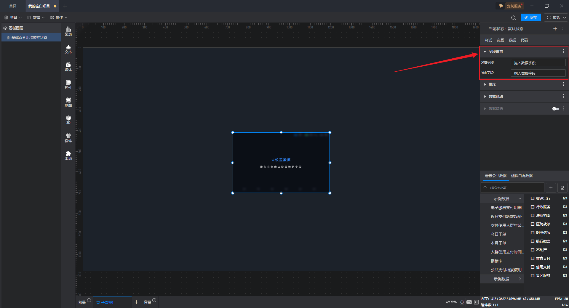 删除当前字段后,右侧字段栏为空,同时组件会提示“未设置数据”。
