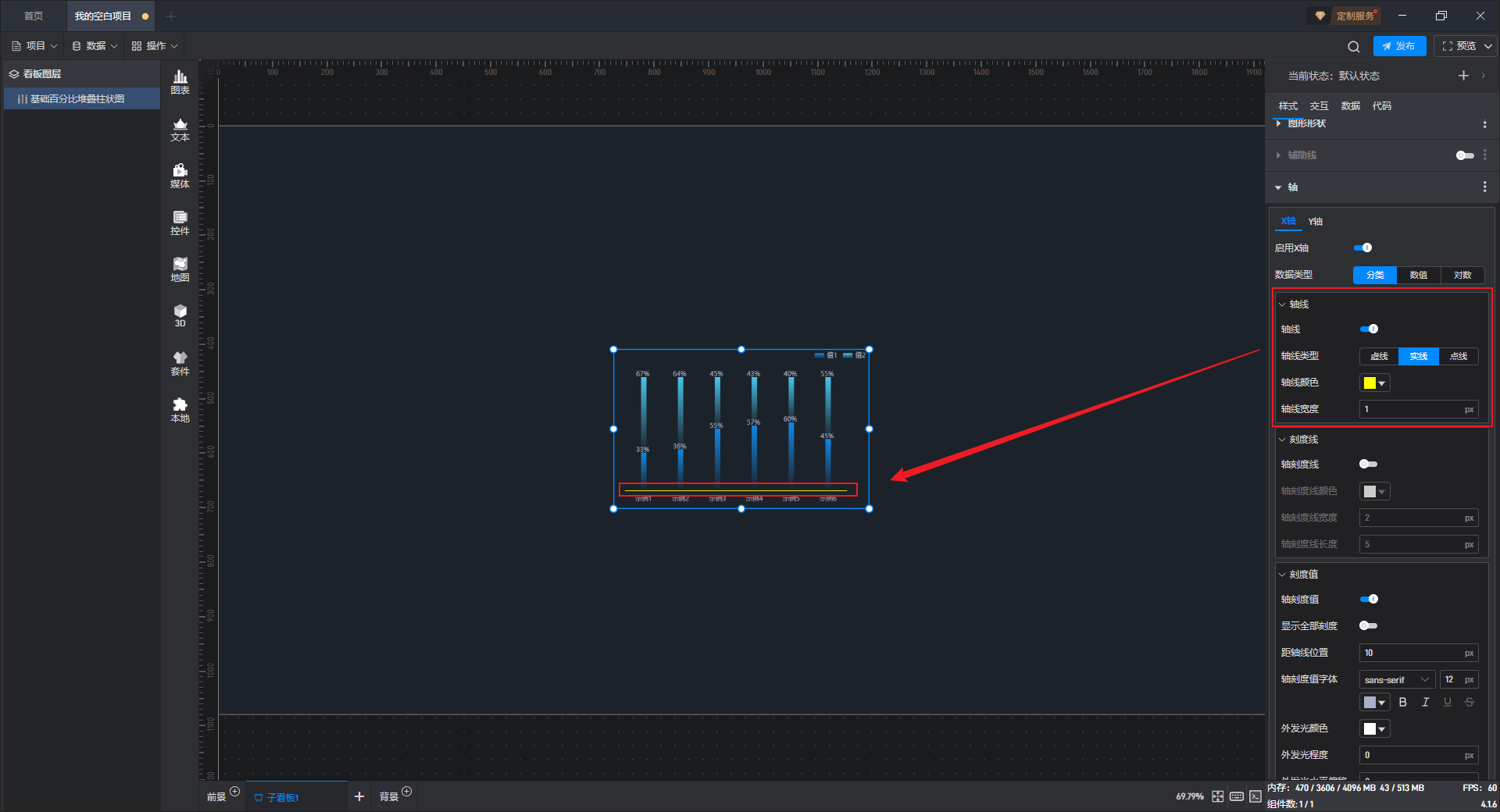 启用 X 轴后,X 轴的样式才会显示在组件中。
