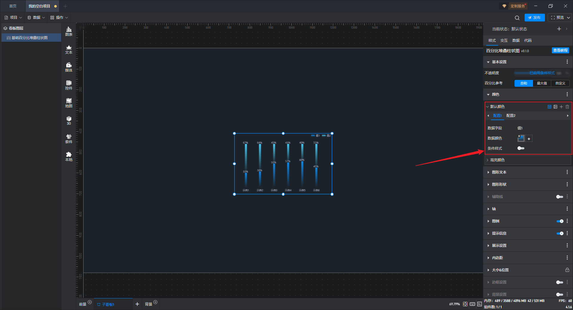 比较常用的一个设置就是根据数据条件来改变组件的颜色,这里我们就以“颜色”设置为例: