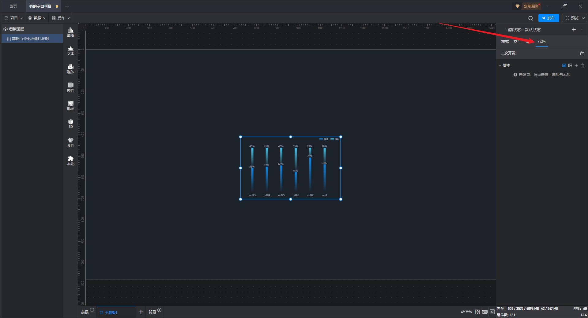 点击选中组件,在右侧“代码”设置窗口中可以对组件进行二次开发设置。