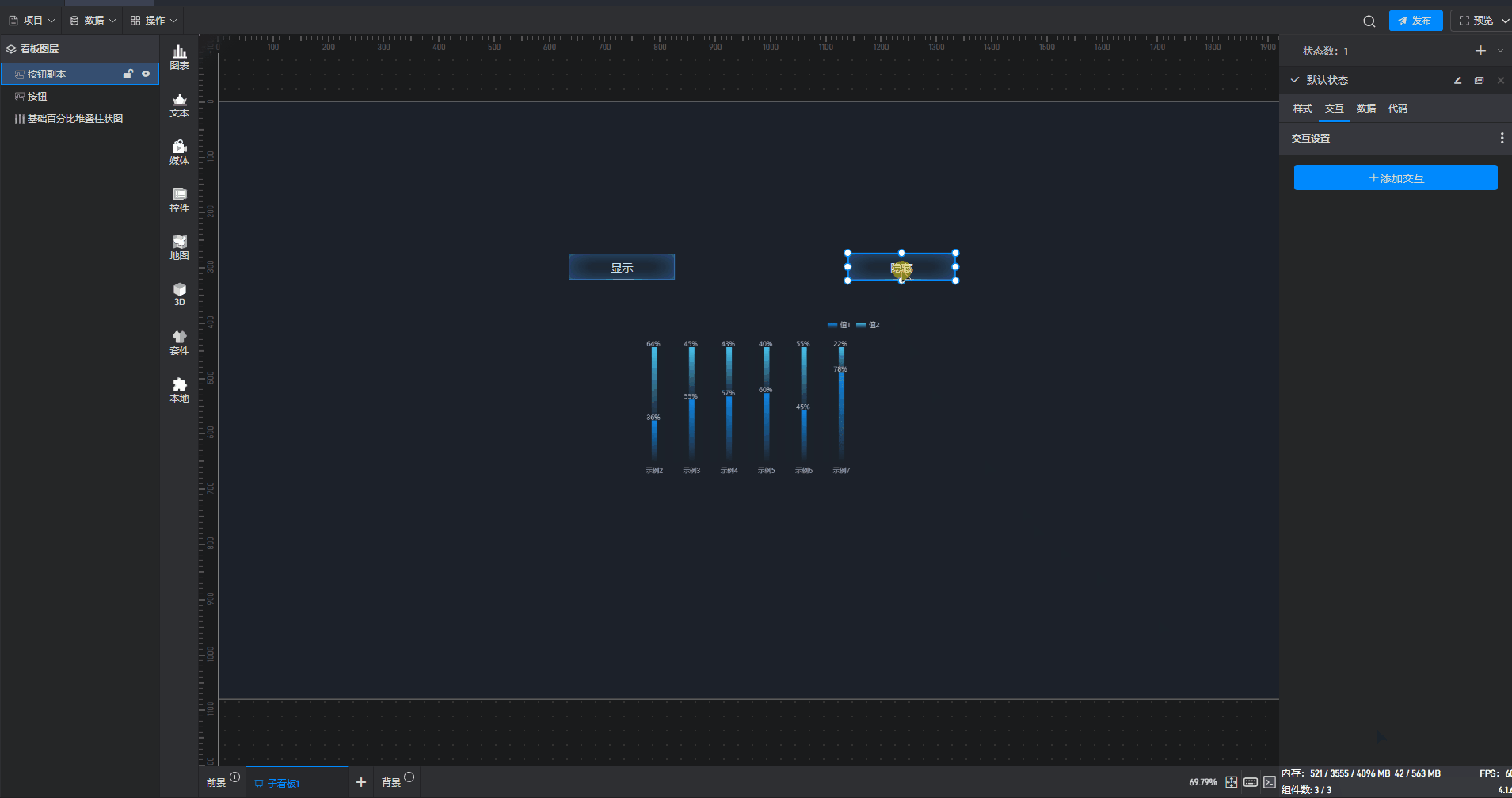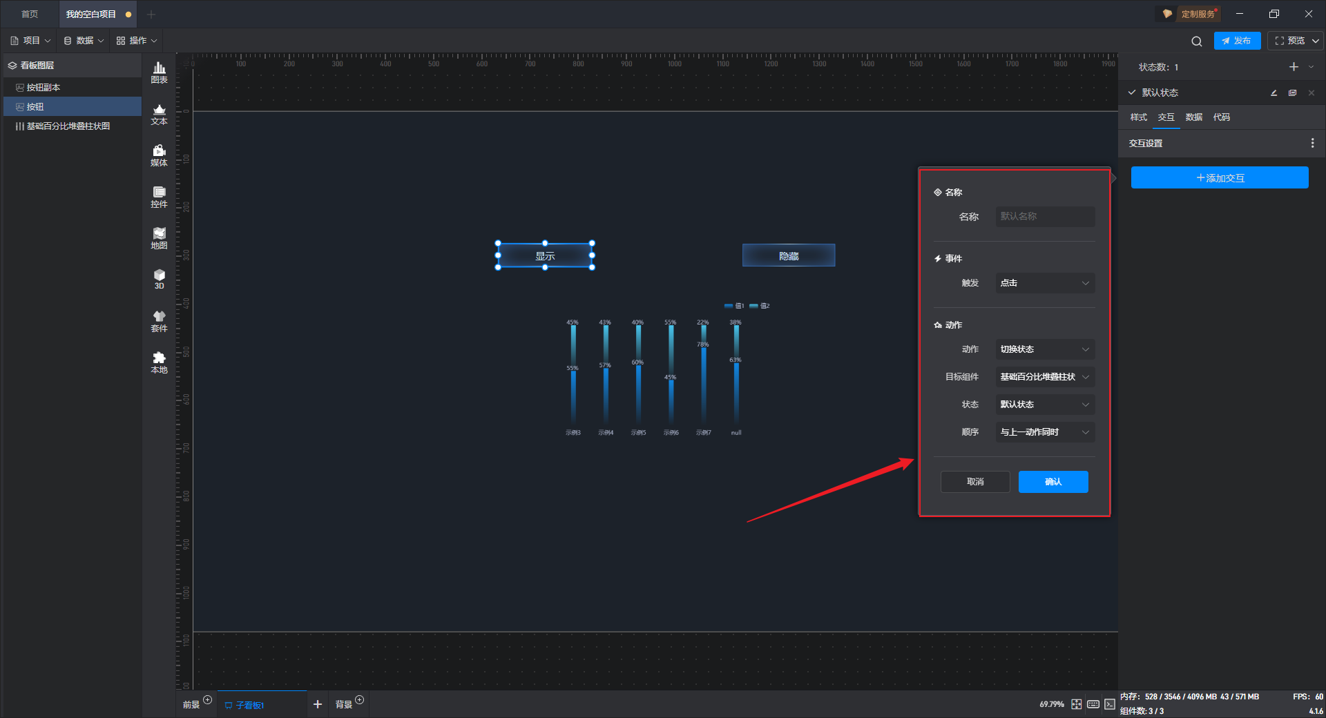 给隐藏按钮组件添加一个交互,点击后切换柱形图组件到隐藏状态。