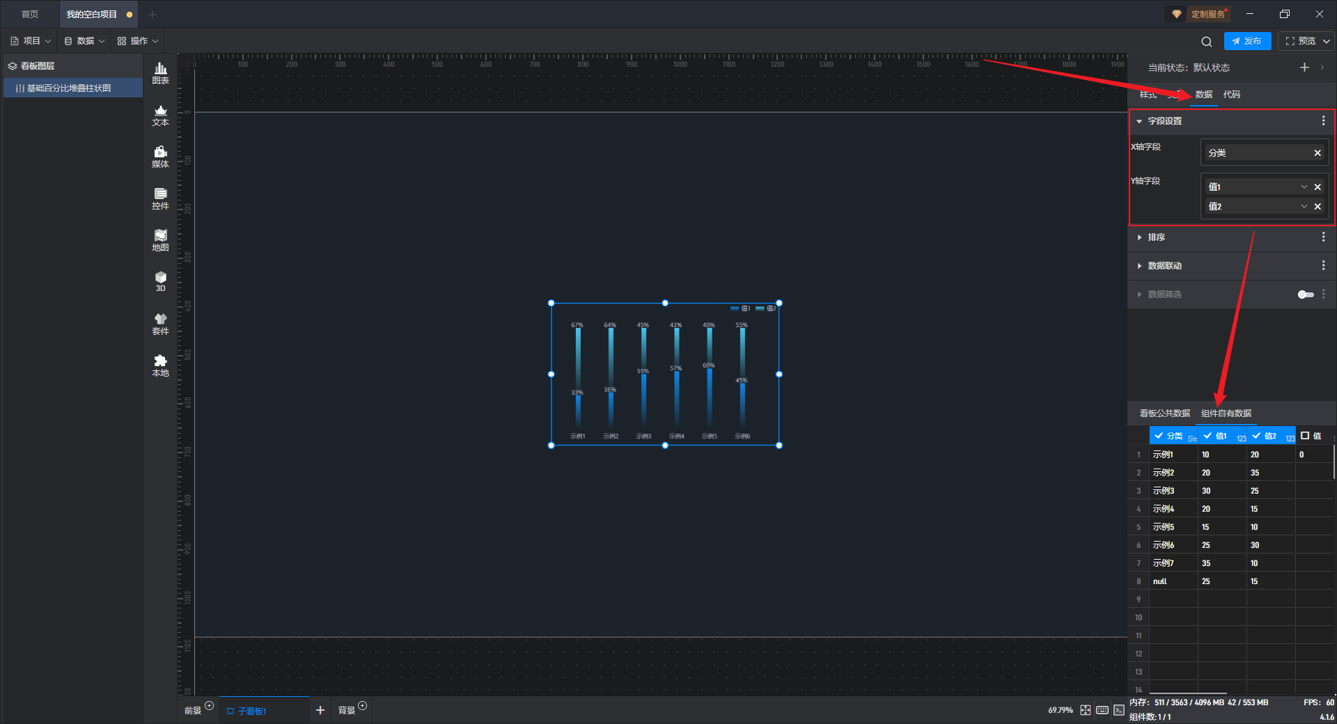 单击选中组件,在右侧“数据”设置窗口中,可以看到组件已经设置好了数据字段,且数据字段来自于“组件自有数据”。