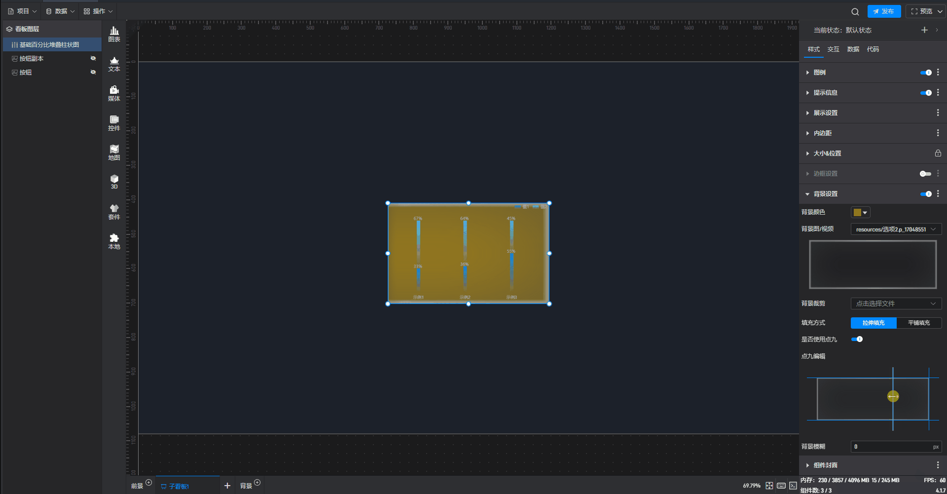 | 背景图/视频 | 可在此处添加本地图片或视频,充当组件背景。 |