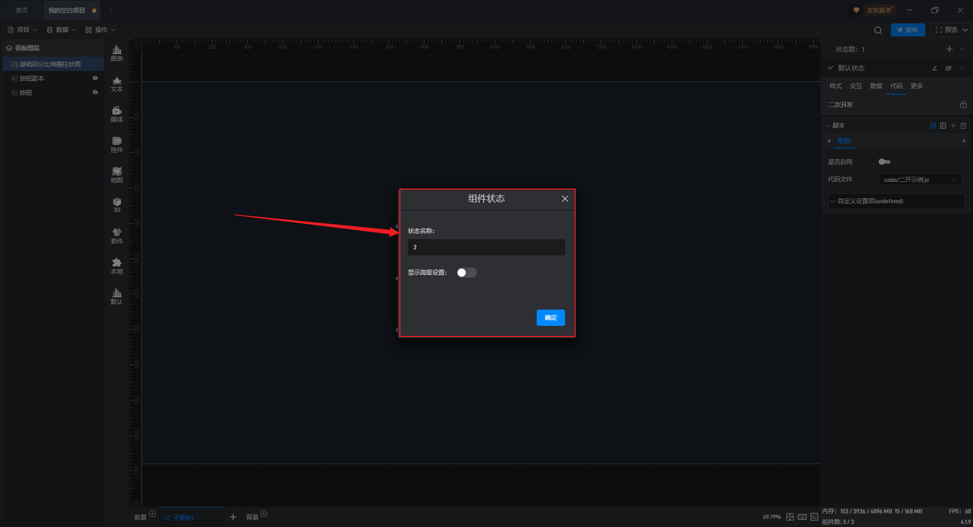 多状态主要用于通过数据条件或是点击交互(通常是点击其他组件来触发本组件的状态切换)来切换组件设置项的场景,这里的设置项包括组件的样式、交互、数据和代码。