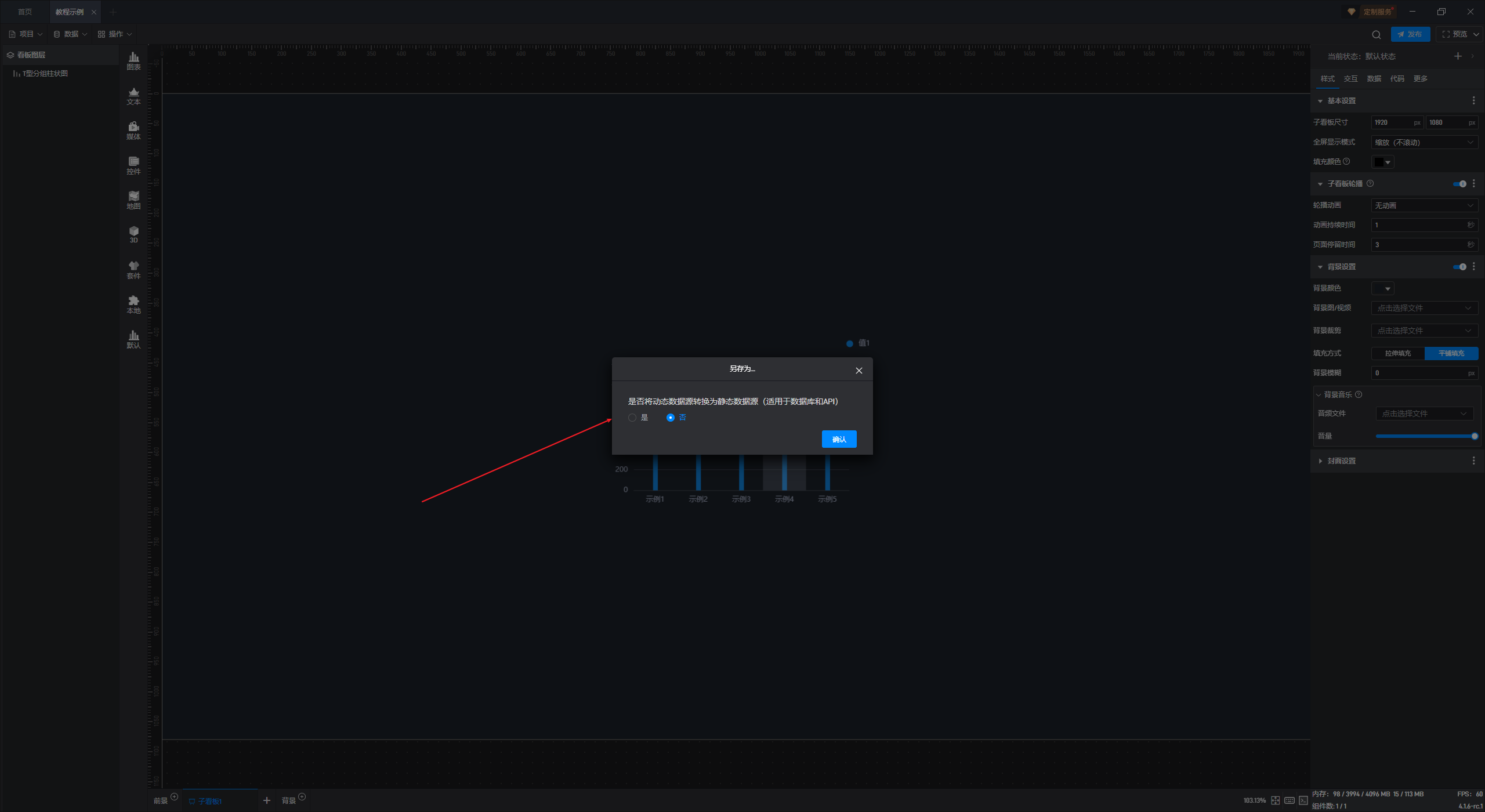 此时我们可以在保存项目文件时勾选这个功能,系统自动会将动态数据源前 100 条数据转为静态 JSON 数据,从而确保接收方可以正常打开项目。