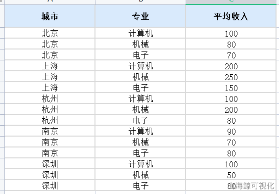 数据内容如下,将“城市”设为 X 轴字段,“专业”设为系列字段,“平均收入”设为 Y 轴字段: