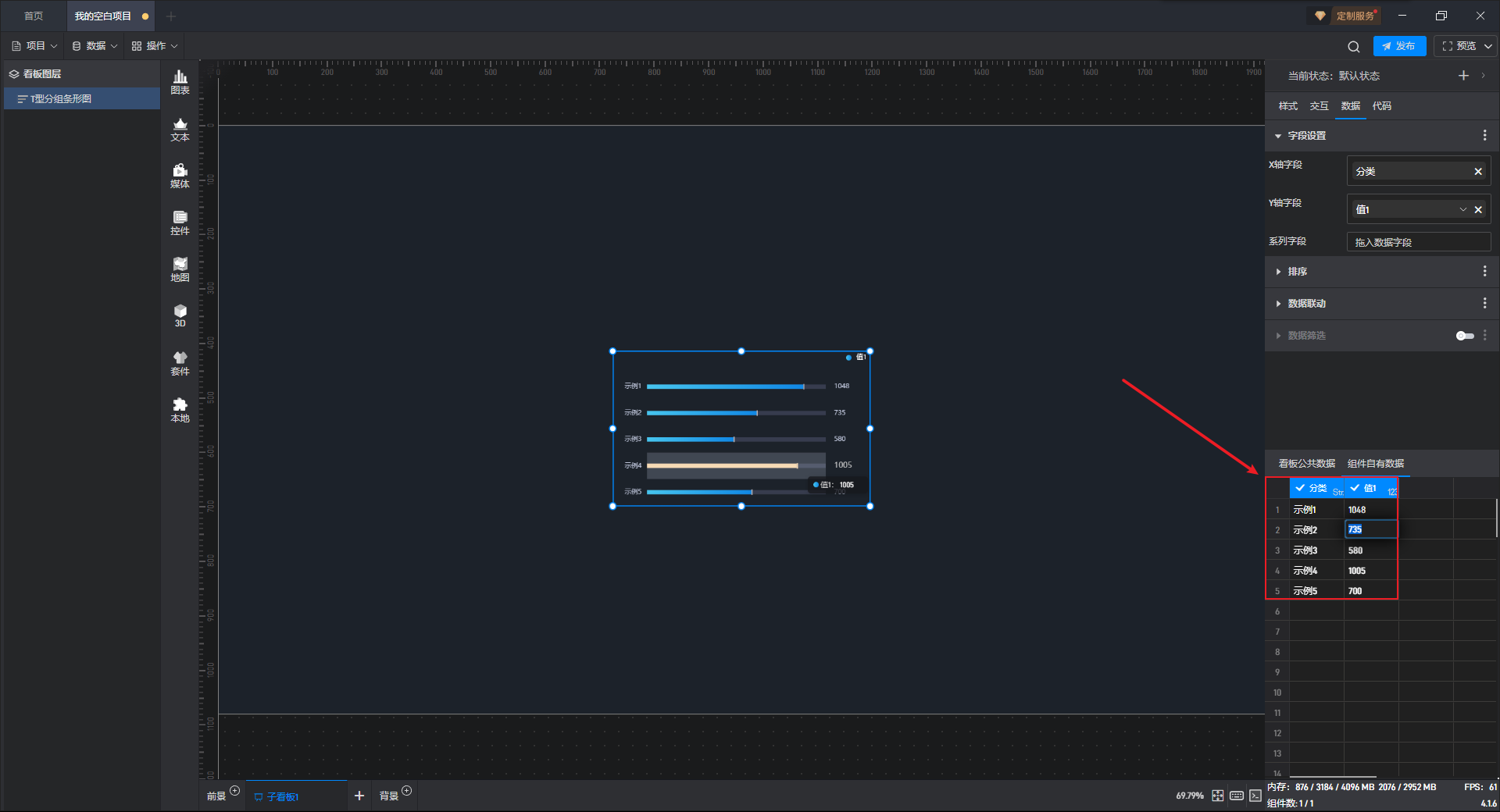 在“数据”设置界面下方可以直接修改数据,组件中的数据也会实时更新。