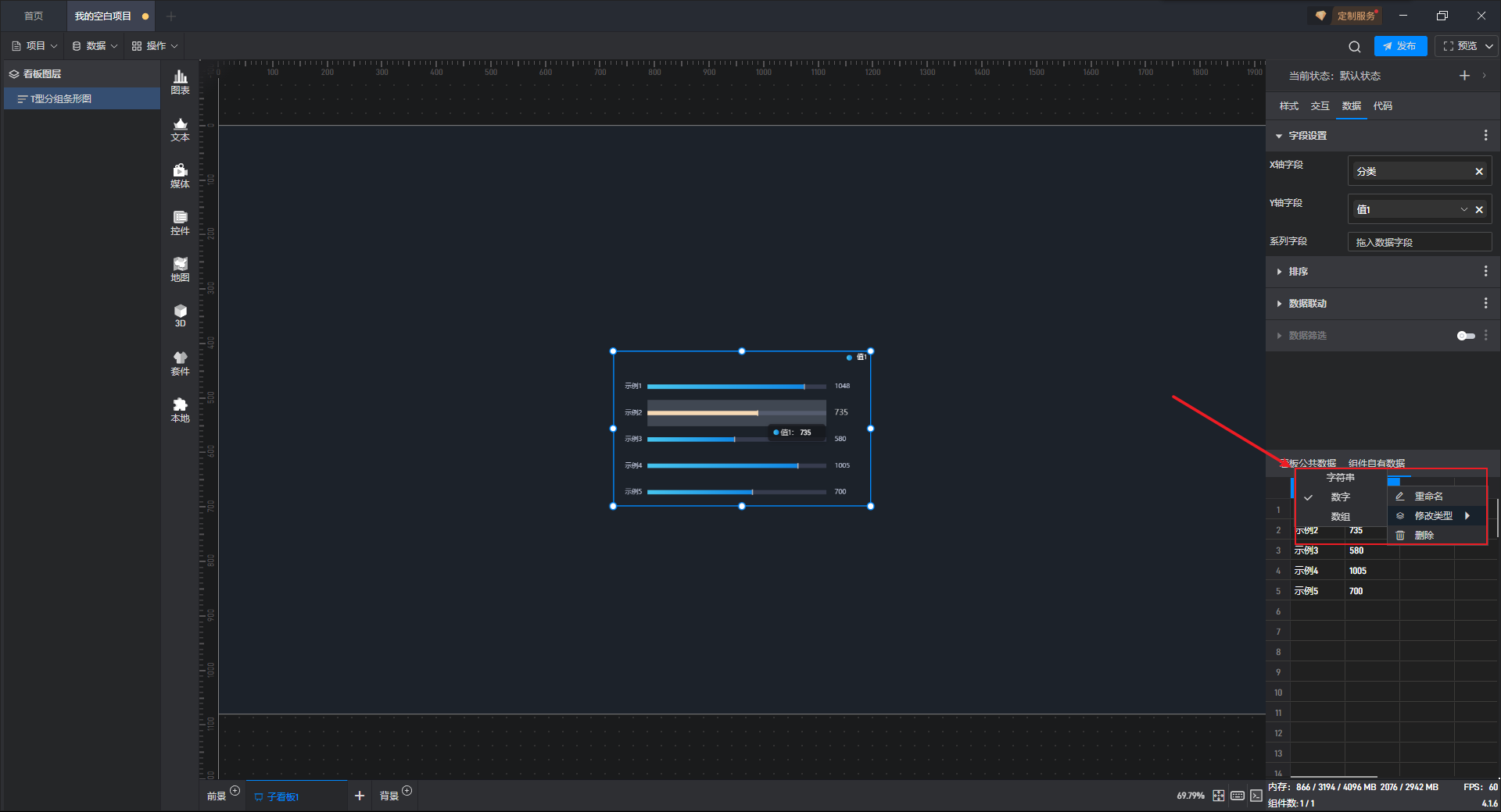 字段类型包括:字符串、数字和数组(X 轴字段和系列字段都是字符串类型,Y 轴是数字类型,数组类型用于词云组件),只有在字段类型正确的情况下,组件内容才能正常显示。