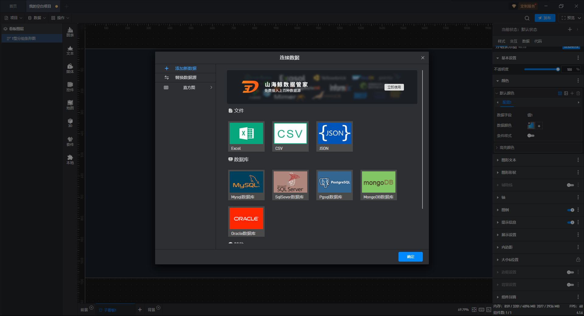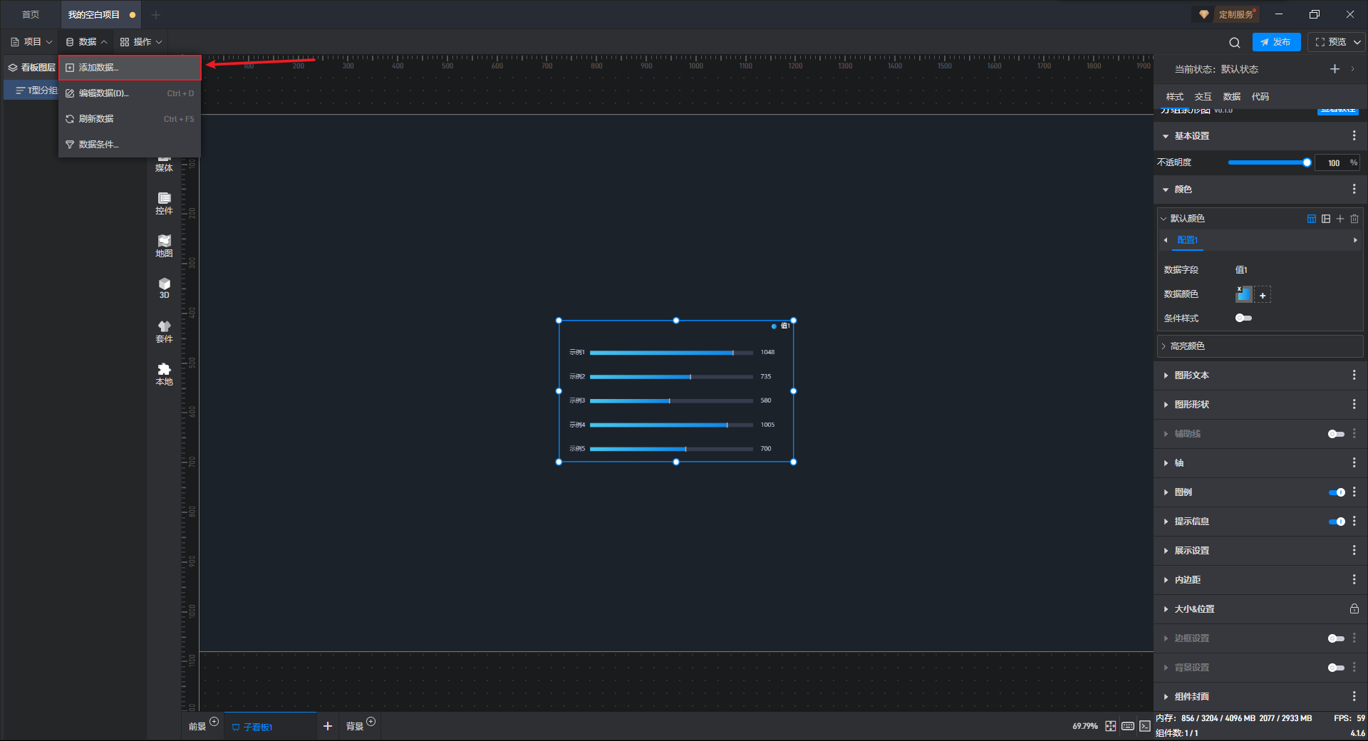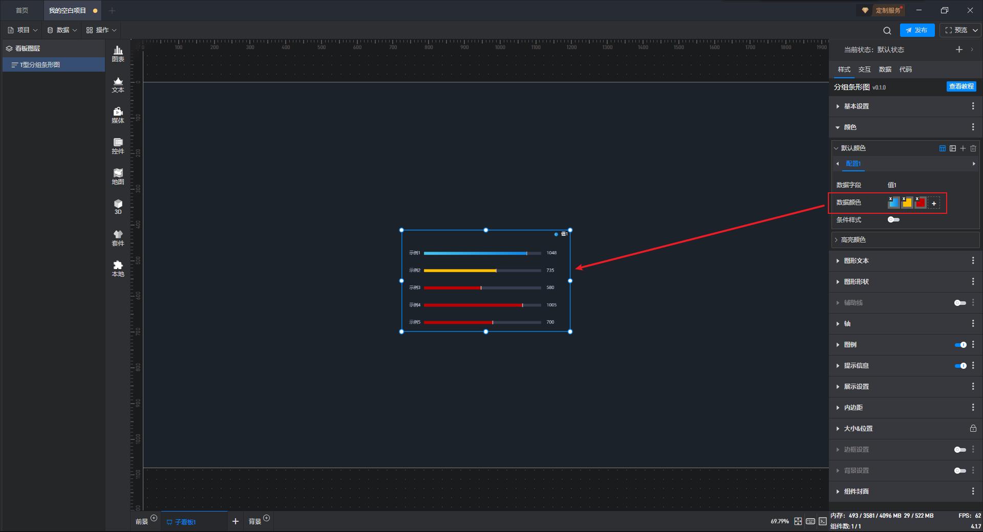 比较常用的一个设置就是根据数据条件来改变组件的颜色,这里我们就以“颜色”设置为例: