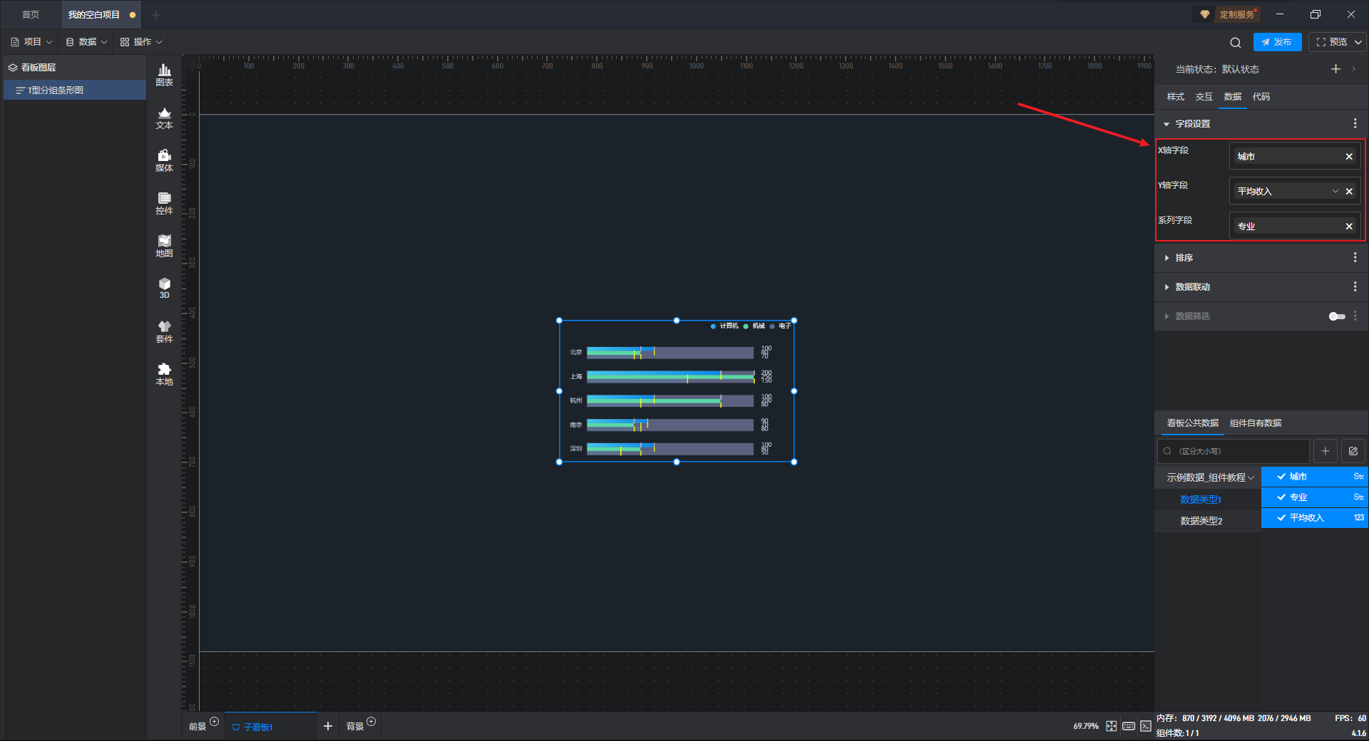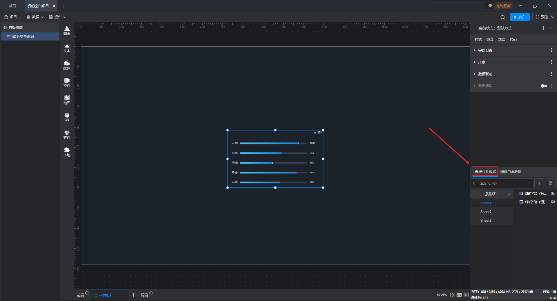 点击选中组件,在右侧“数据”设置窗口中切换到“看板公共数据”(同一个项目中所有数据源是共享的)。