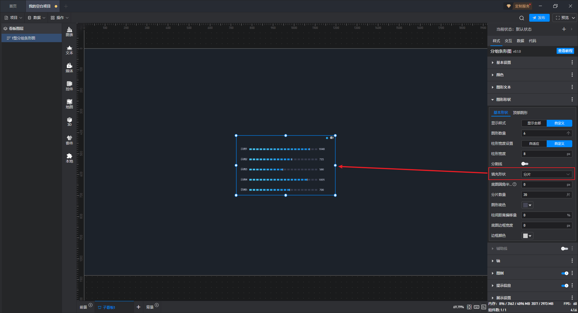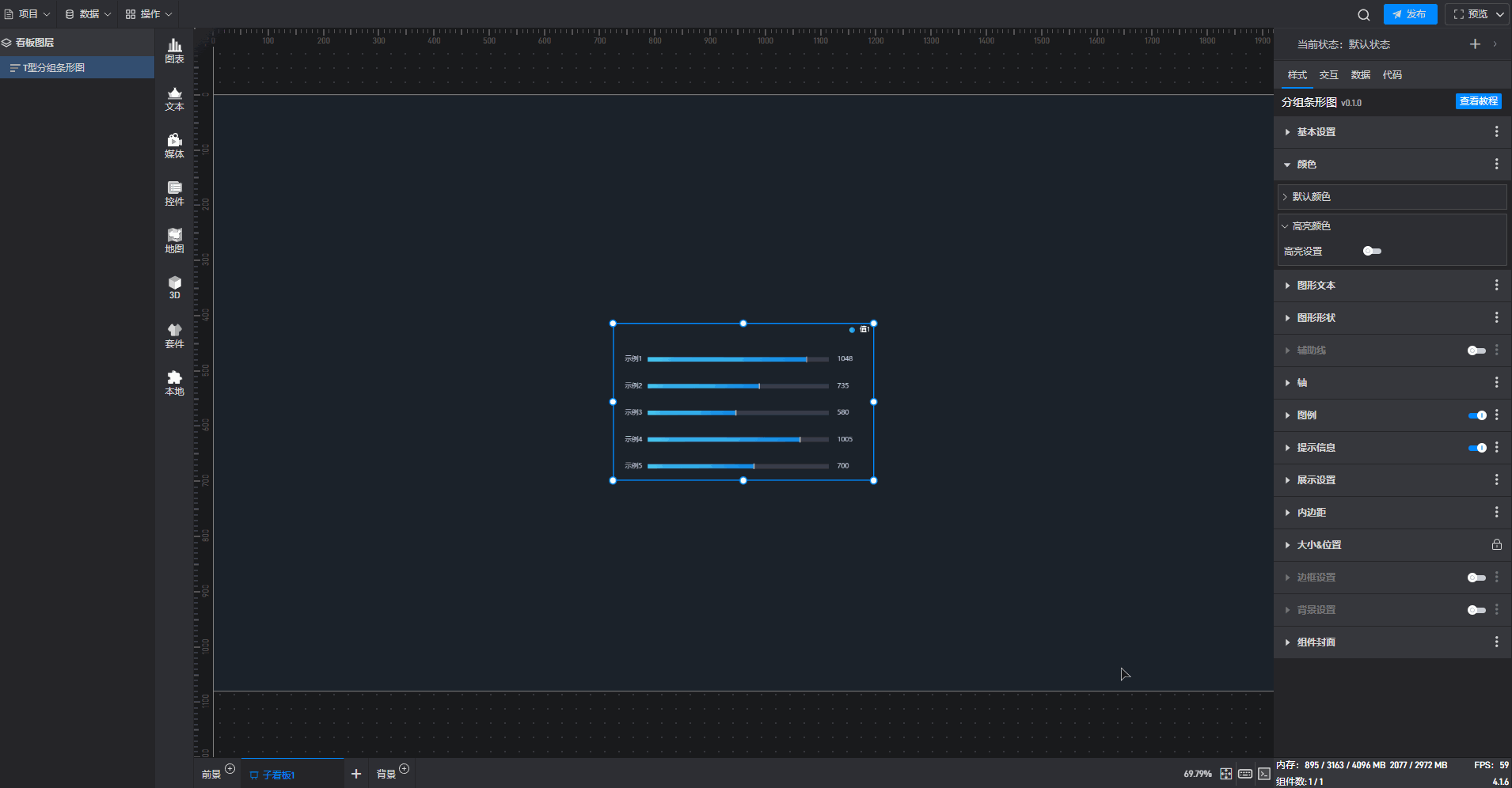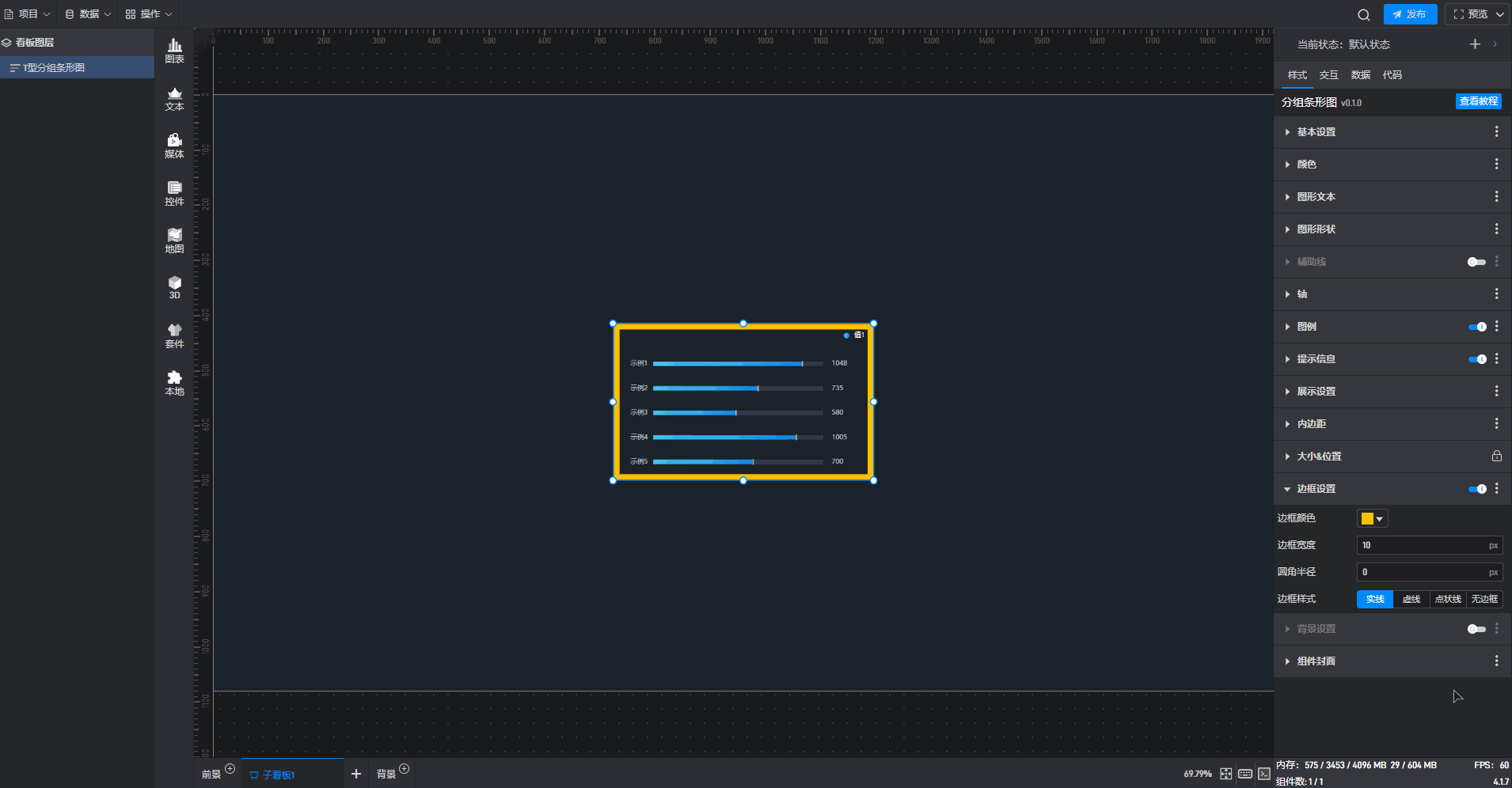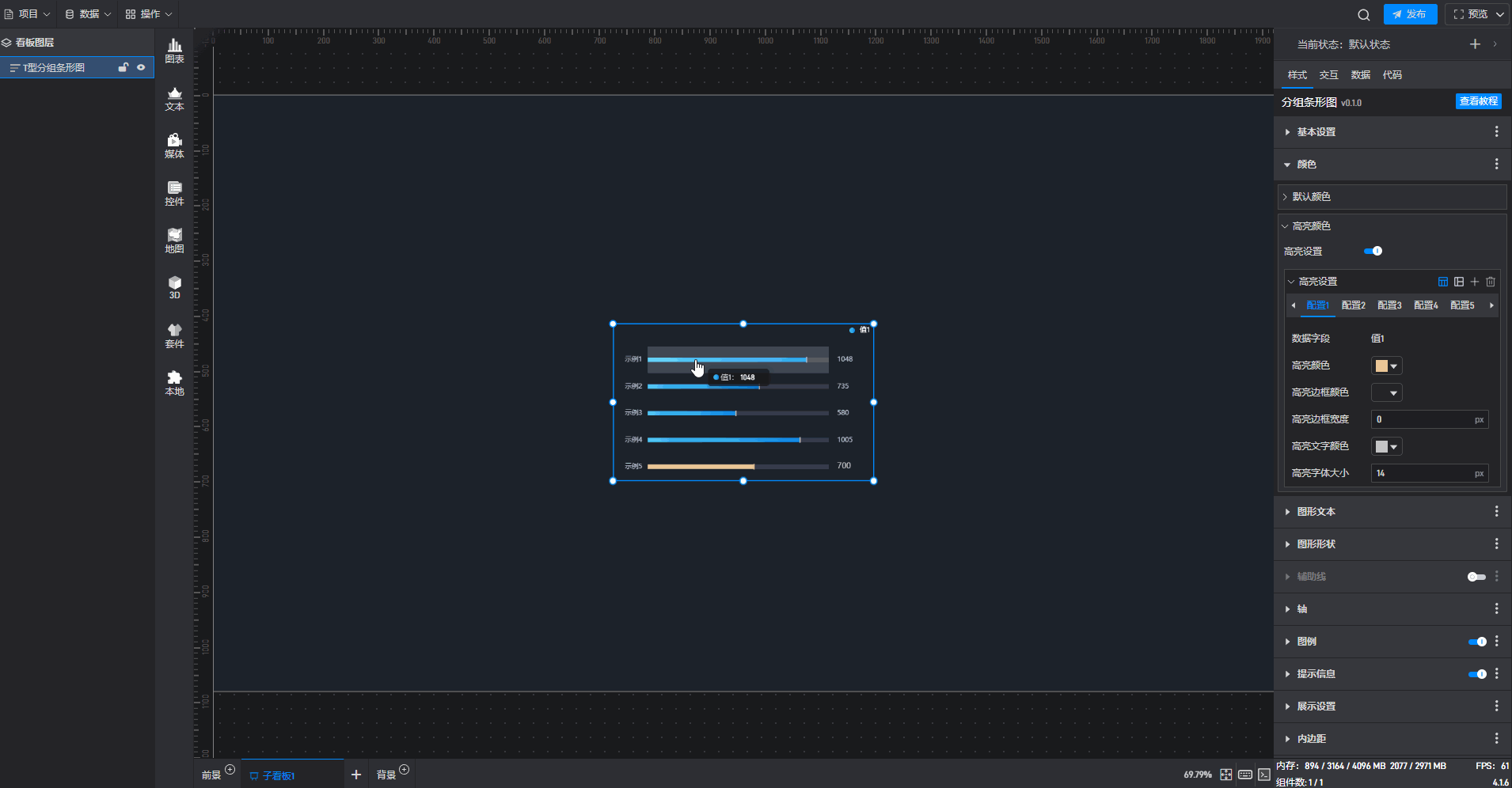 开启高亮设置,并设定高亮颜色、边框宽度等,就可以看到组件在显示对应数据柱子时会显示设置的高亮颜色。