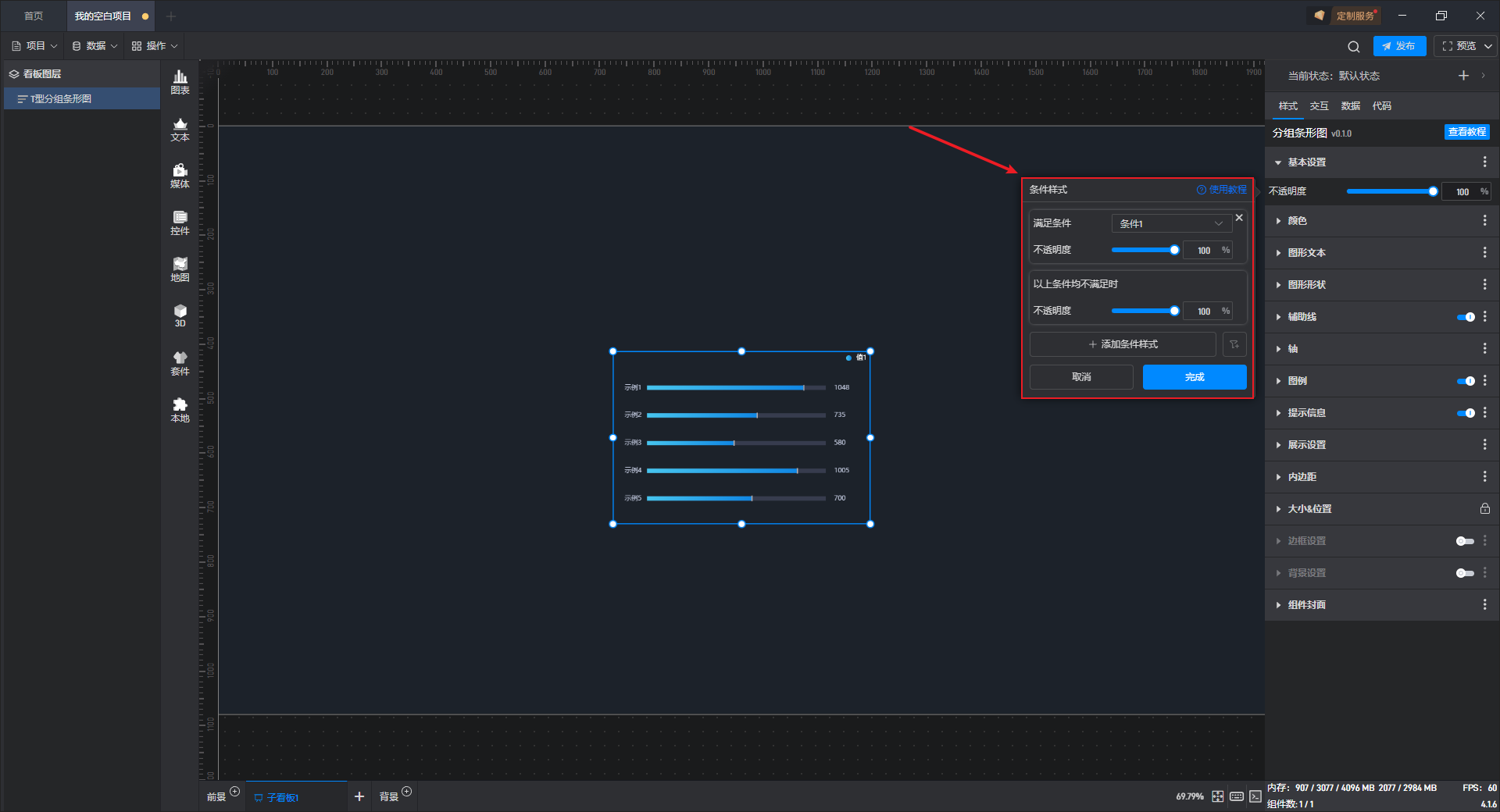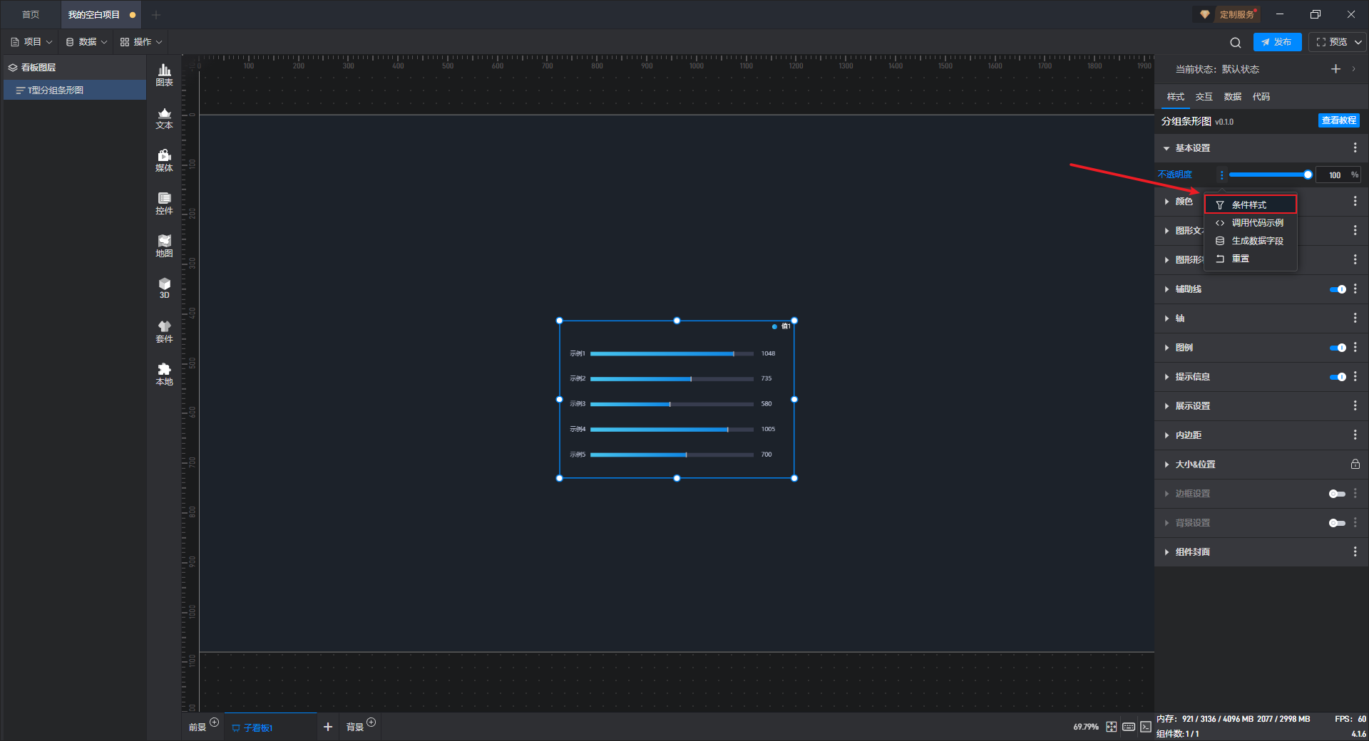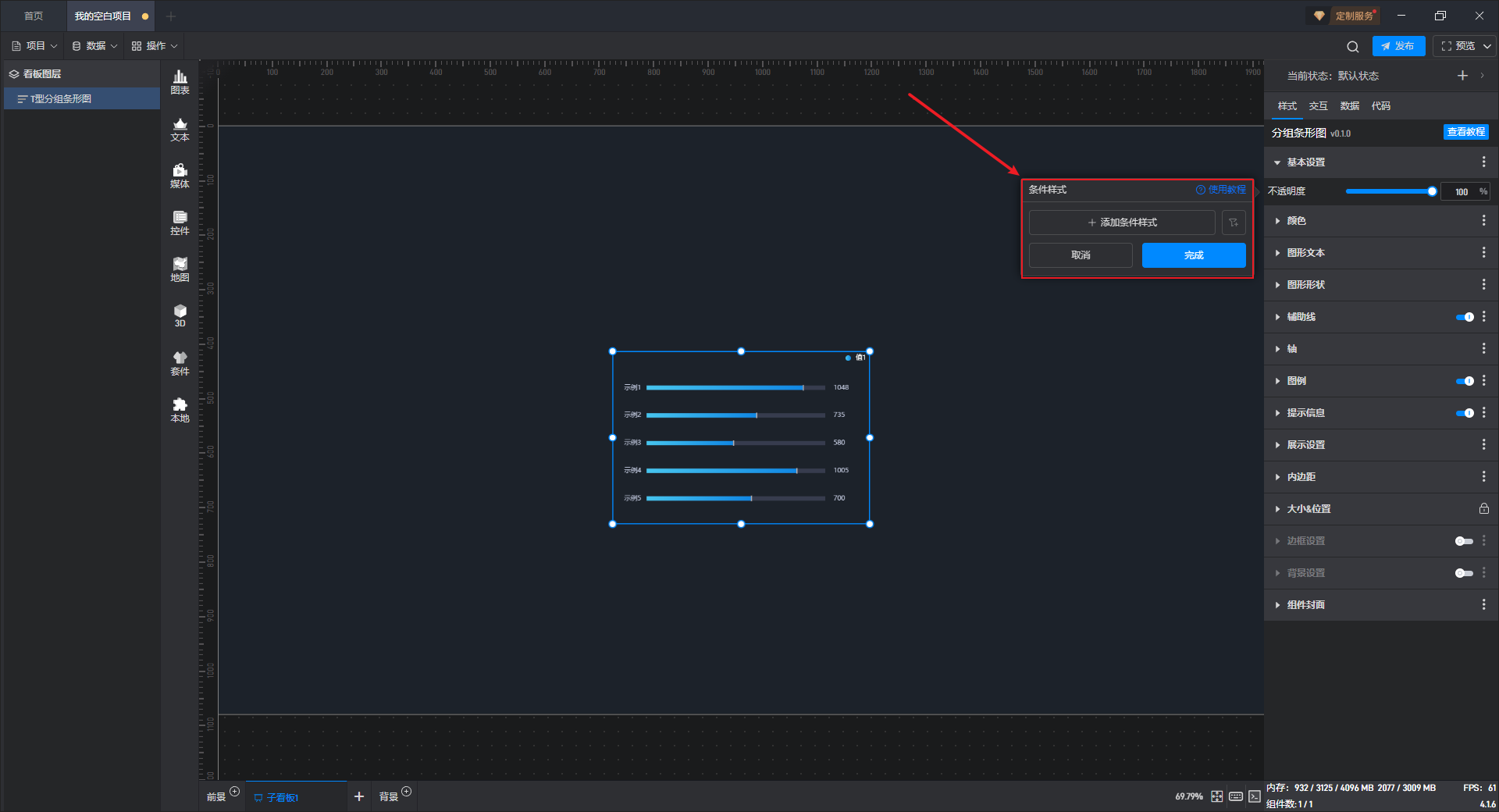 点击选中组件,开启“条件样式”按钮,就可以进行条件样式的设置。