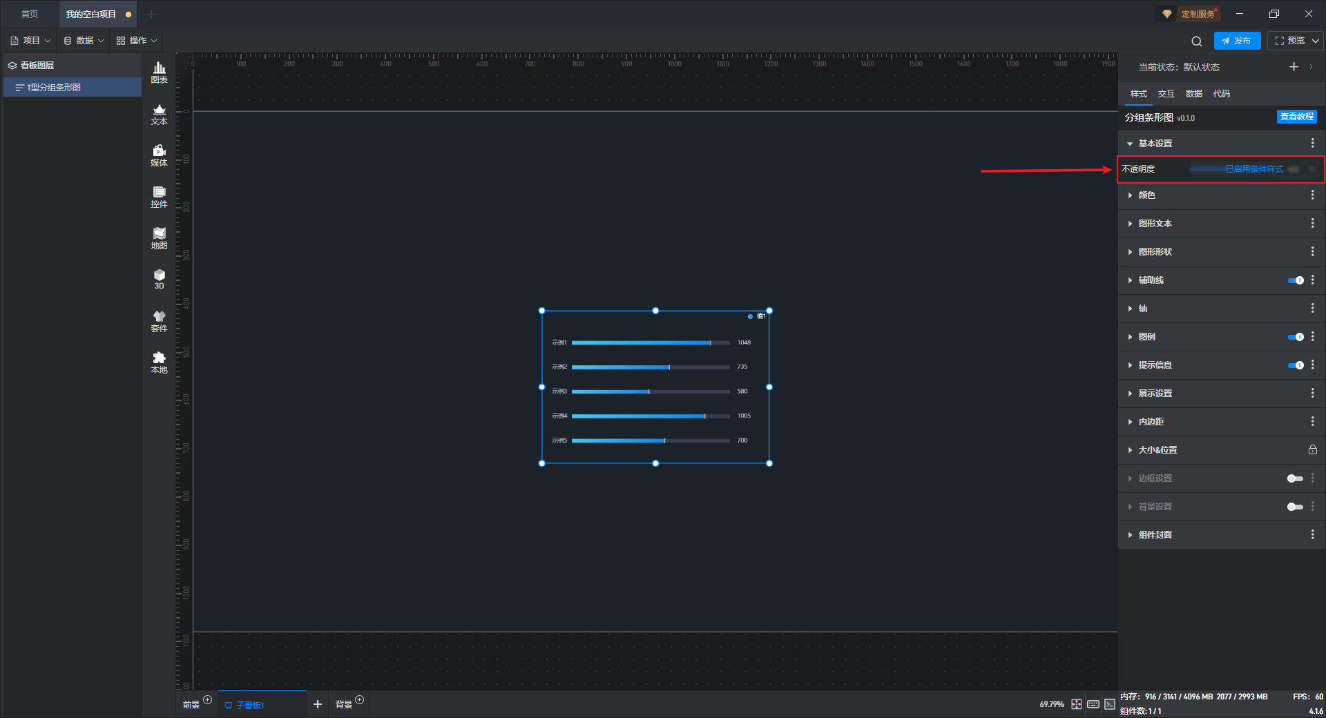 | 不透明度 | 1)根据个人喜好或整体和谐度合理地使用透明度,会让大屏布局更美观; | 2)这个设置项的一个常见用法是结合条件样式/交互/多状态来实现组件的显示和隐藏。 |