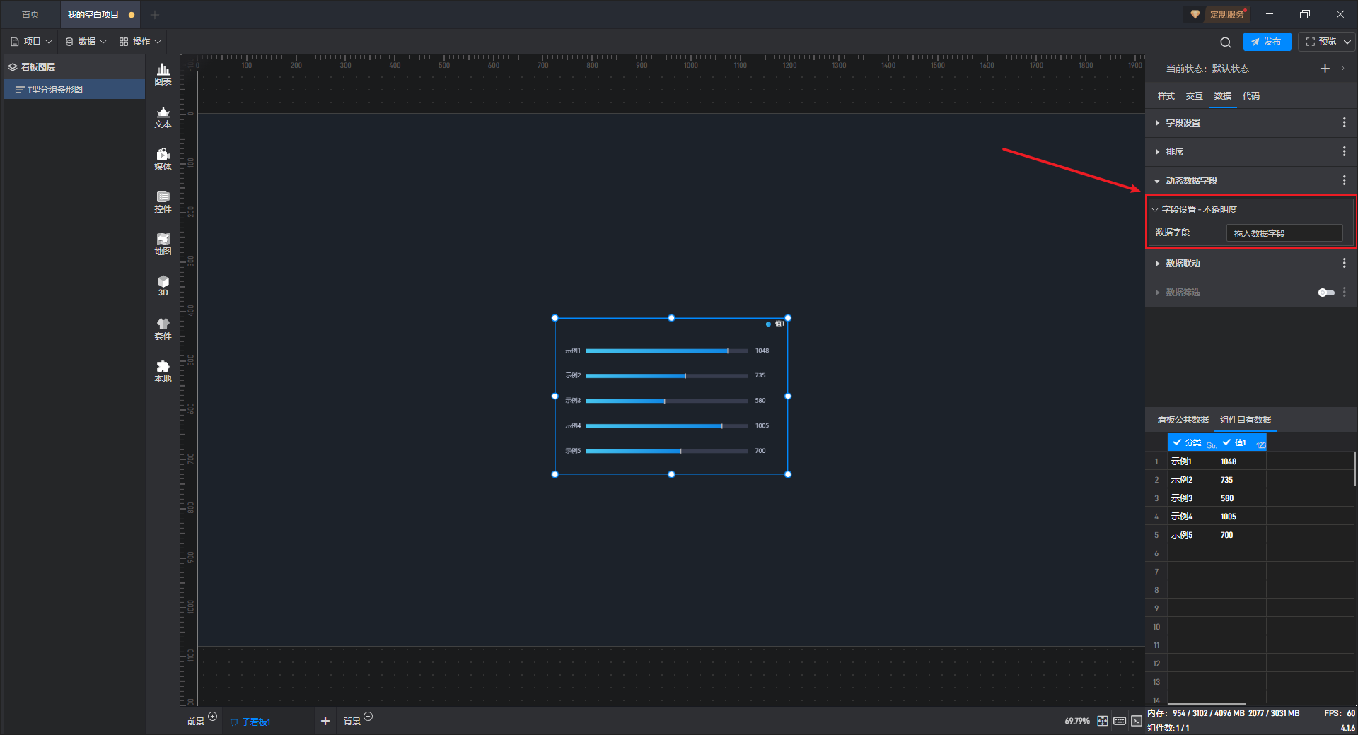 单击选中组件,在右侧“数据”设置窗口中,可以看到组件已经设置好了数据字段,且数据字段来自于“组件自有数据”。