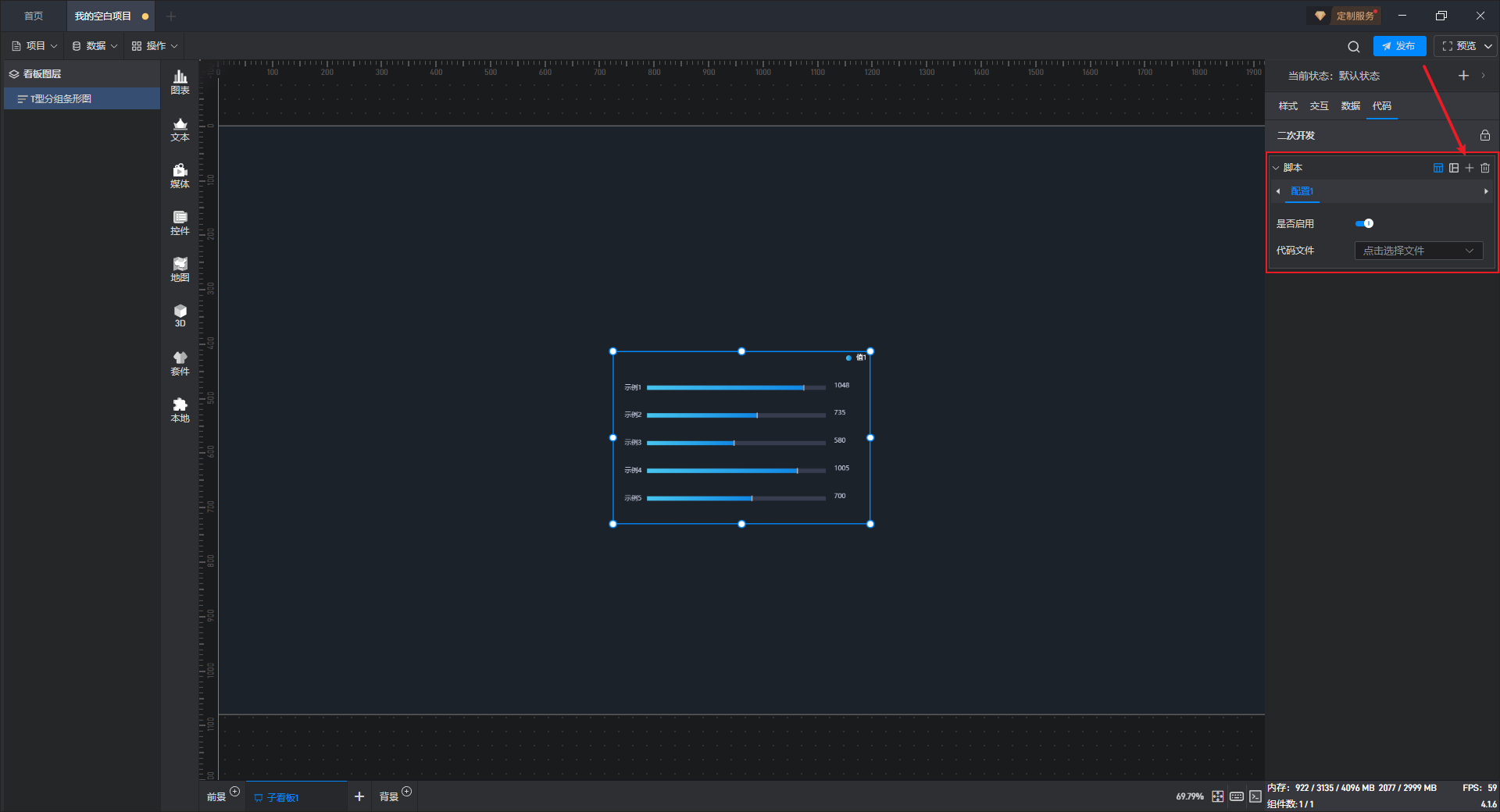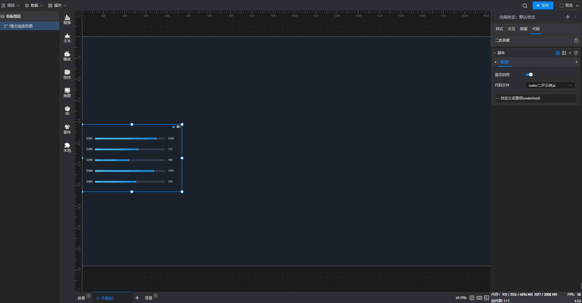 点击选中组件,在右侧“代码”设置窗口中可以对组件进行二次开发设置。