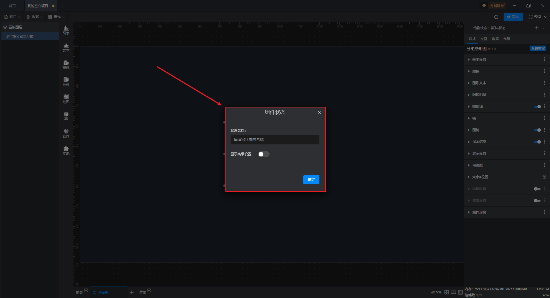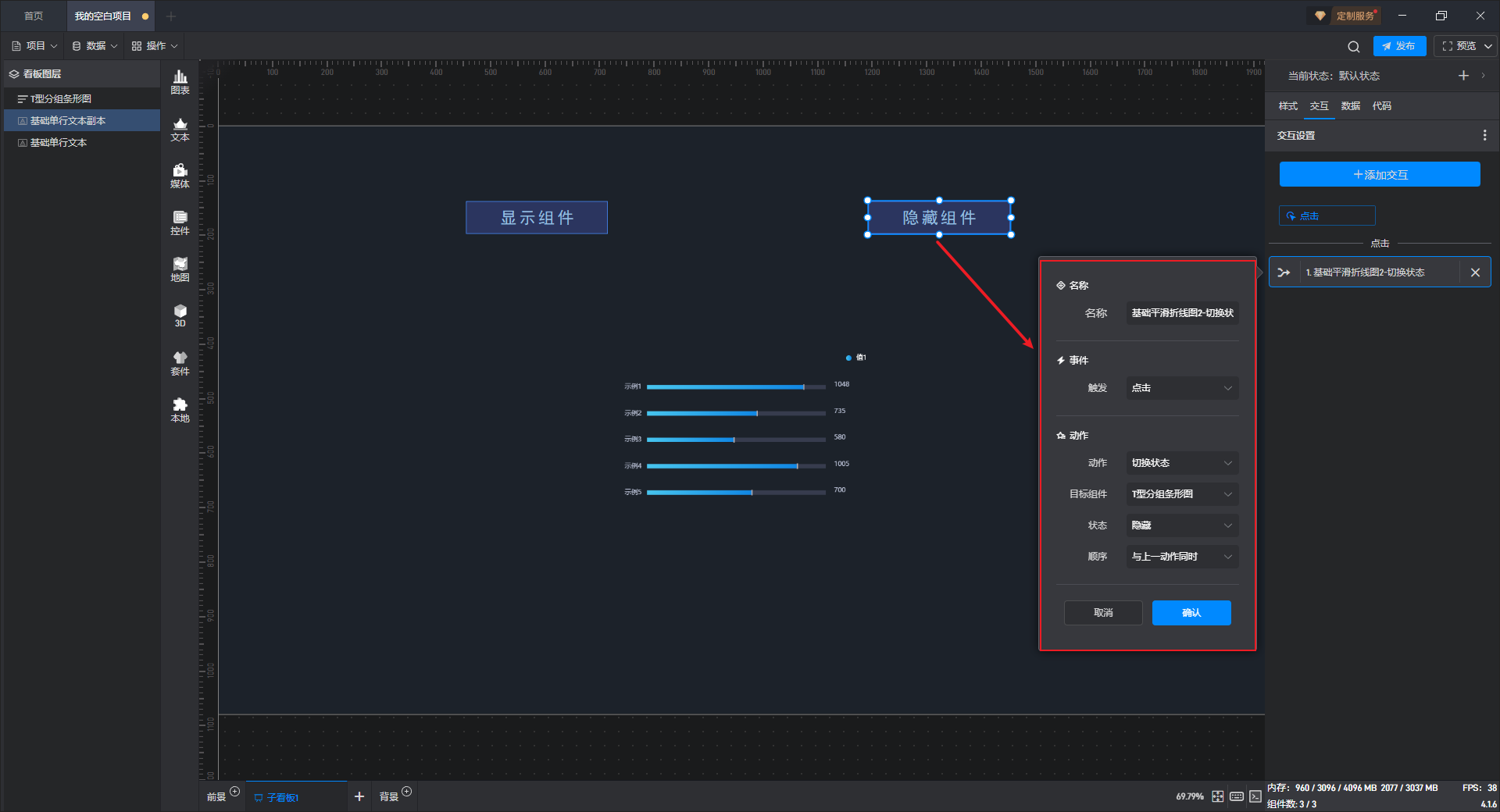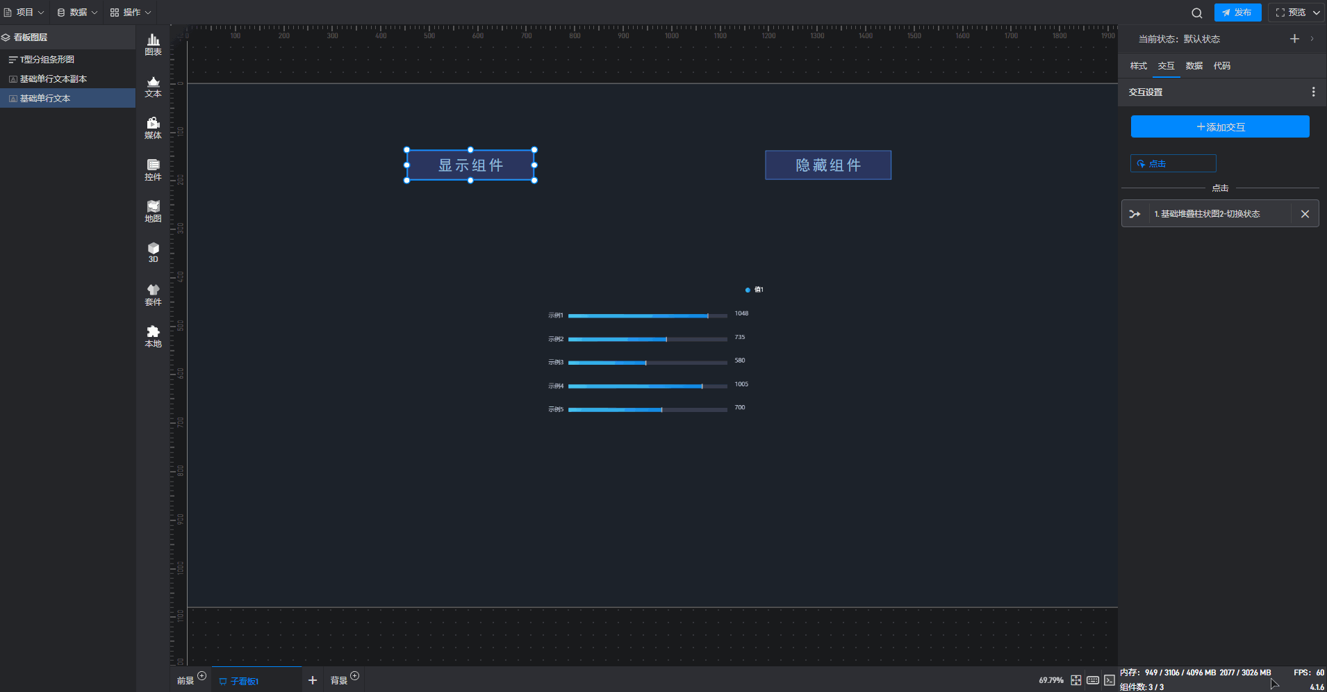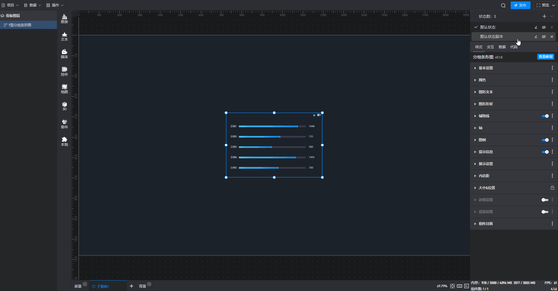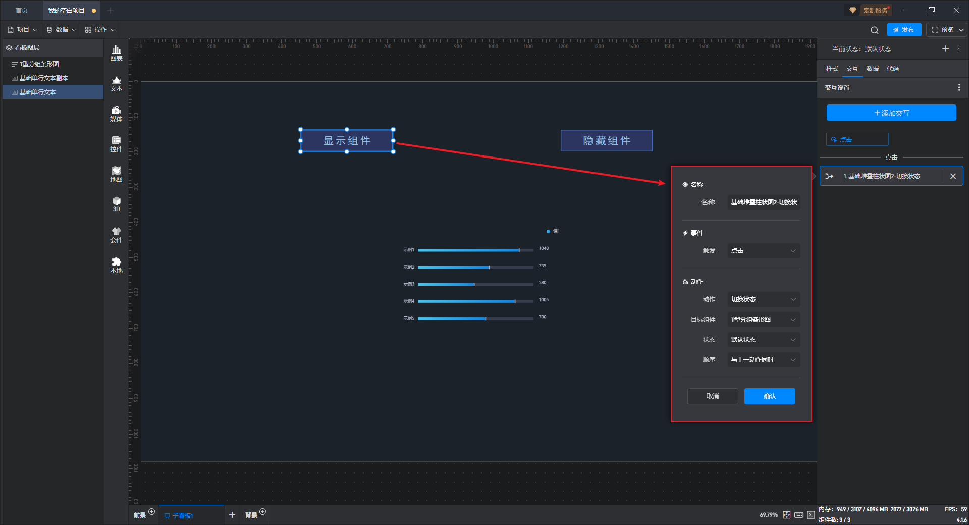 多状态主要用于通过数据条件或是点击交互(通常是点击其他组件来触发本组件的状态切换)来切换组件设置项的场景,这里的设置项包括组件的样式、交互、数据和代码。