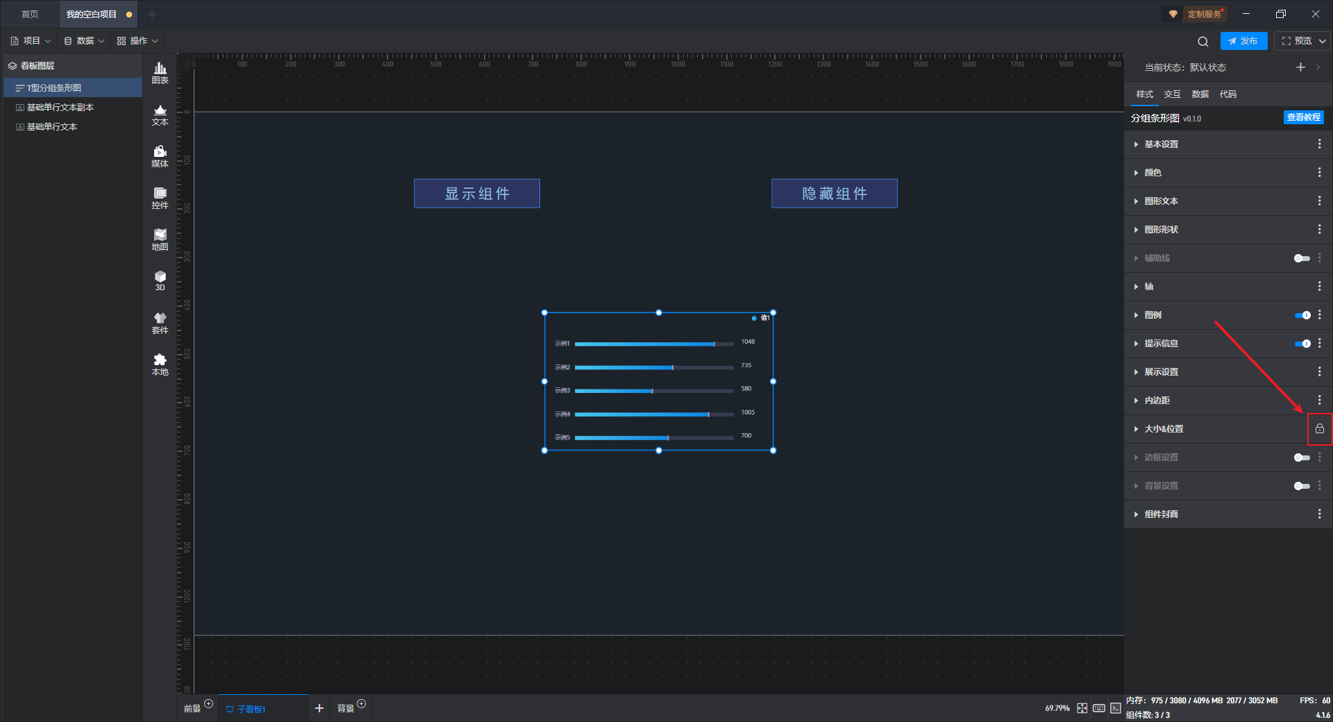 可以通过直接点击和拖动组件来调整大小和位置,也可以通过直接输入宽、高、X 坐标和Y 坐标的方式来设置。