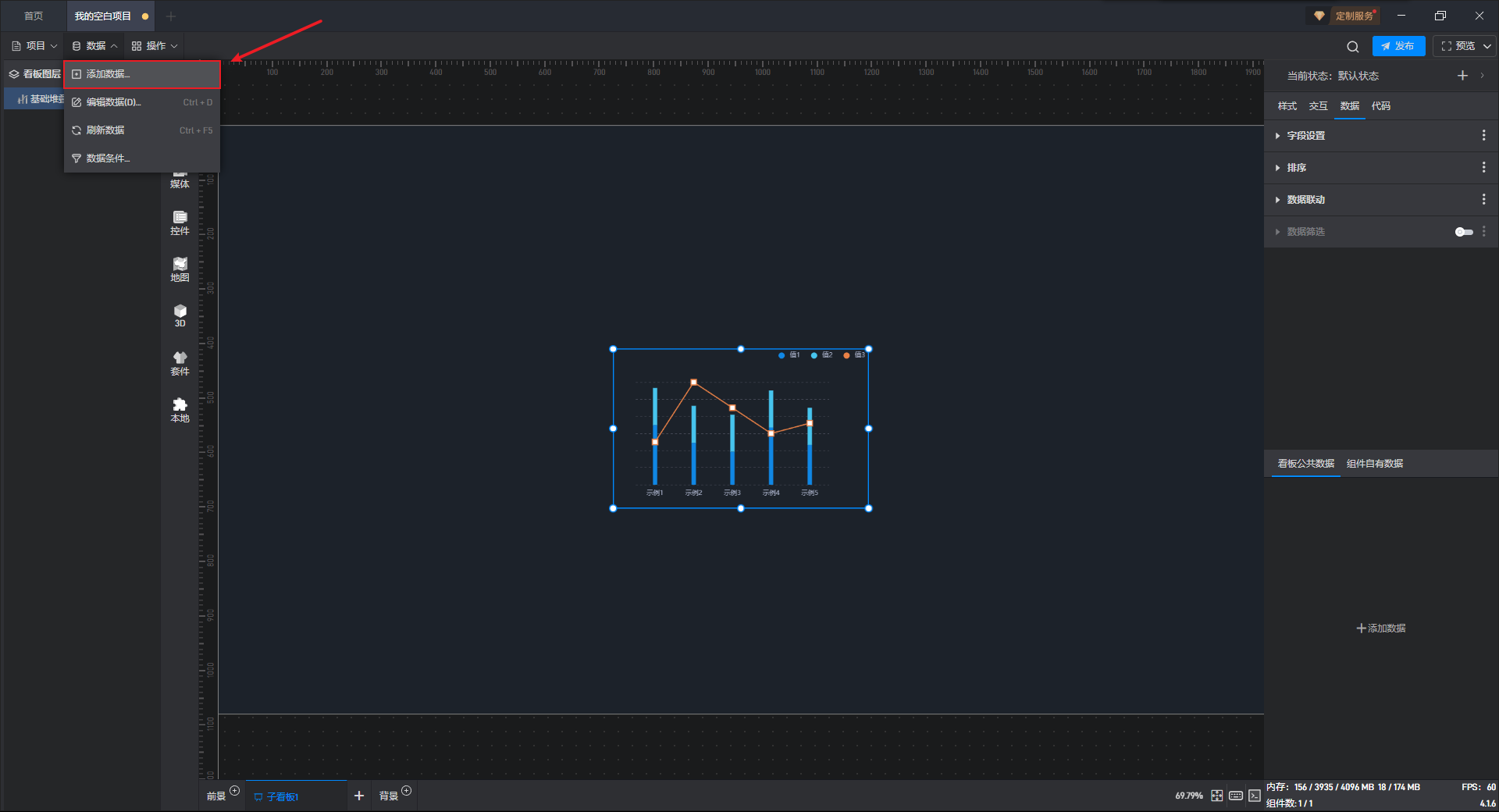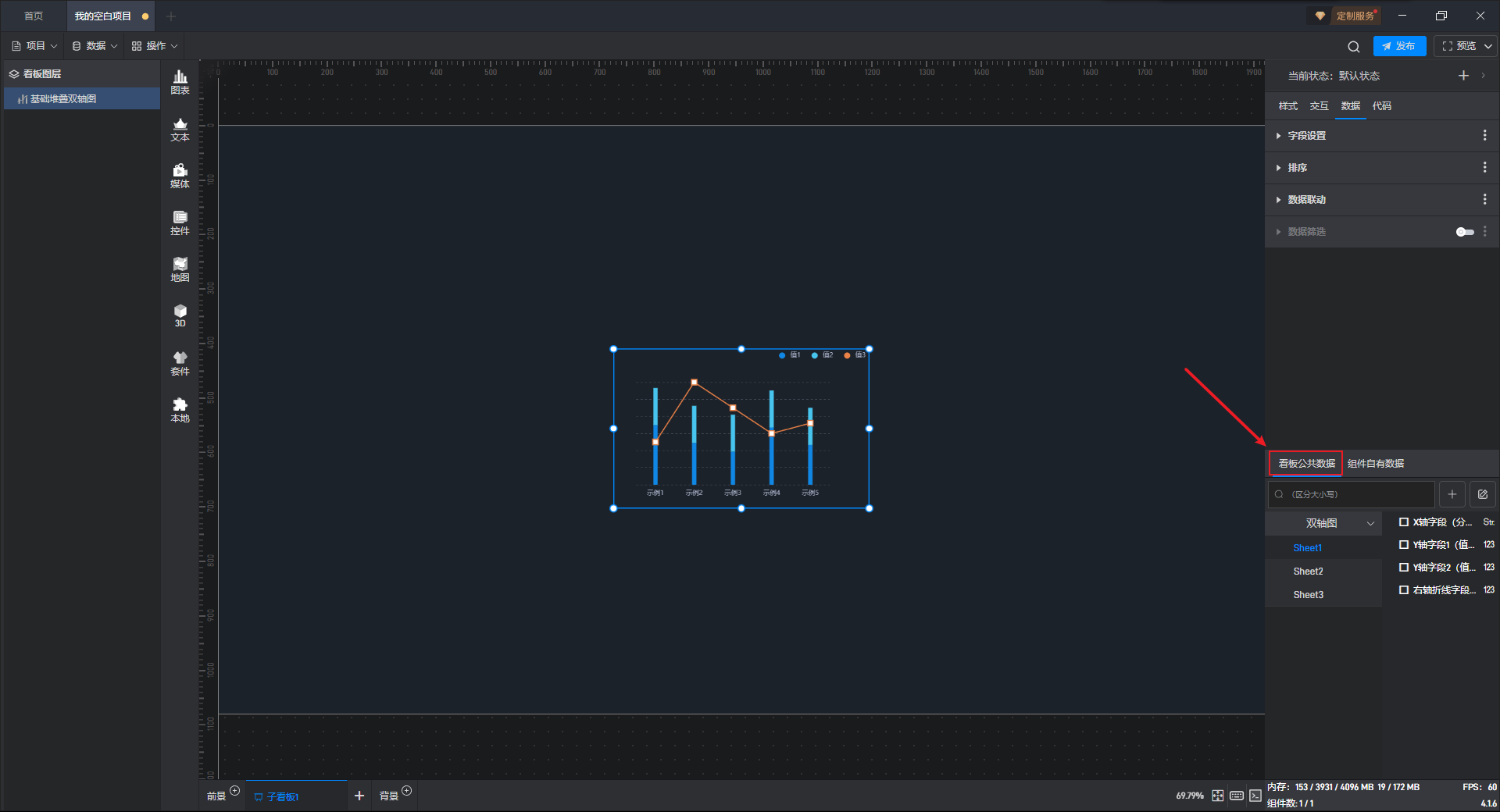 点击选中组件,在右侧“数据”设置窗口中切换到“看板公共数据”(同一个项目中所有数据源是共享的)。
