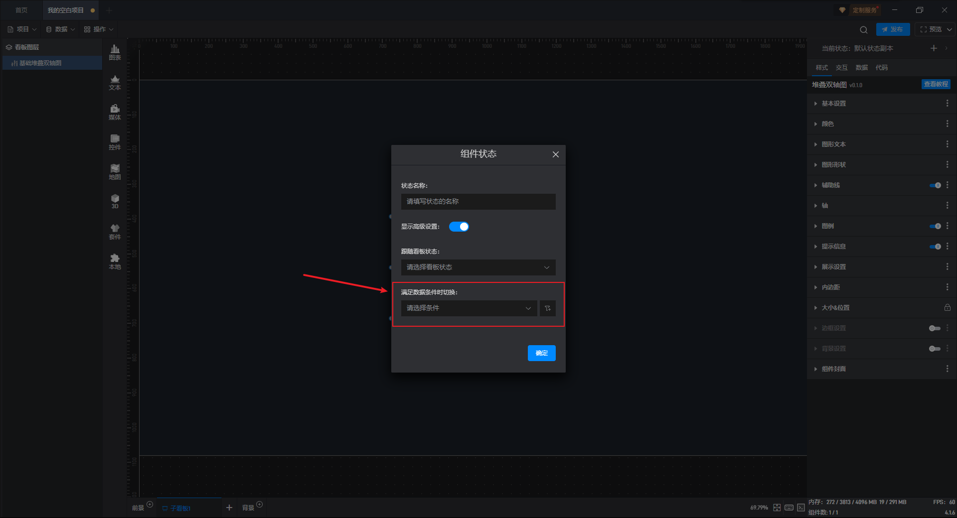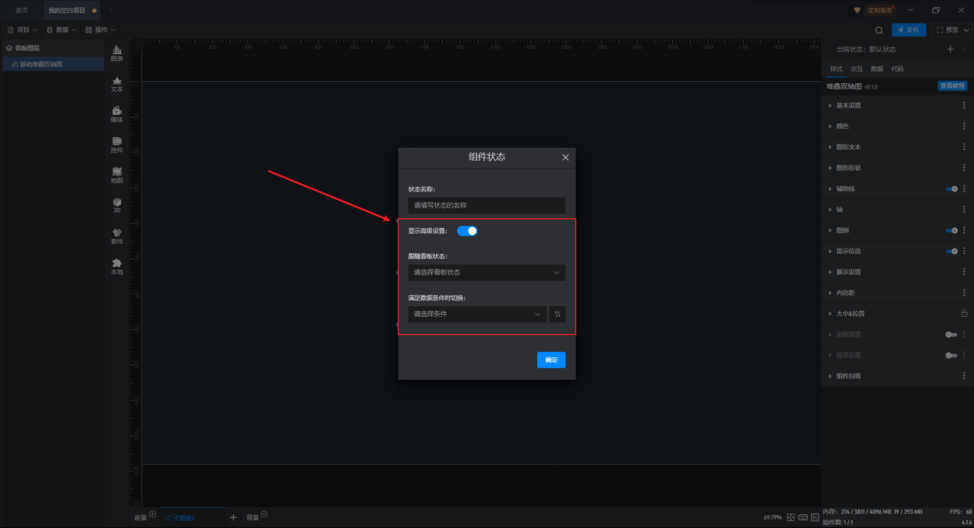 多状态主要用于通过数据条件或是点击交互(通常是点击其他组件来触发本组件的状态切换)来切换组件设置项的场景,这里的设置项包括组件的样式、交互、数据和代码。