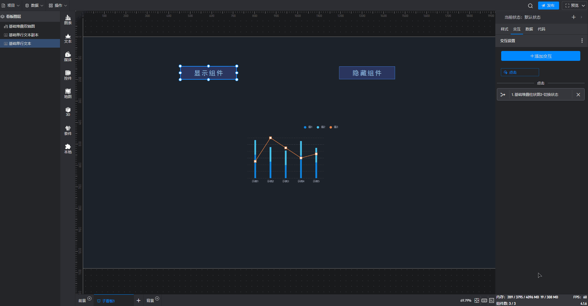 给隐藏按钮组件添加一个交互,点击后切换双轴图组件到隐藏状态。