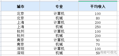 数据内容如下,“城市”为 X 轴字段,“专业”为系列字段,“平均收入”为 Y 轴字段。