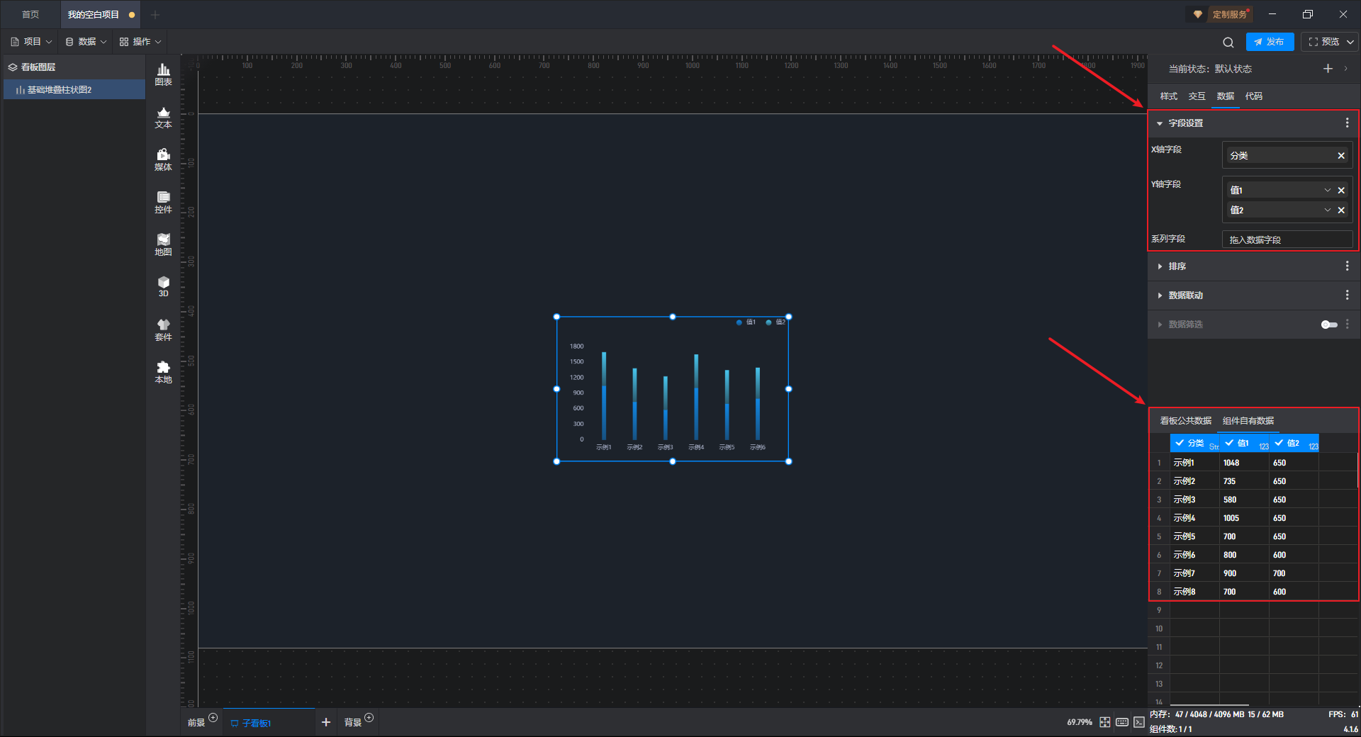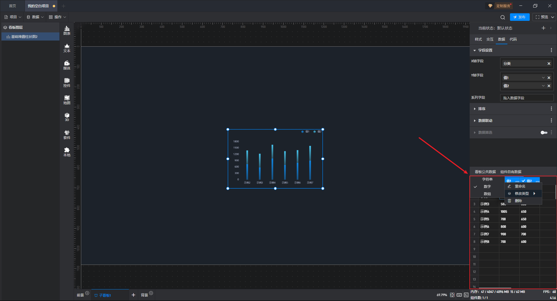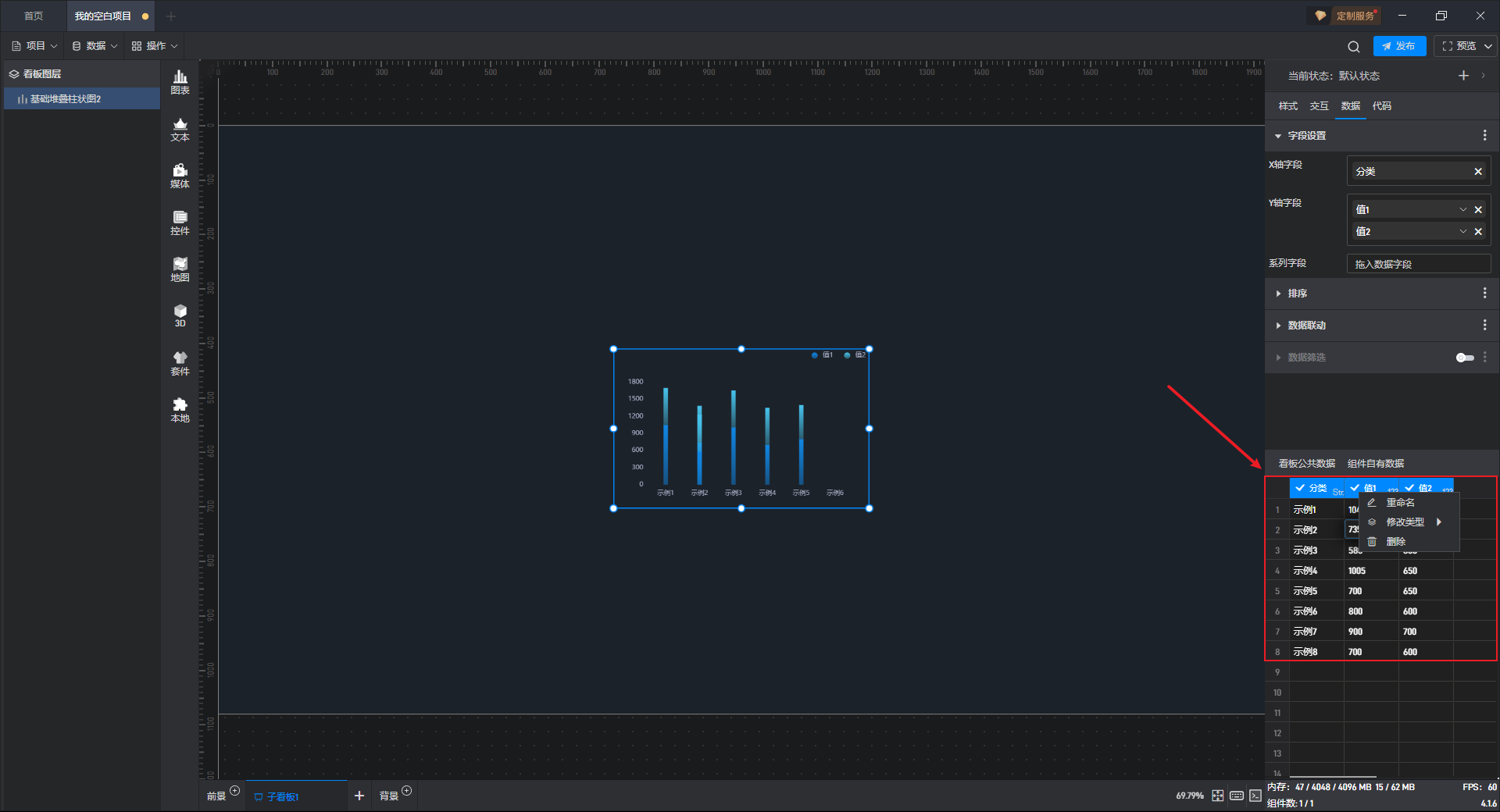 其中 X 轴字段和系列字段是字符串类型,Y 轴字段是数字类型。