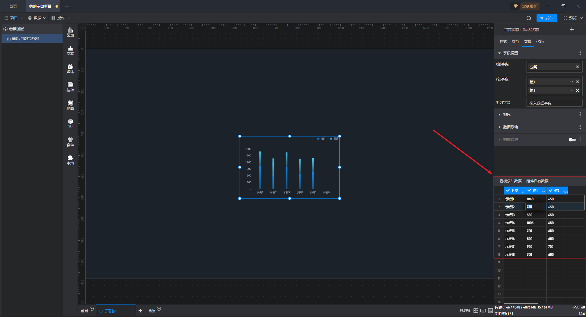 在“数据”设置界面下方可以直接修改数据,组件中的数据也会实时更新。