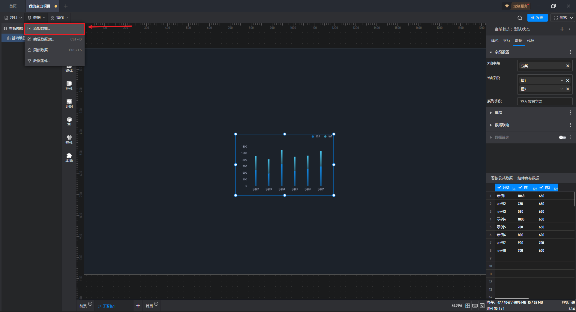 【温馨提示】如果您需要在本地数据源准备好之前制作项目,如制作一个原型图或 Demo,此时您可以直接使用组件自有数据。组件自有数据符合上述的组件数据源格式要求,但是不一定符合您的项目需求,所以您需要先对其进行修改才能使用。