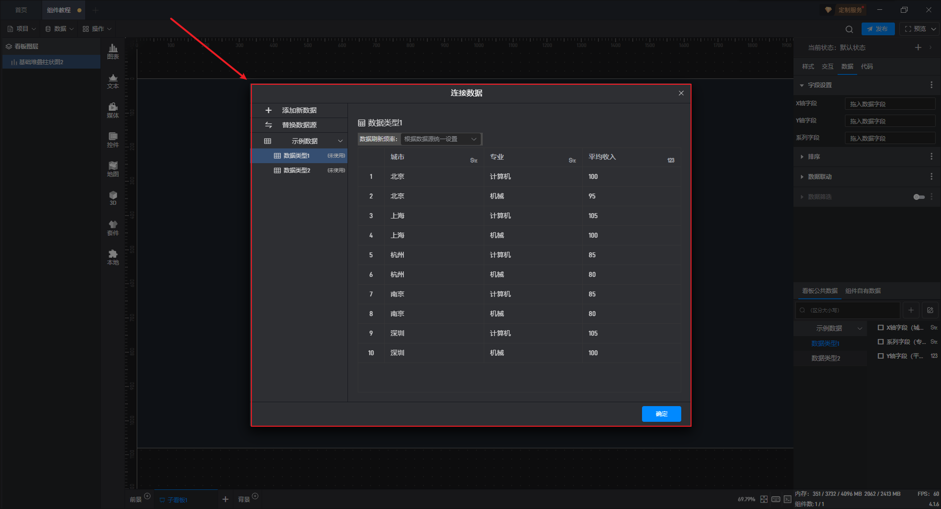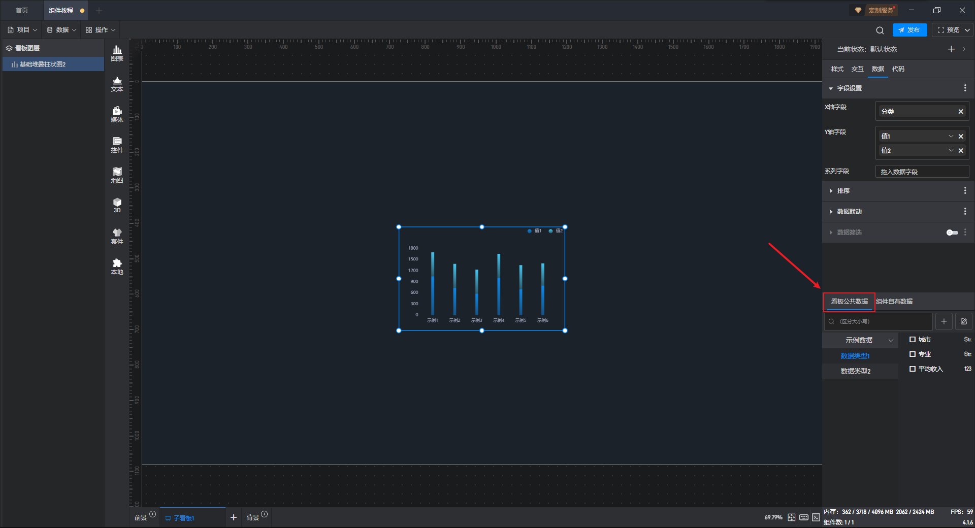 点击选中组件,在右侧“数据”设置窗口中切换到“看板公共数据”(同一个项目中所有数据源是共享的)。