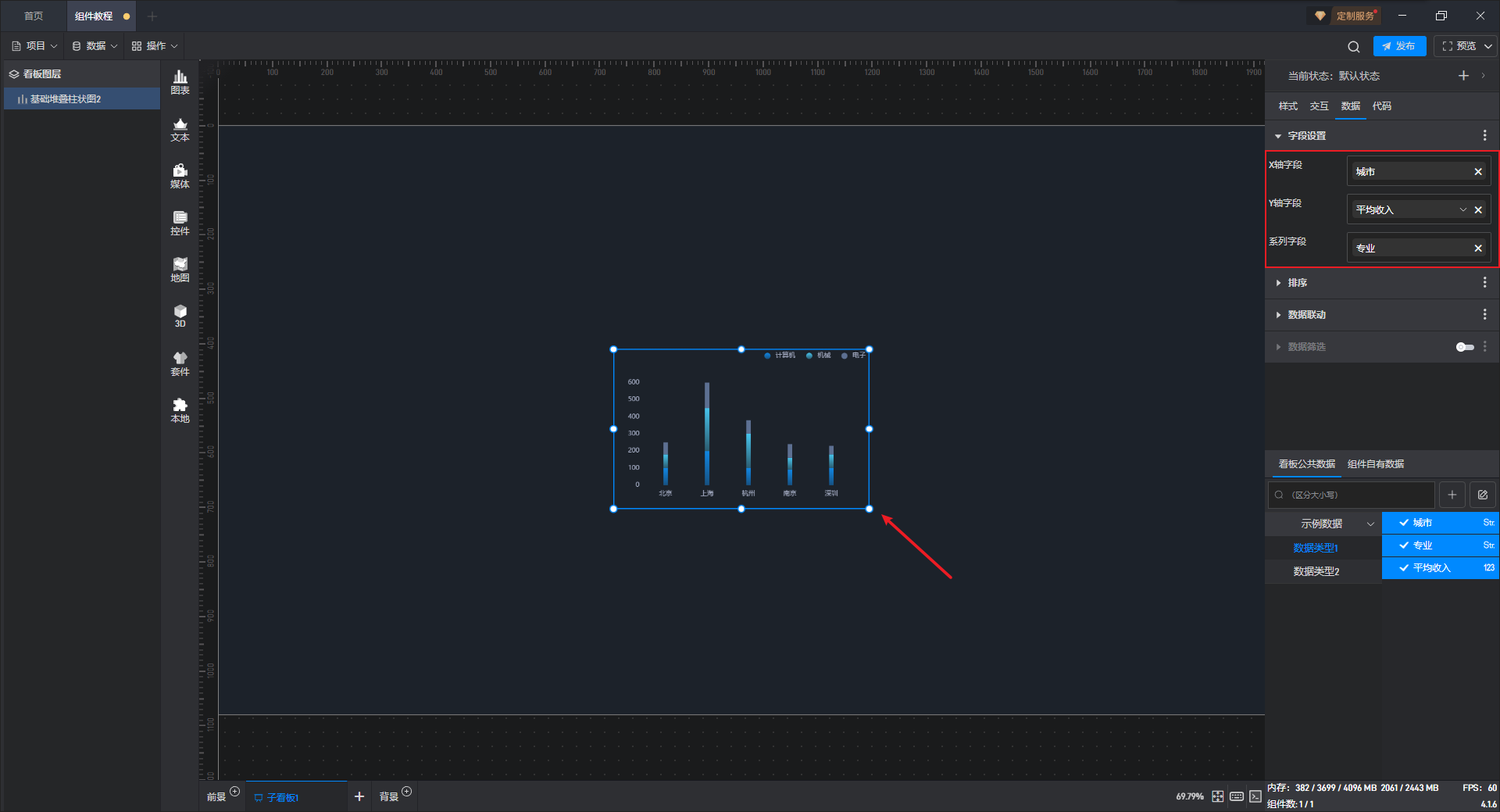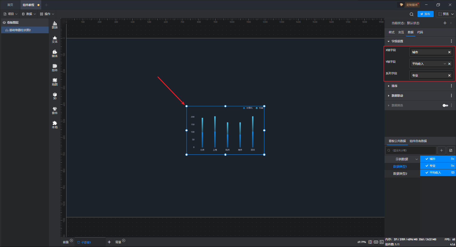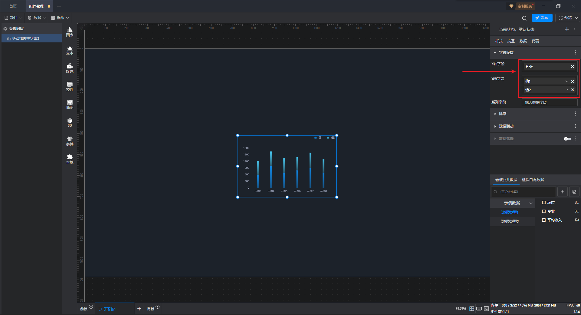 字段类型包括:字符串、数字和数组(X 轴字段和系列字段都是字符串类型,Y 轴是数字类型,数组类型用于词云组件),只有在字段类型正确的情况下,组件内容才能正常显示。