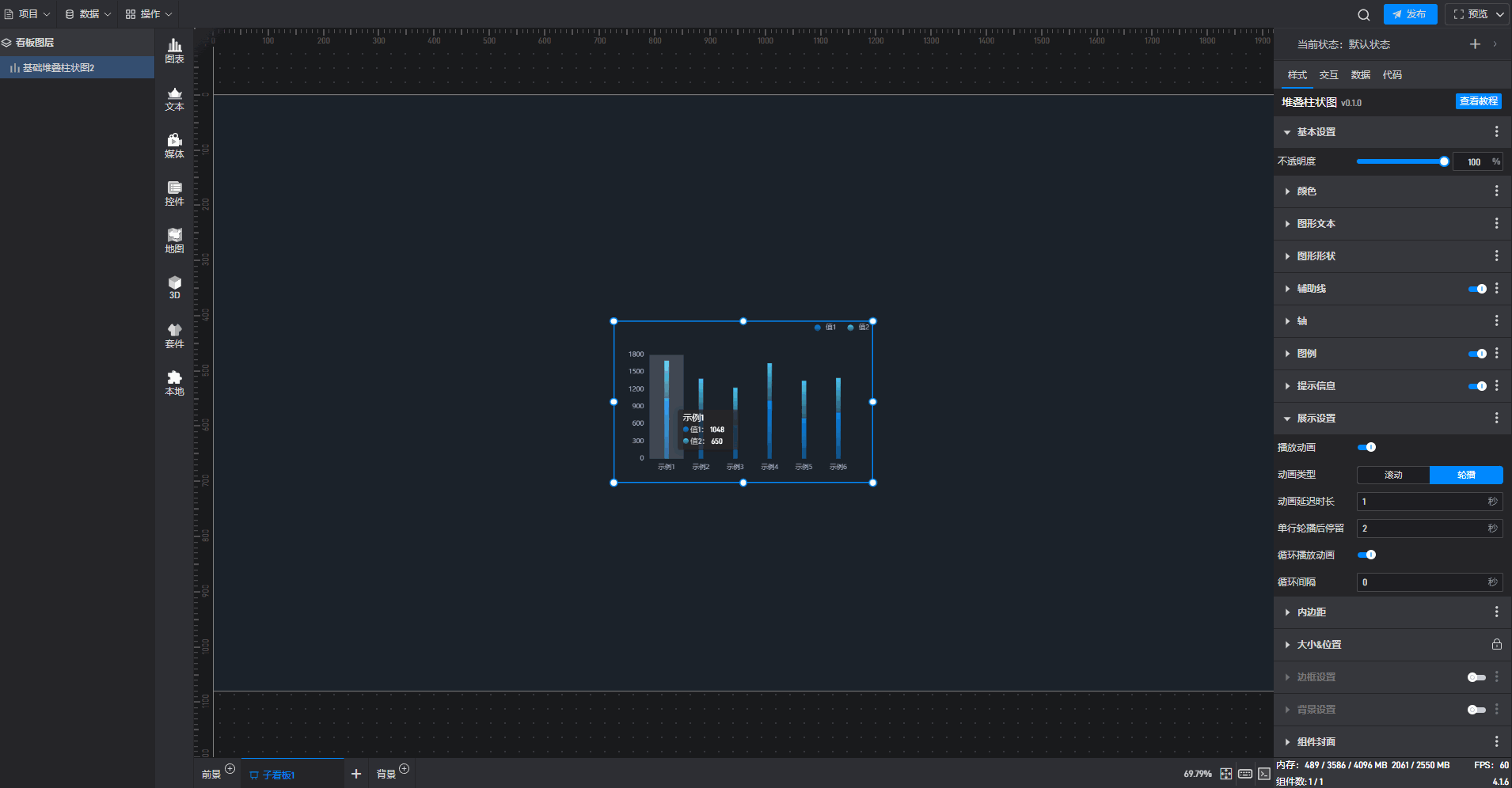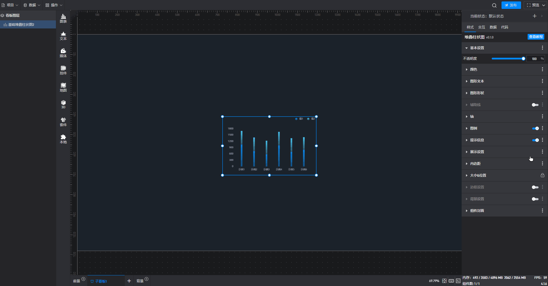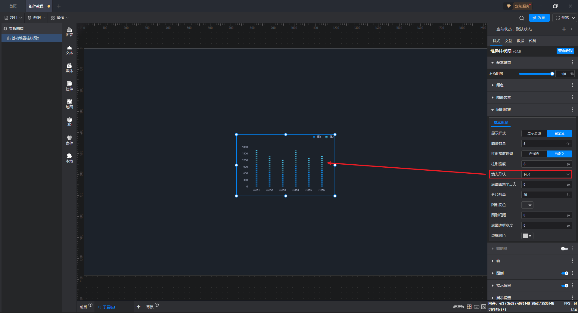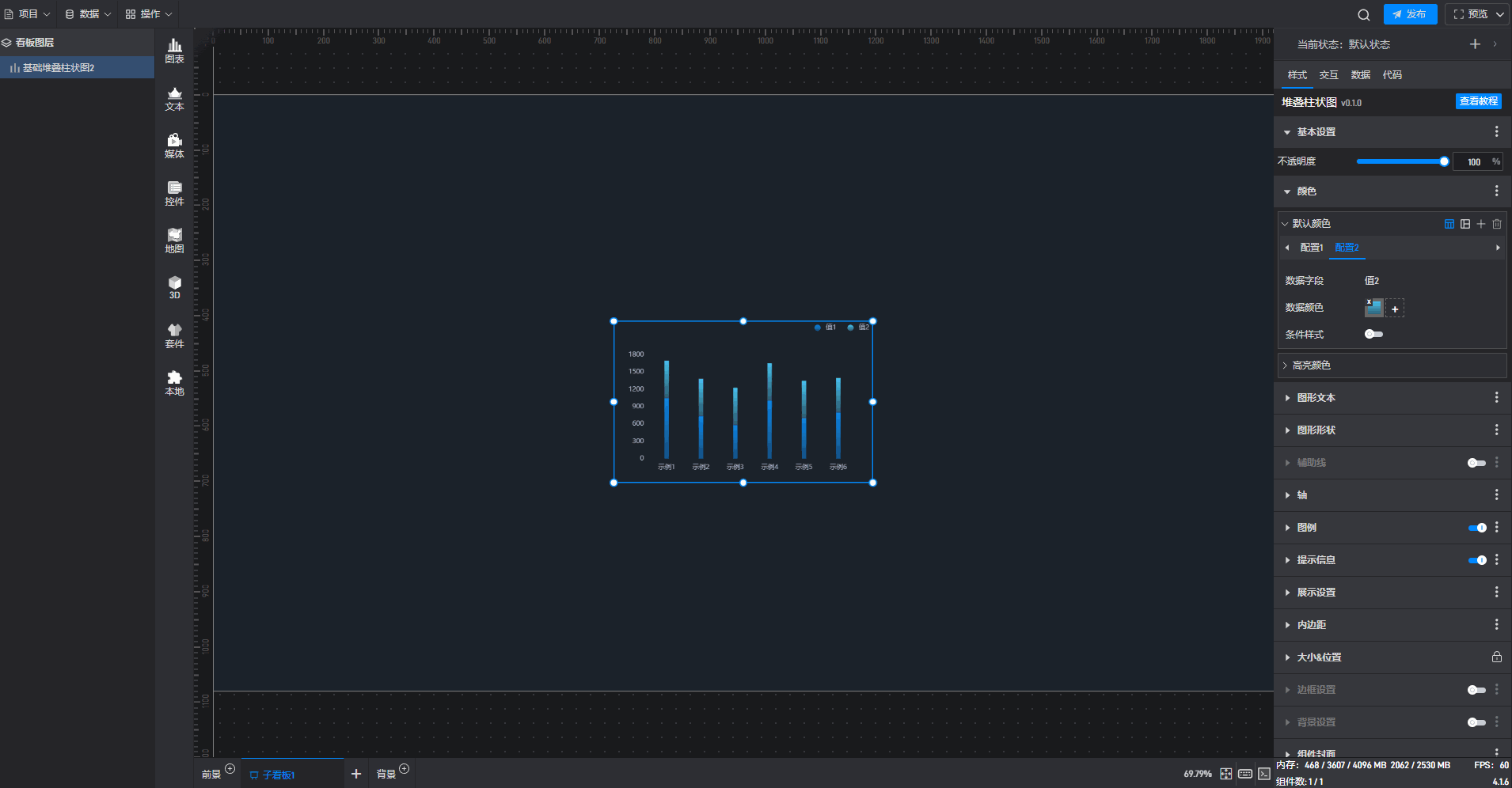 基础堆叠柱状图 2、基础堆叠柱状图 3都是堆叠柱状图的预设样式,预设的样式主要包括组件自有数据、图形形状、颜色和数量,但是本质上这三种组件都是堆叠柱状图。