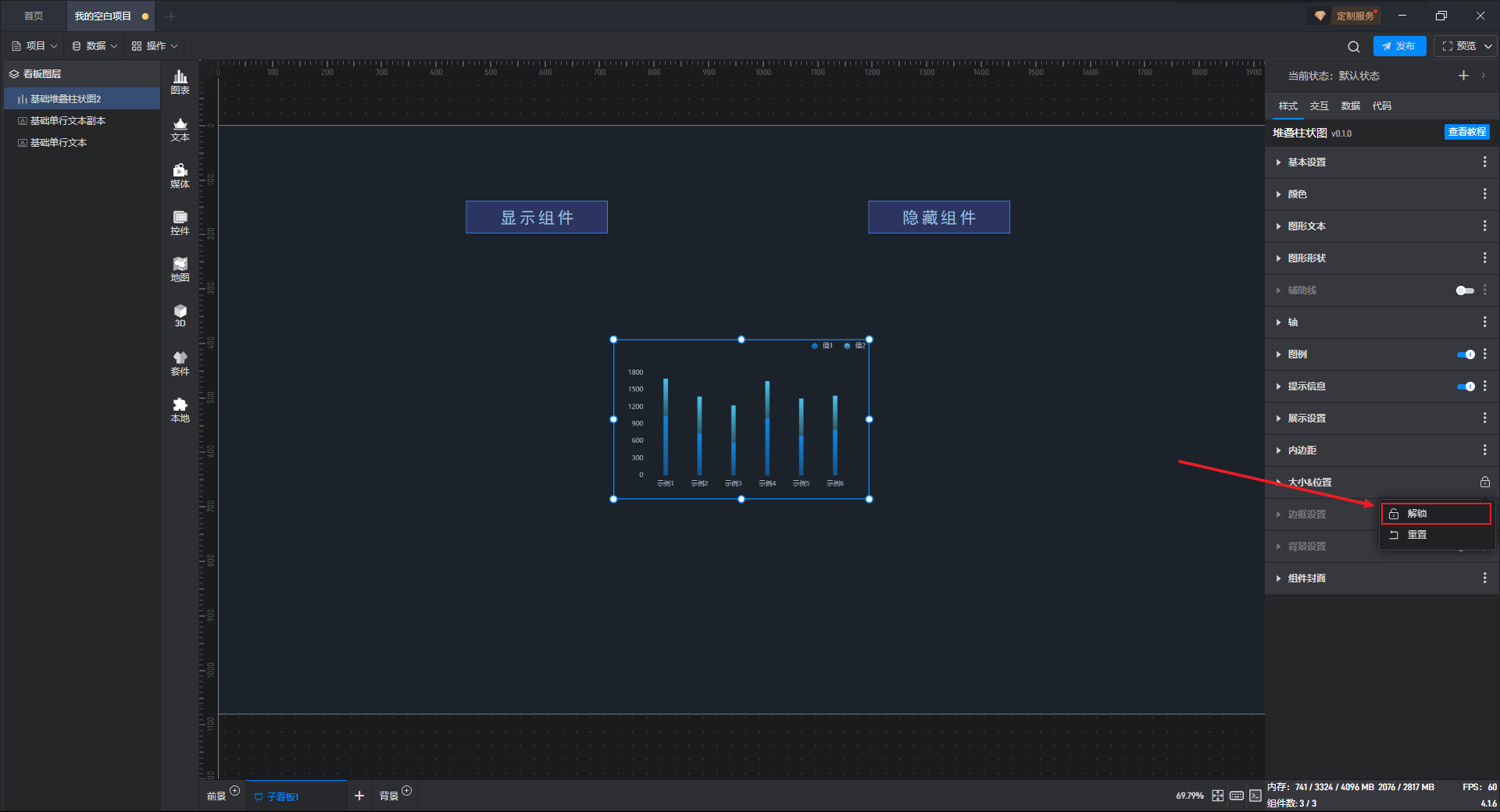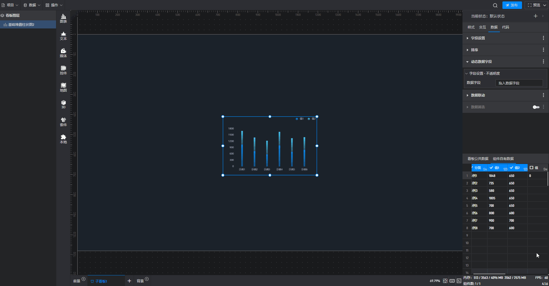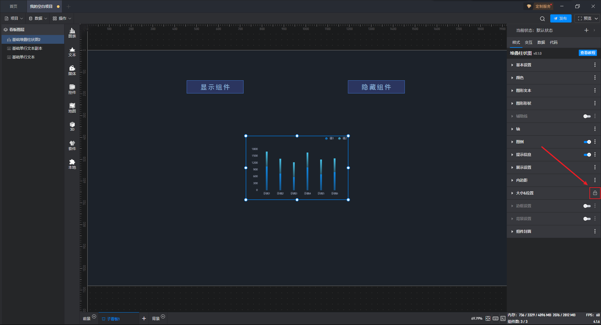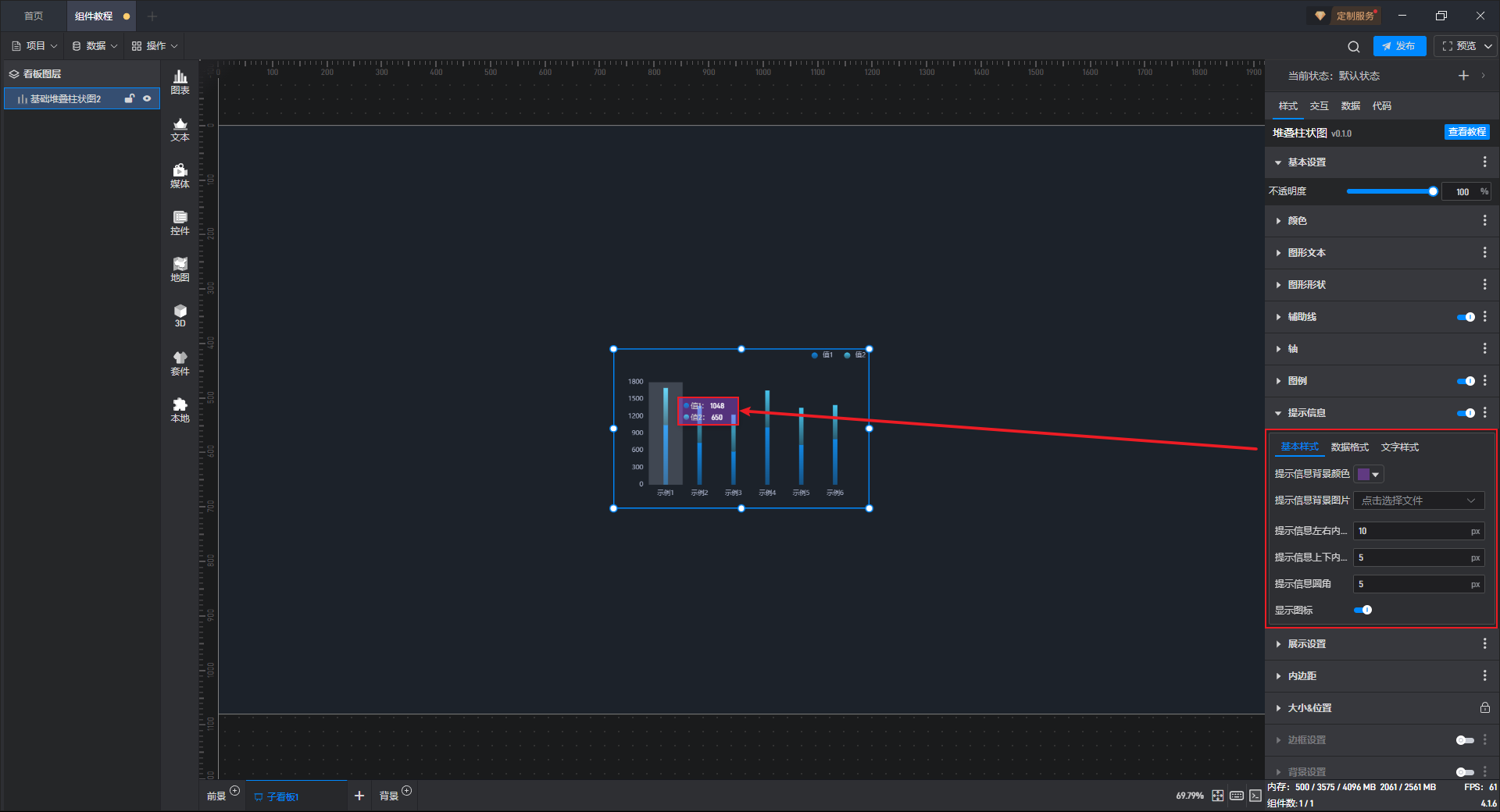 基础堆叠柱状图 2、基础堆叠柱状图 3都是堆叠柱状图的预设样式,预设的样式主要包括组件自有数据、图形形状、颜色和数量,但是本质上这三种组件都是堆叠柱状图。