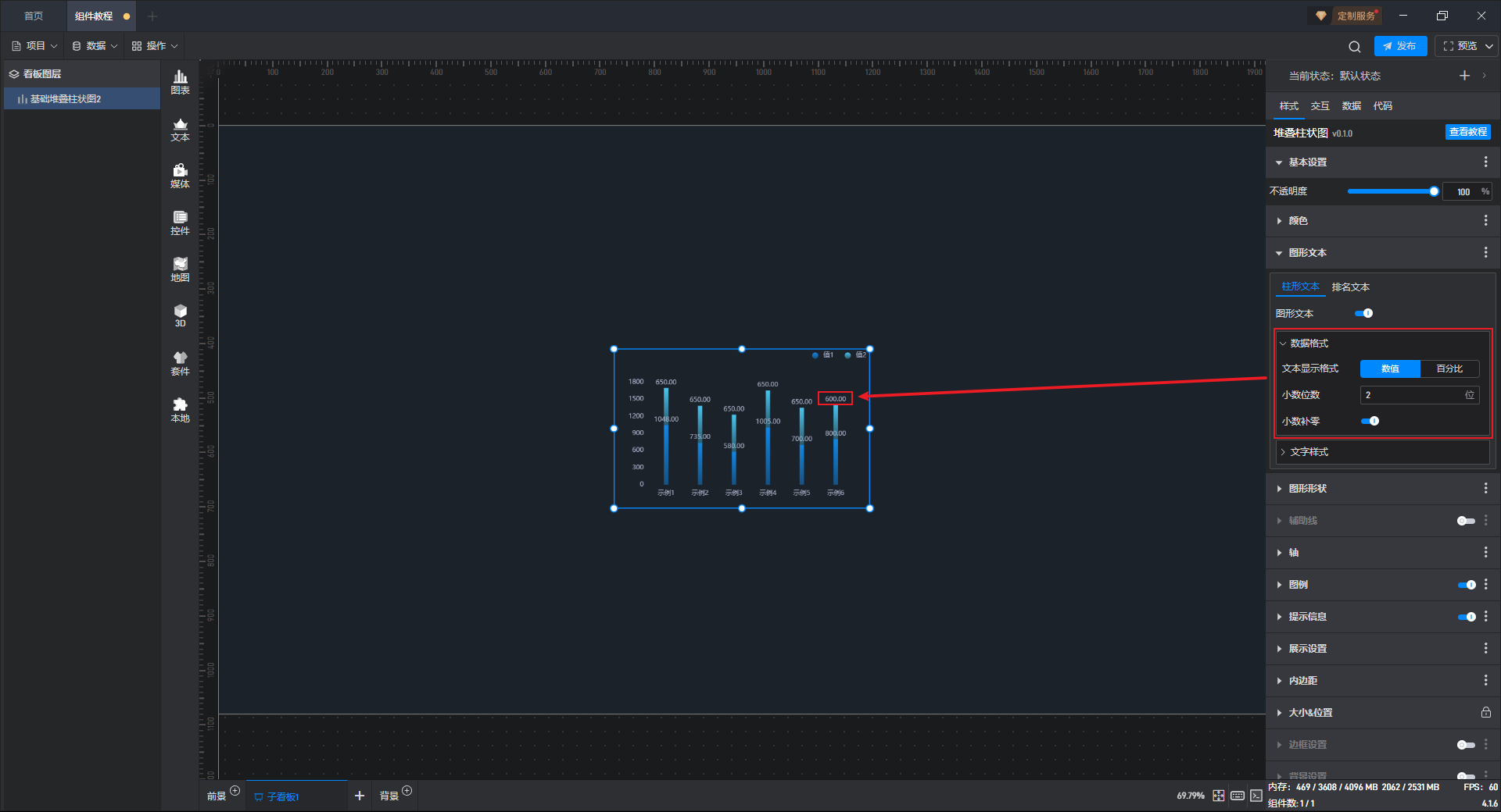 基础堆叠柱状图 2 开启2 位小数补零,如下图所示: