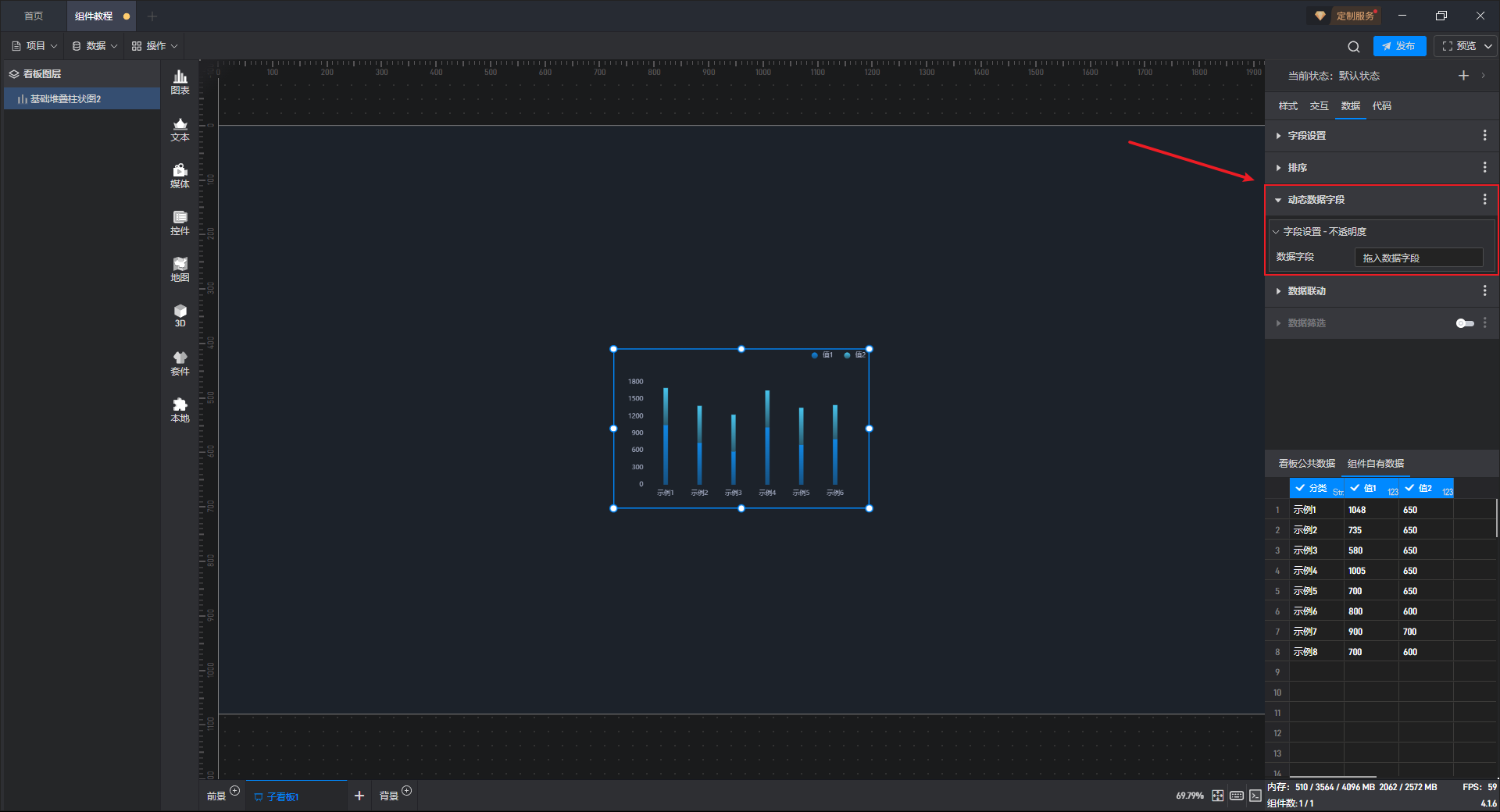 单击选中组件,在右侧“数据”设置窗口中,可以看到组件已经设置好了数据字段,且数据字段来自于“组件自有数据”。