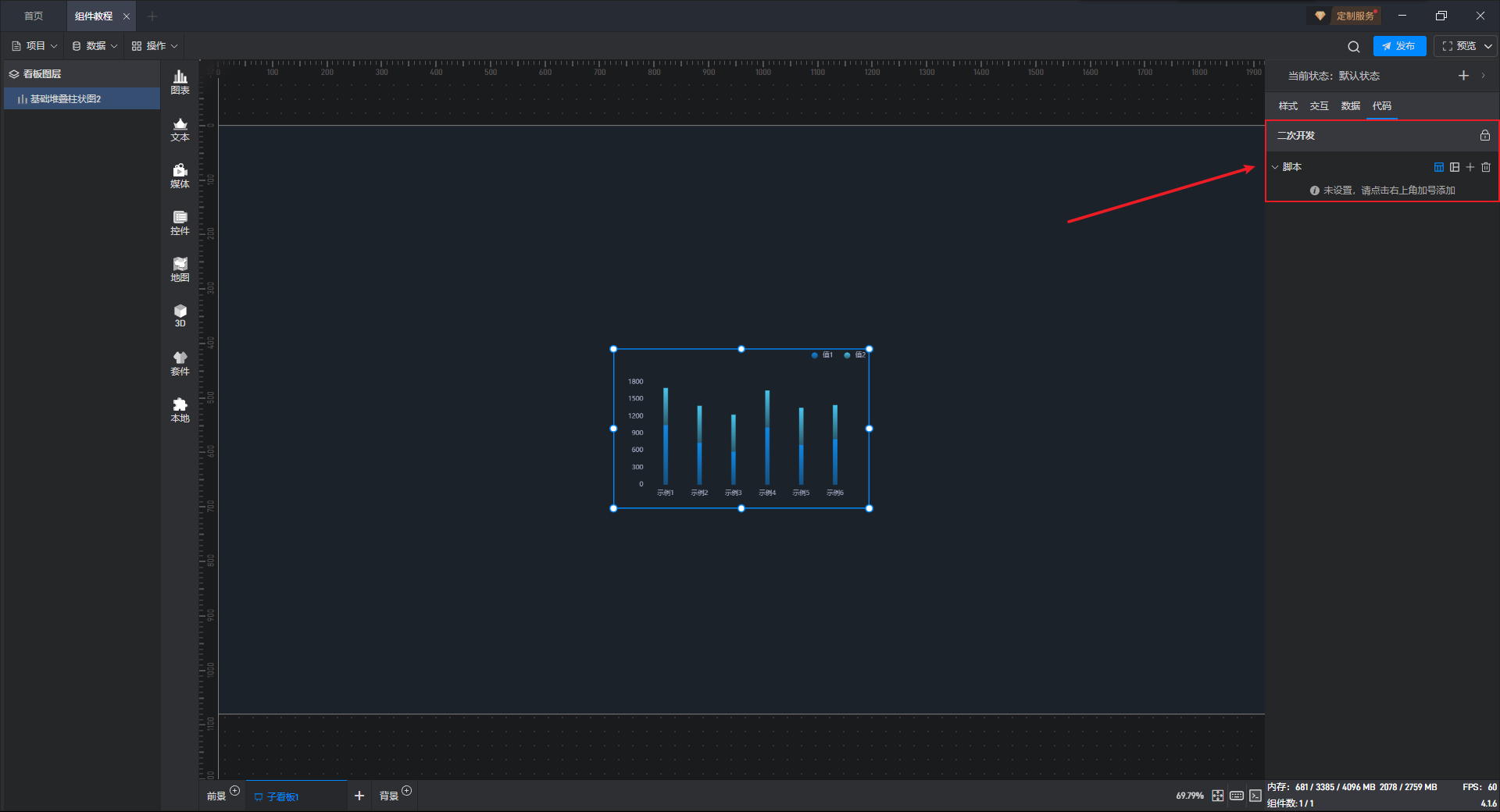 点击选中组件,在右侧“代码”设置窗口中可以对组件进行二次开发设置。