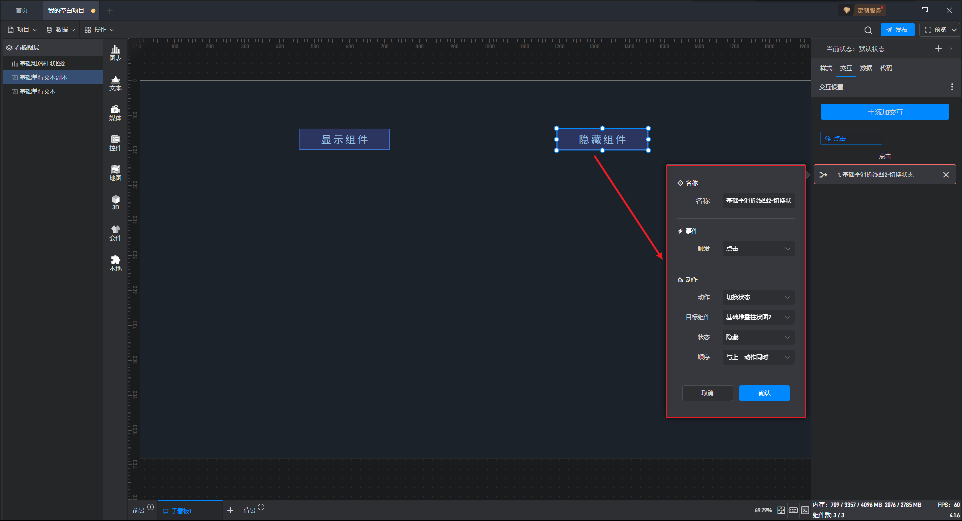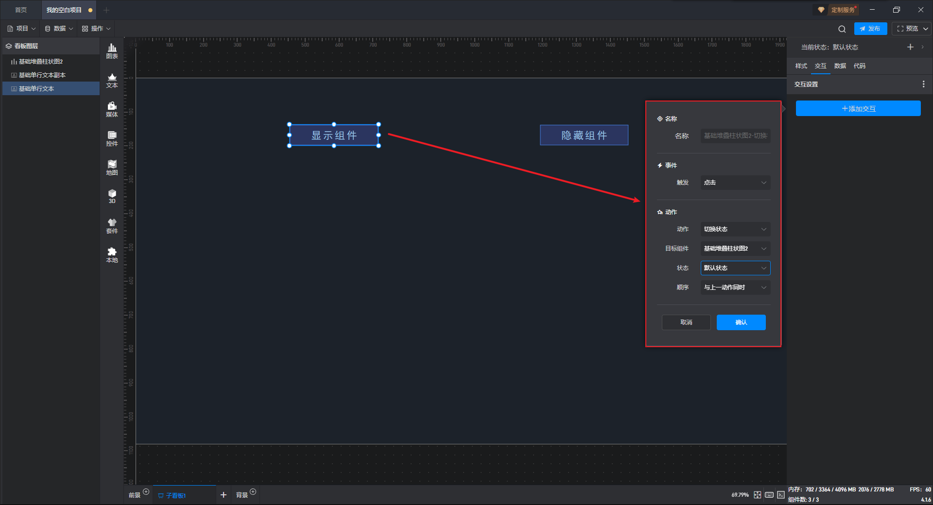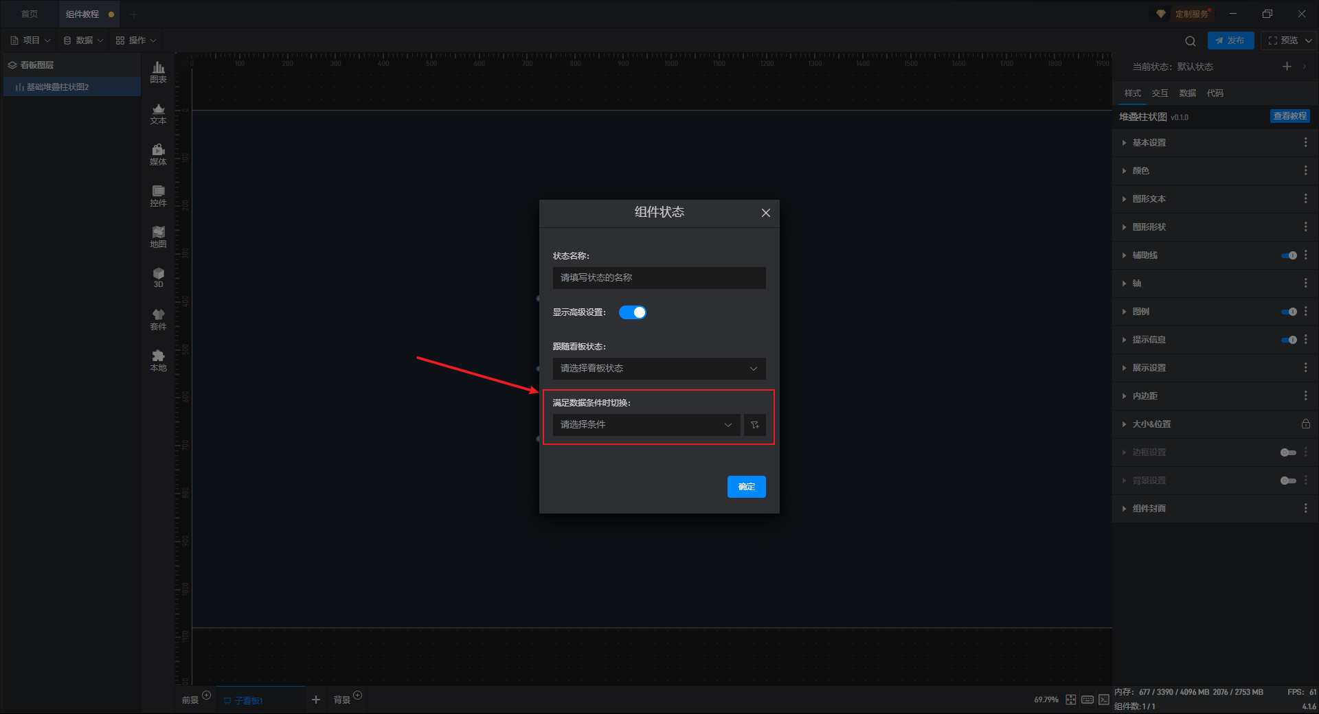 多状态主要用于通过数据条件或是点击交互(通常是点击其他组件来触发本组件的状态切换)来切换组件设置项的场景,这里的设置项包括组件的样式、交互、数据和代码。