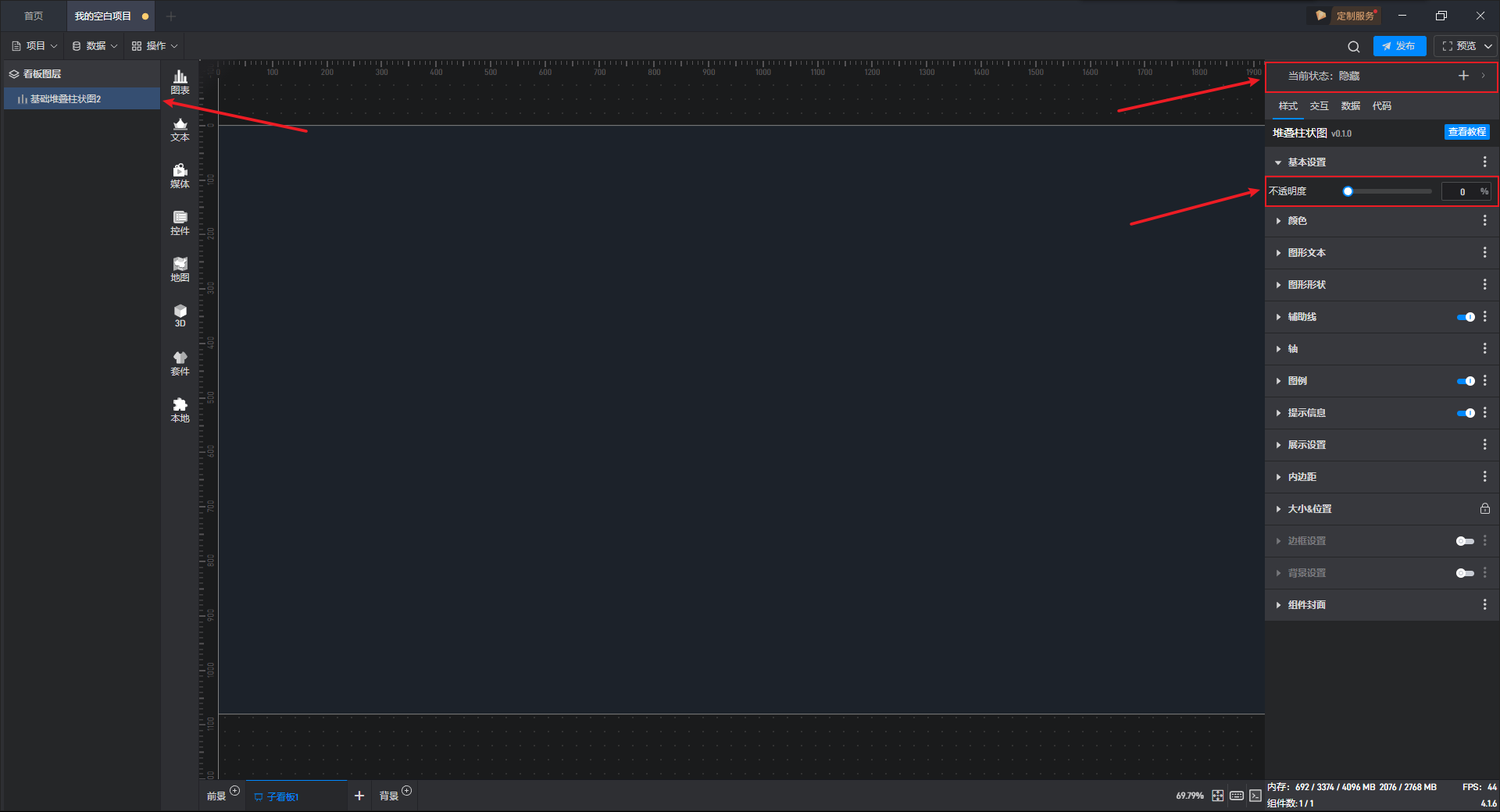 添加一个数值为“0”的数据到数据字段中,可以看到通过动态数据字段将不透明度的数值修改为“0”,从而使组件隐藏。