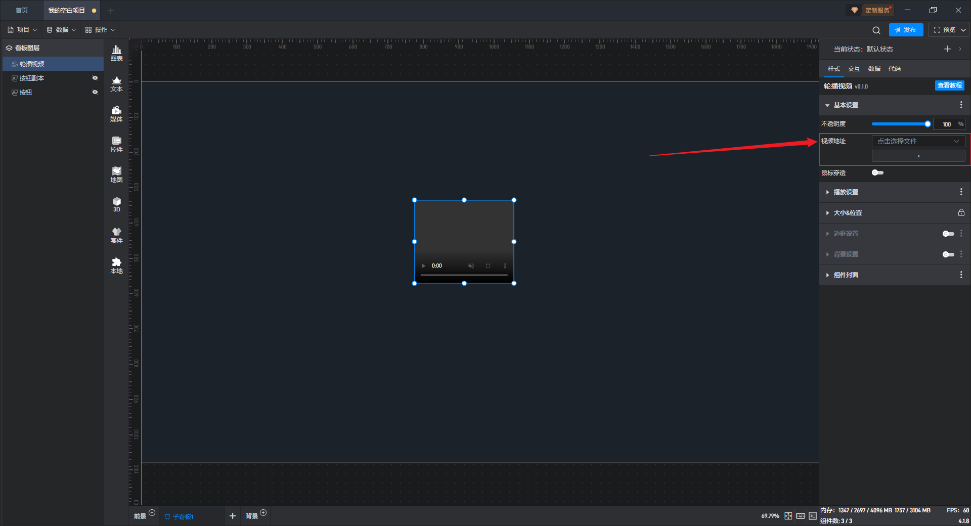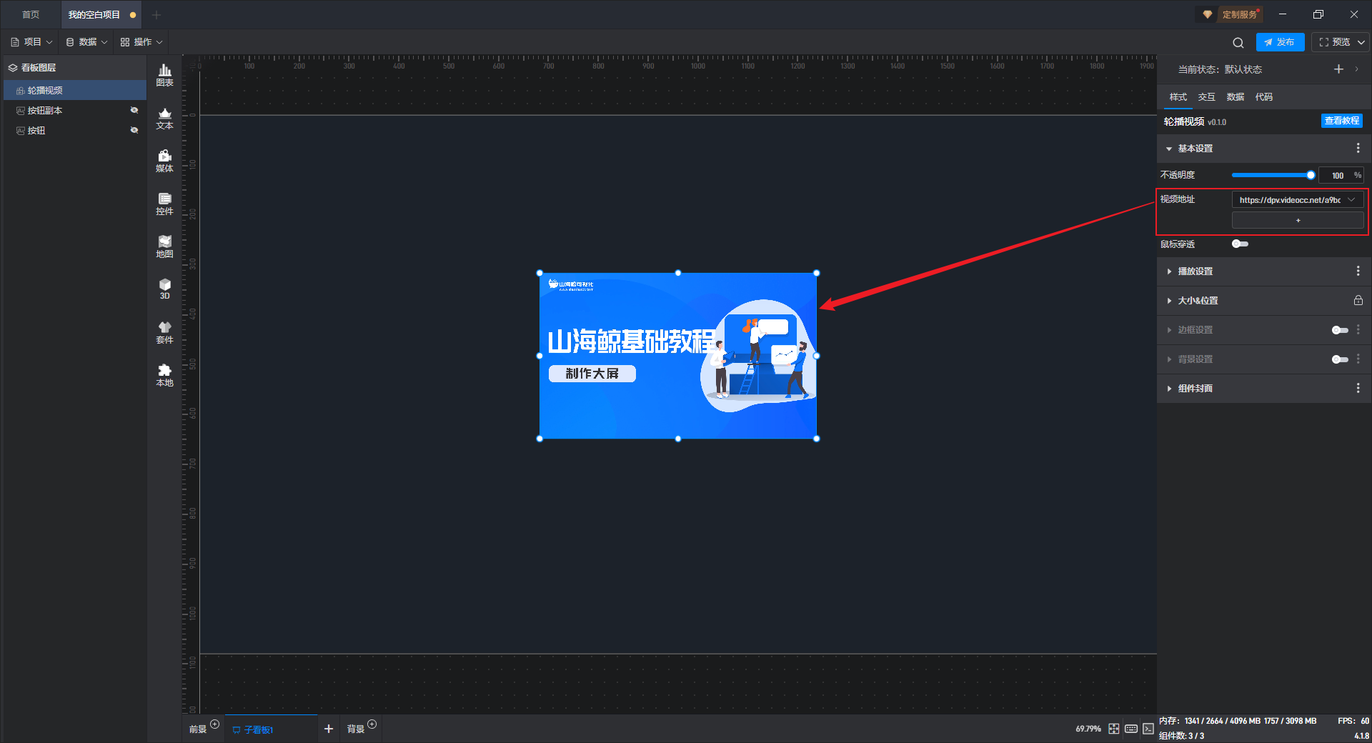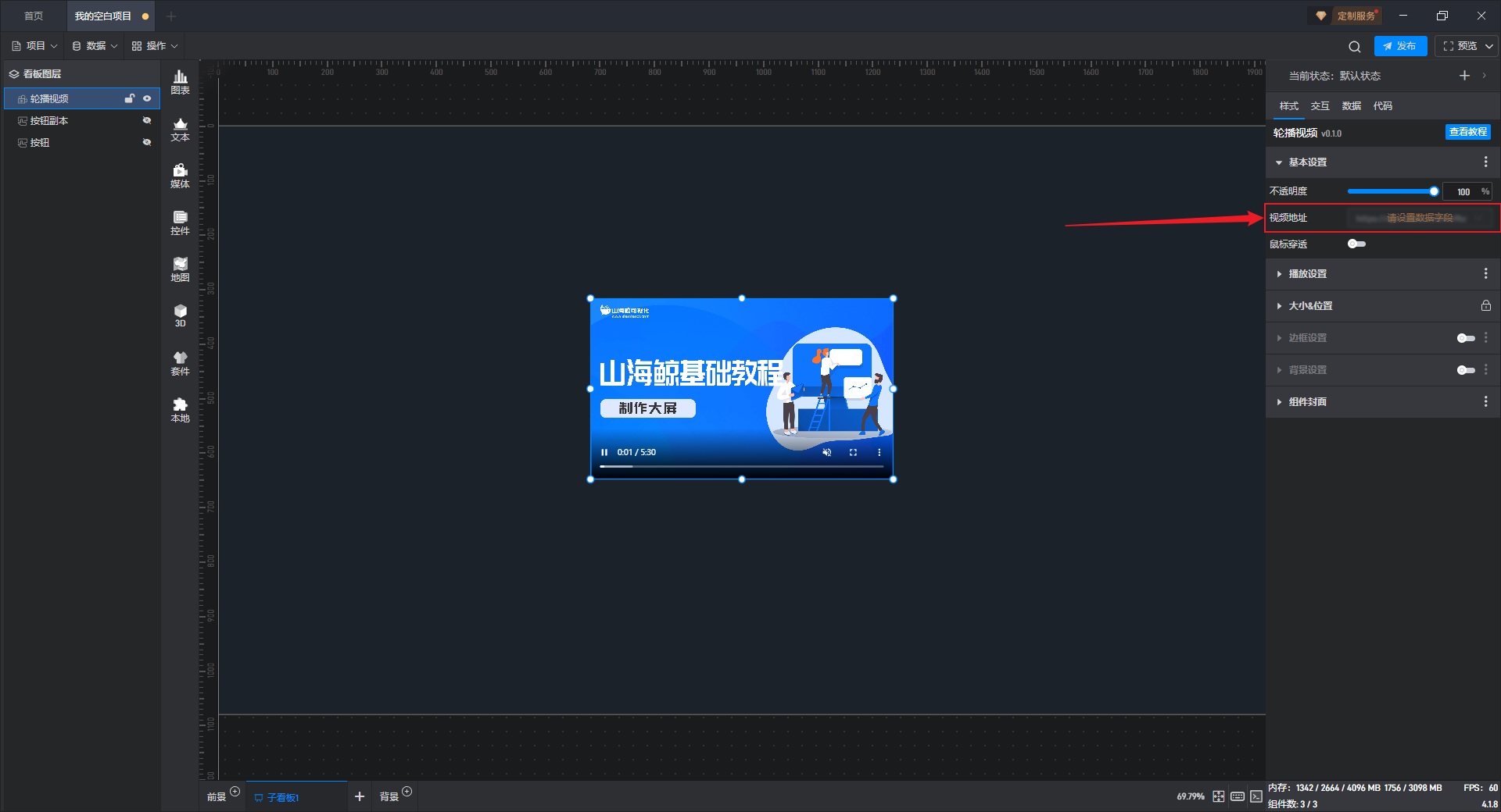 点击选中组件,在右侧样式“基本设置”项分组中,可以对“视频地址”进行设置。