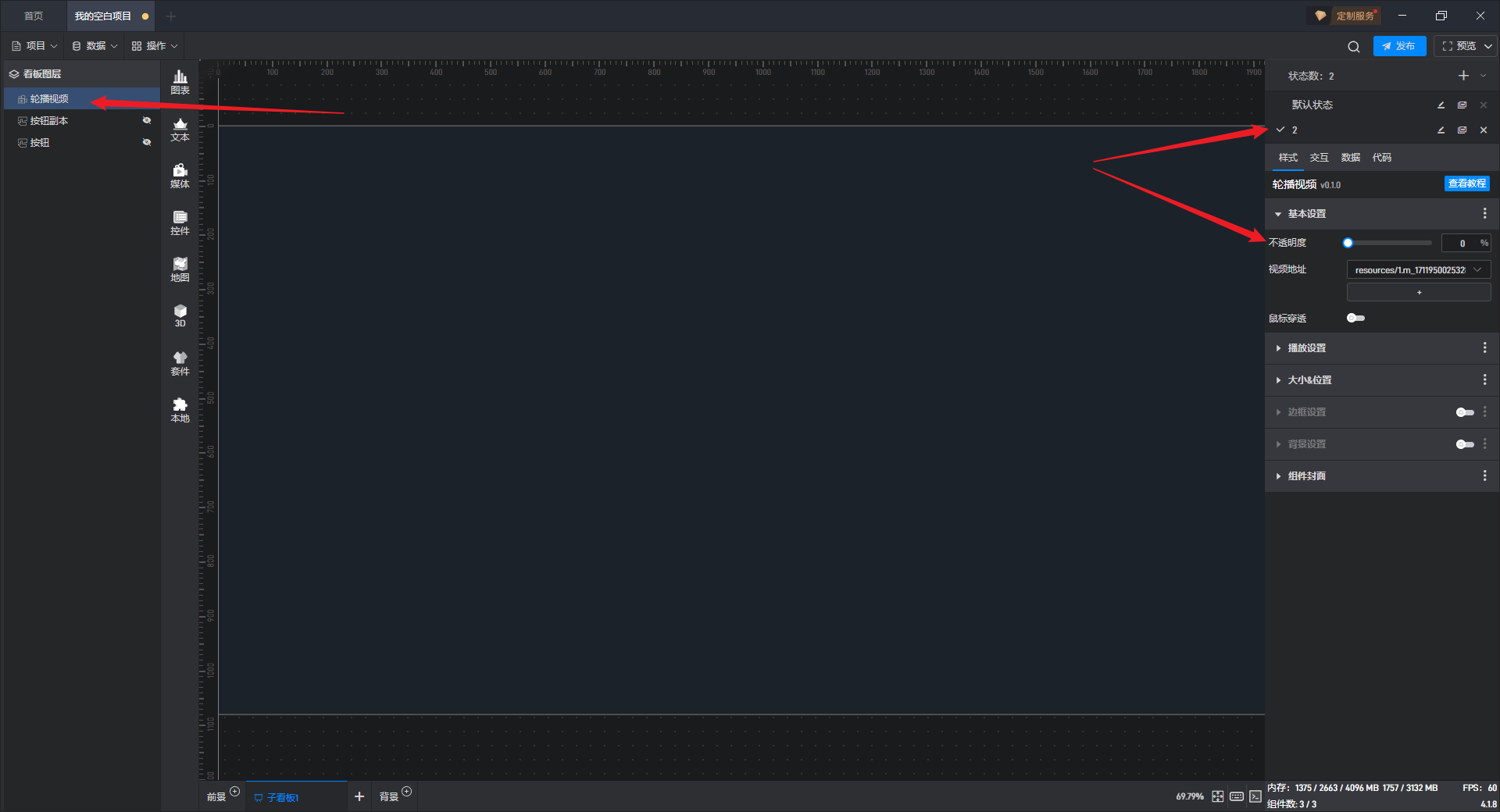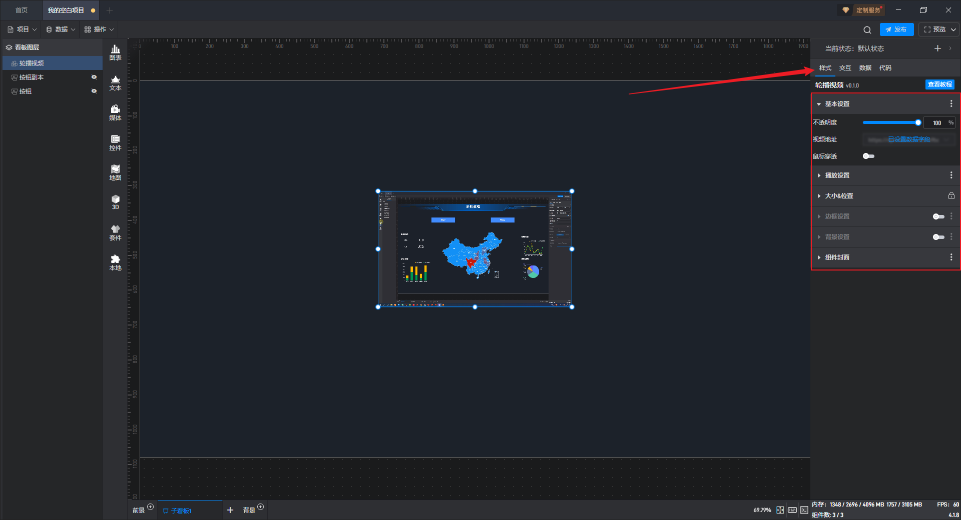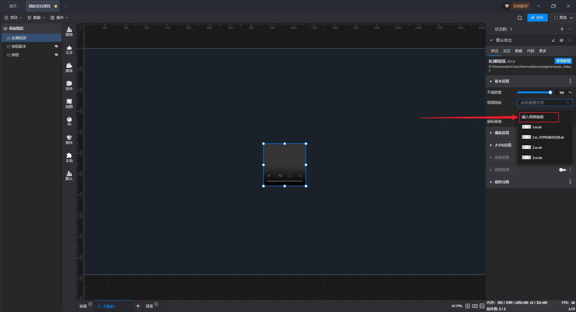 点击选中组件,在右侧样式“基本设置”项分组中,可以对“视频地址”进行设置。