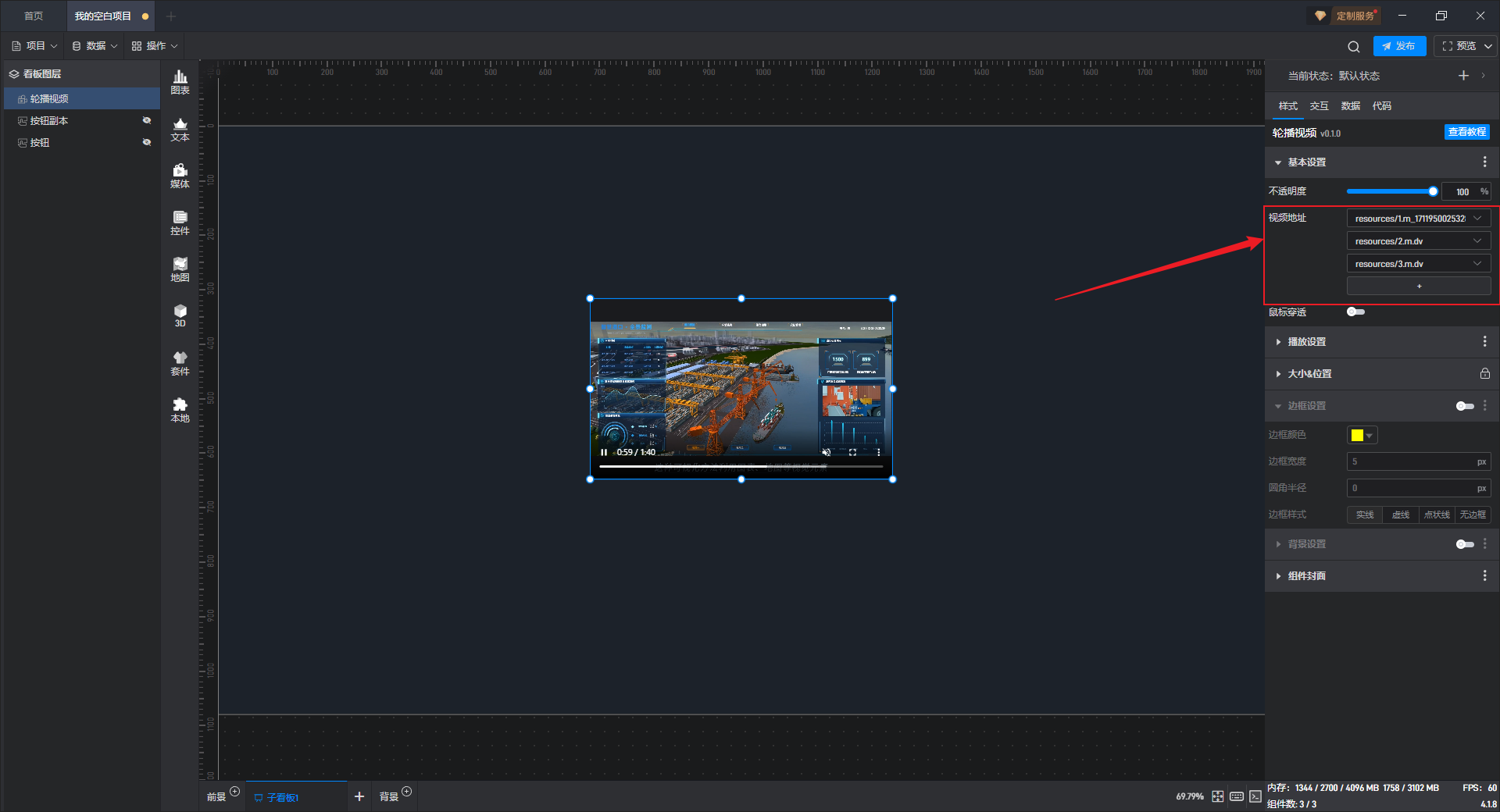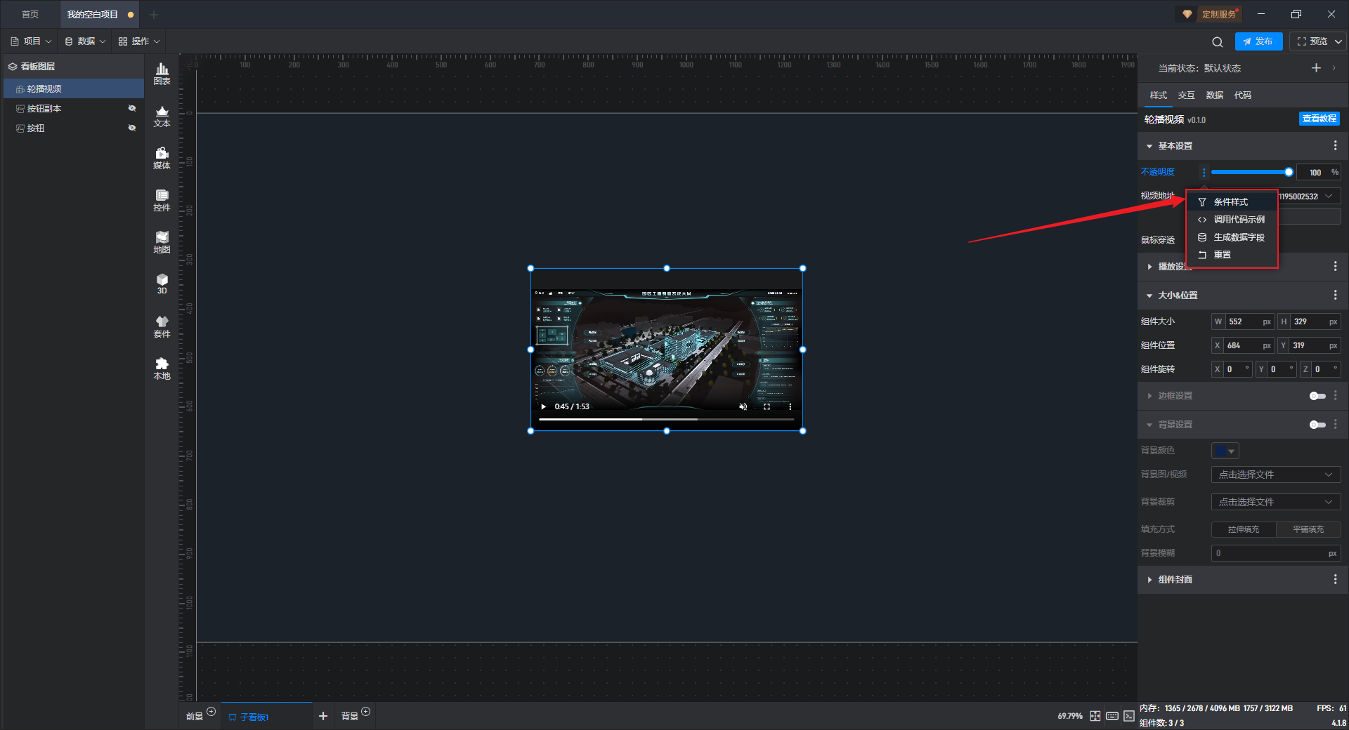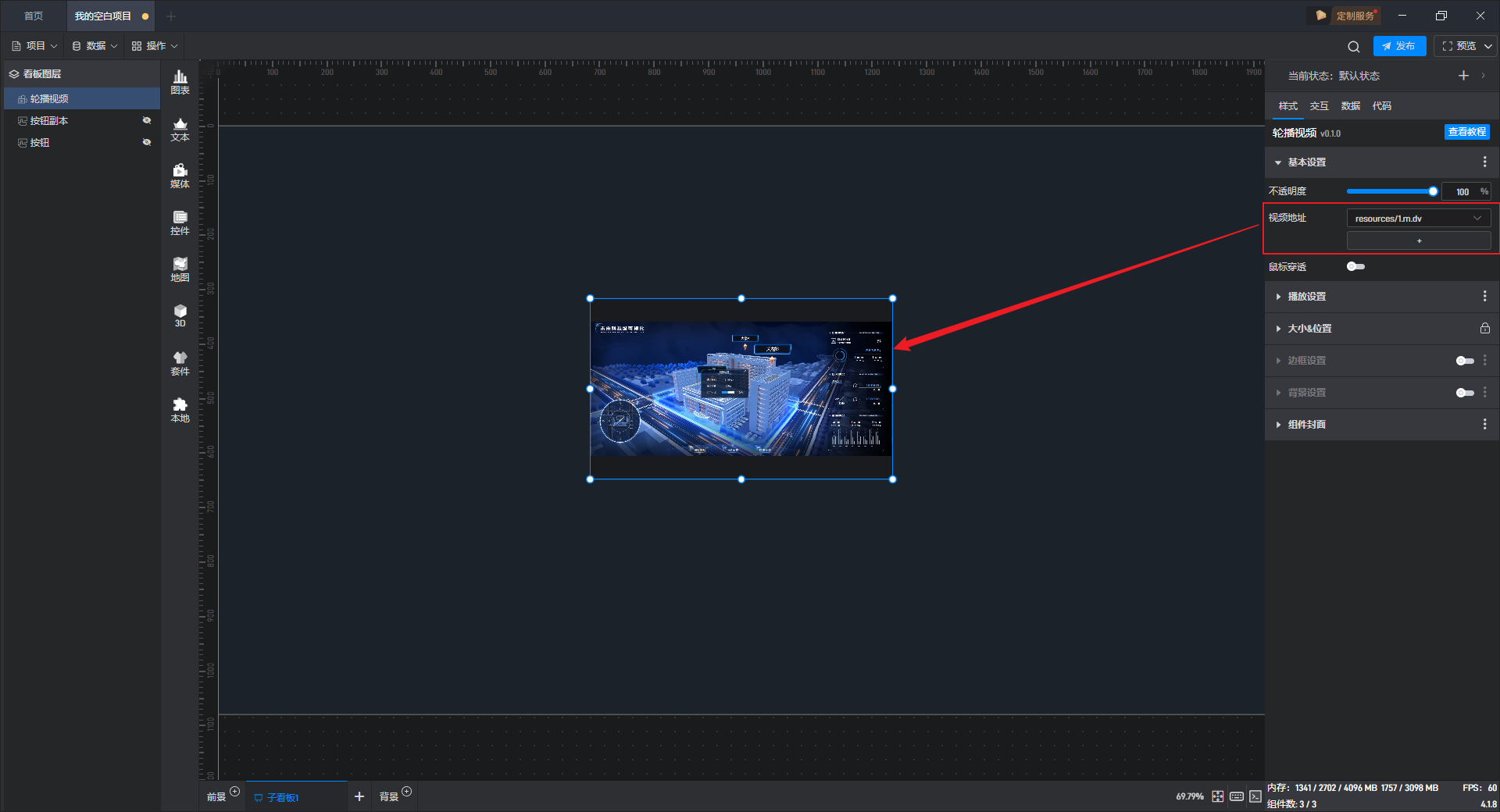 点击选中组件,将鼠标移动到视频地址设置项上,可以看到右侧出现三个点按钮。