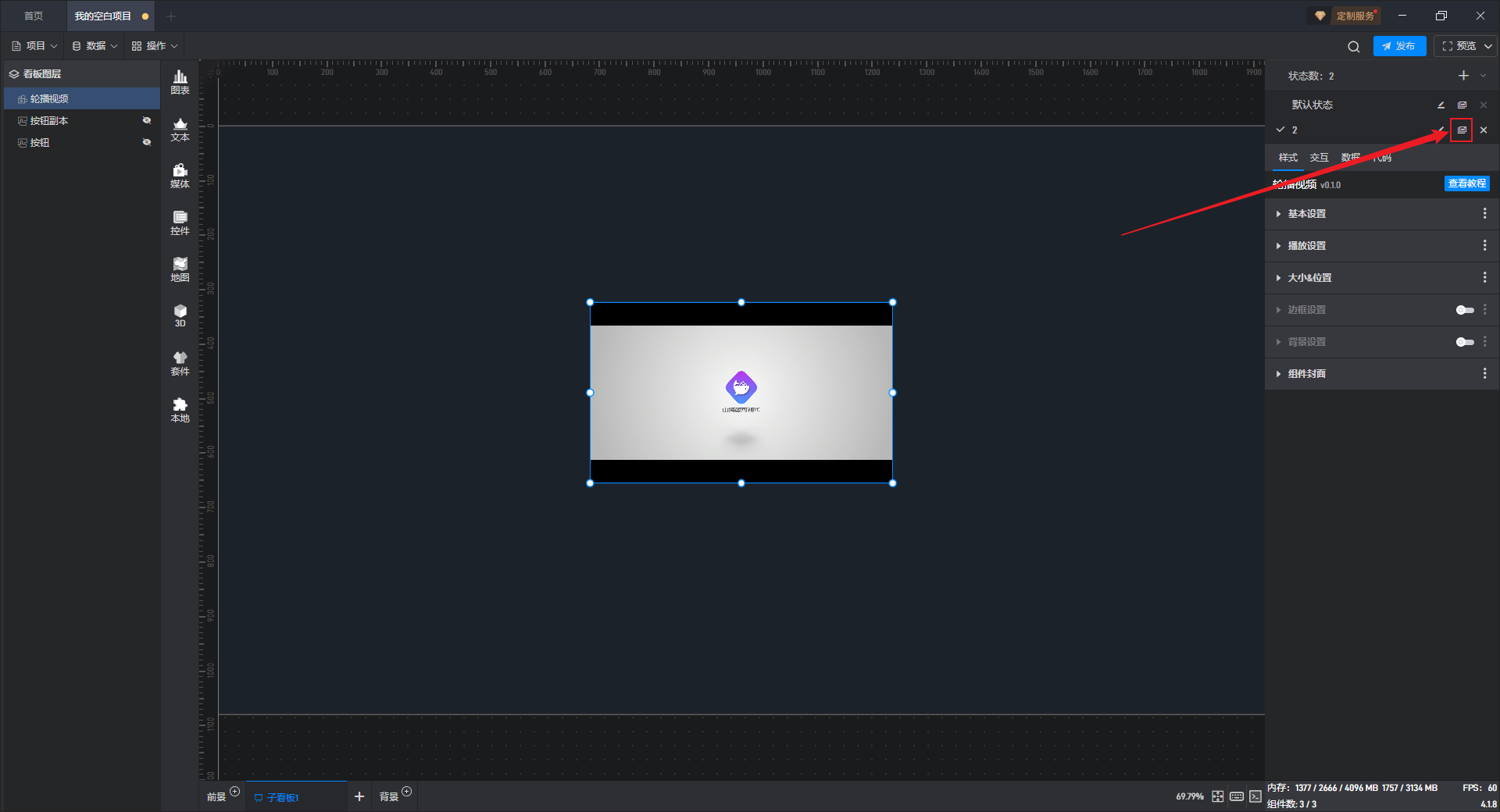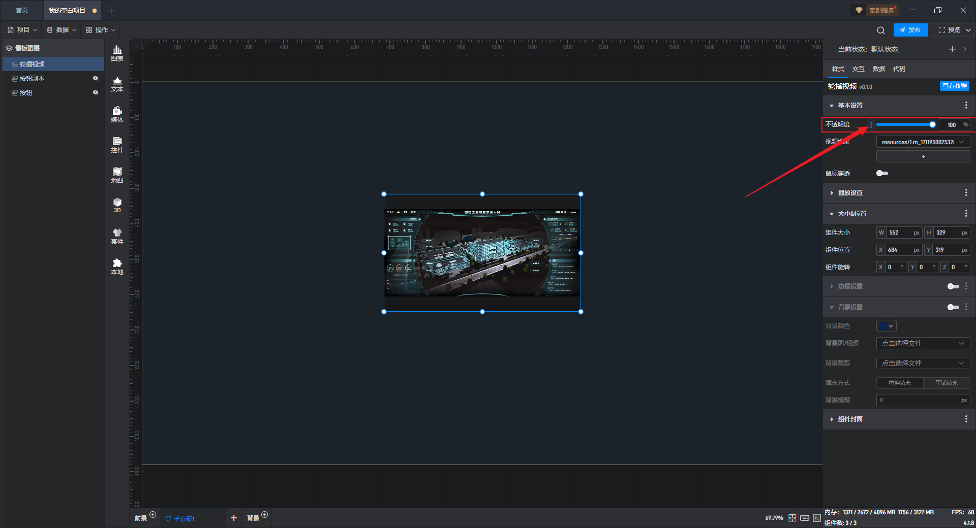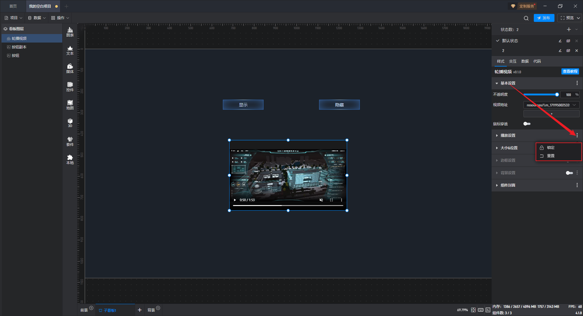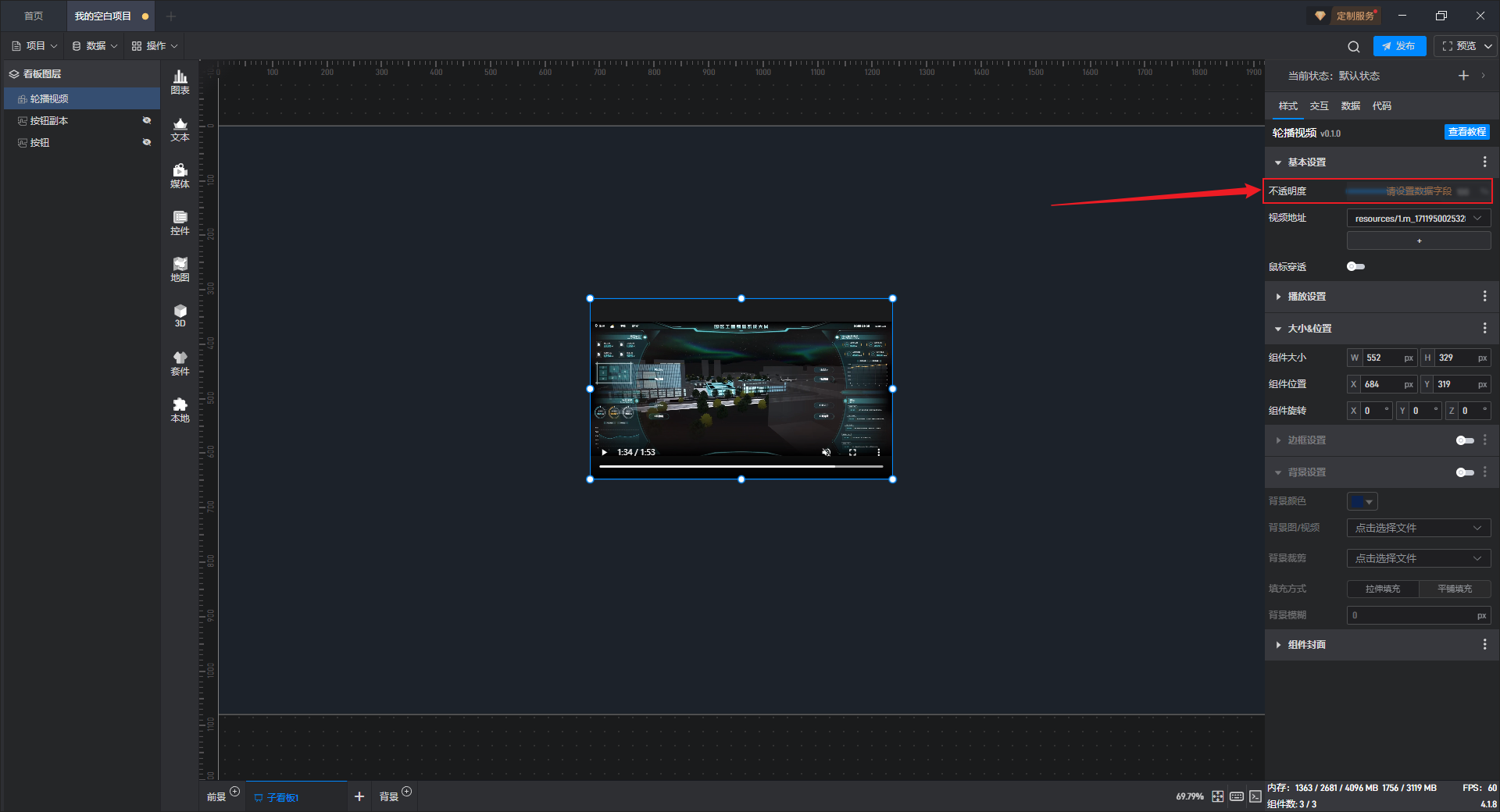 点击选中组件,将鼠标移动到视频地址设置项上,可以看到右侧出现三个点按钮。
