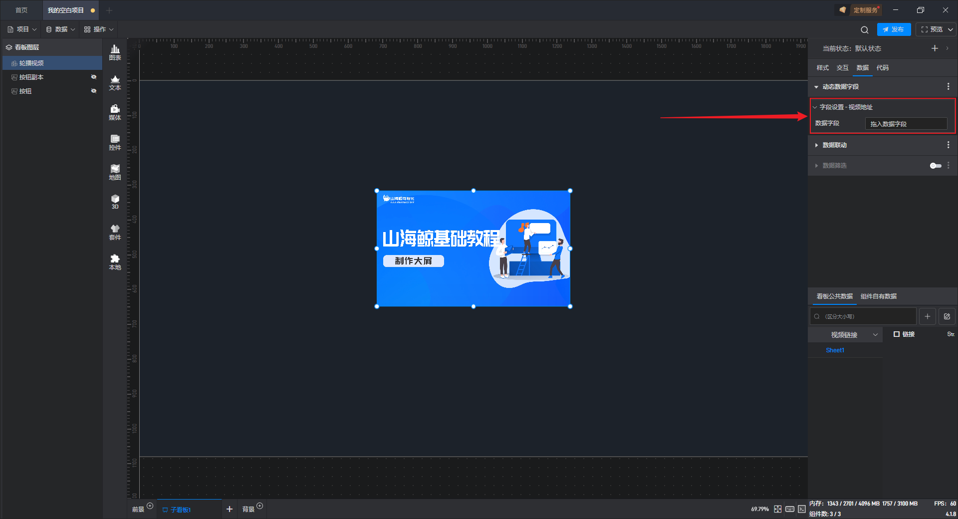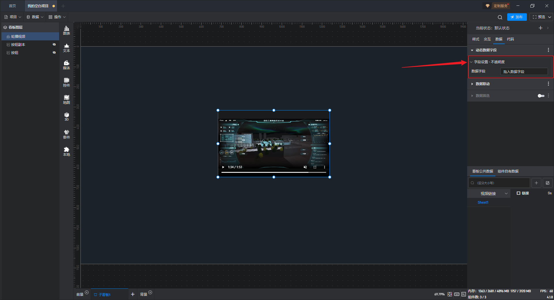 因为视频组件默认没有数据字段,此时我们需要用到“动态数据字段”的功能,这个功能是针对设置项生成一个关联的数据字段,从而可以通过数据字段来对设置项的内容进行控制。