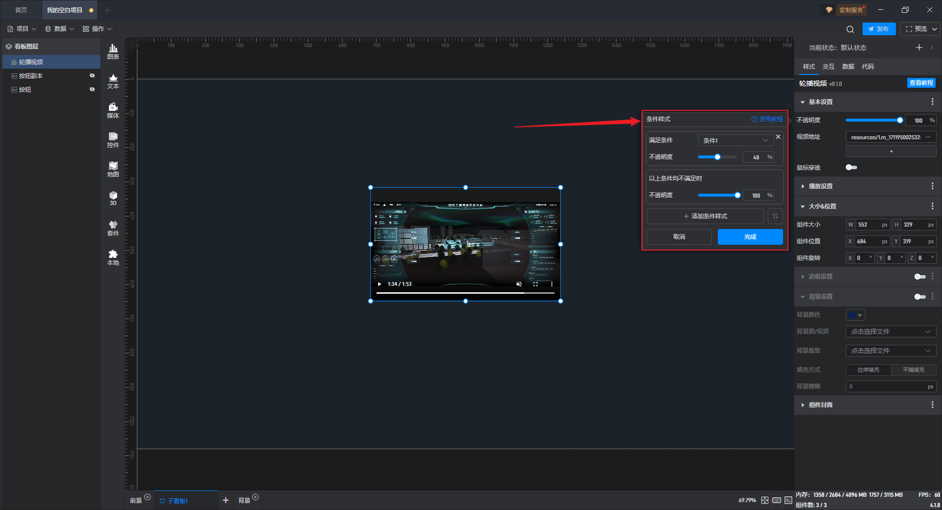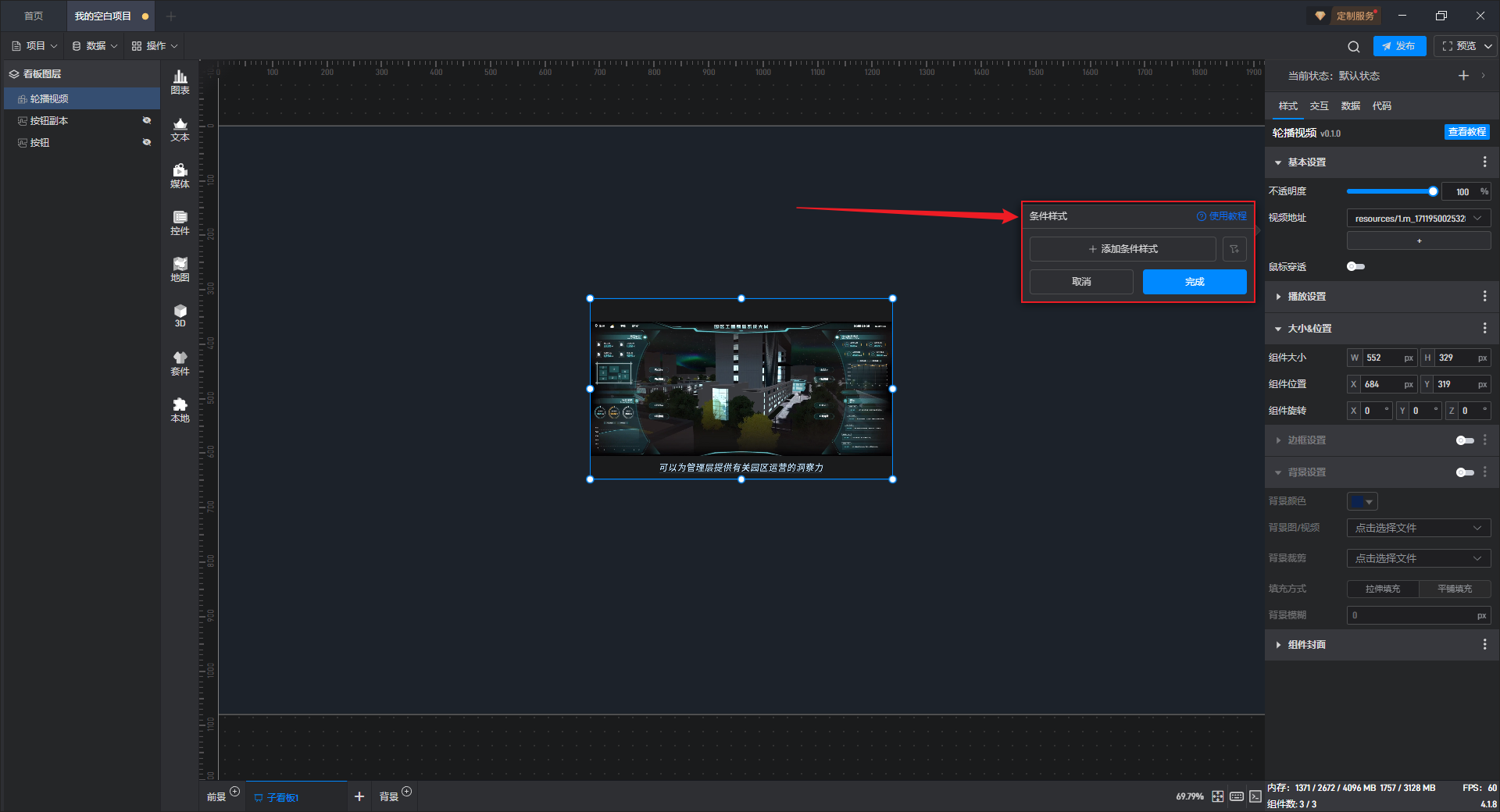 有一些设置项的条件设置方式直接显示在设置项中,这种就可以直接在外面设置,但轮播视频组件的条件样式只能通过方式 1 进行设置。