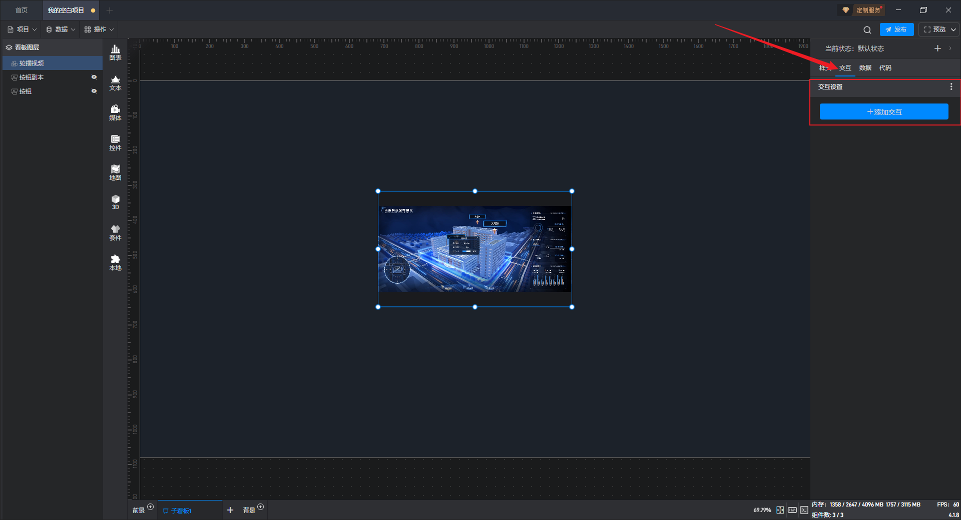 点击选中组件,在右侧“交互”设置窗口中可以对当前组件的交互进行添加和删除。
